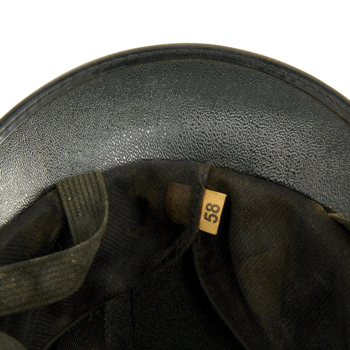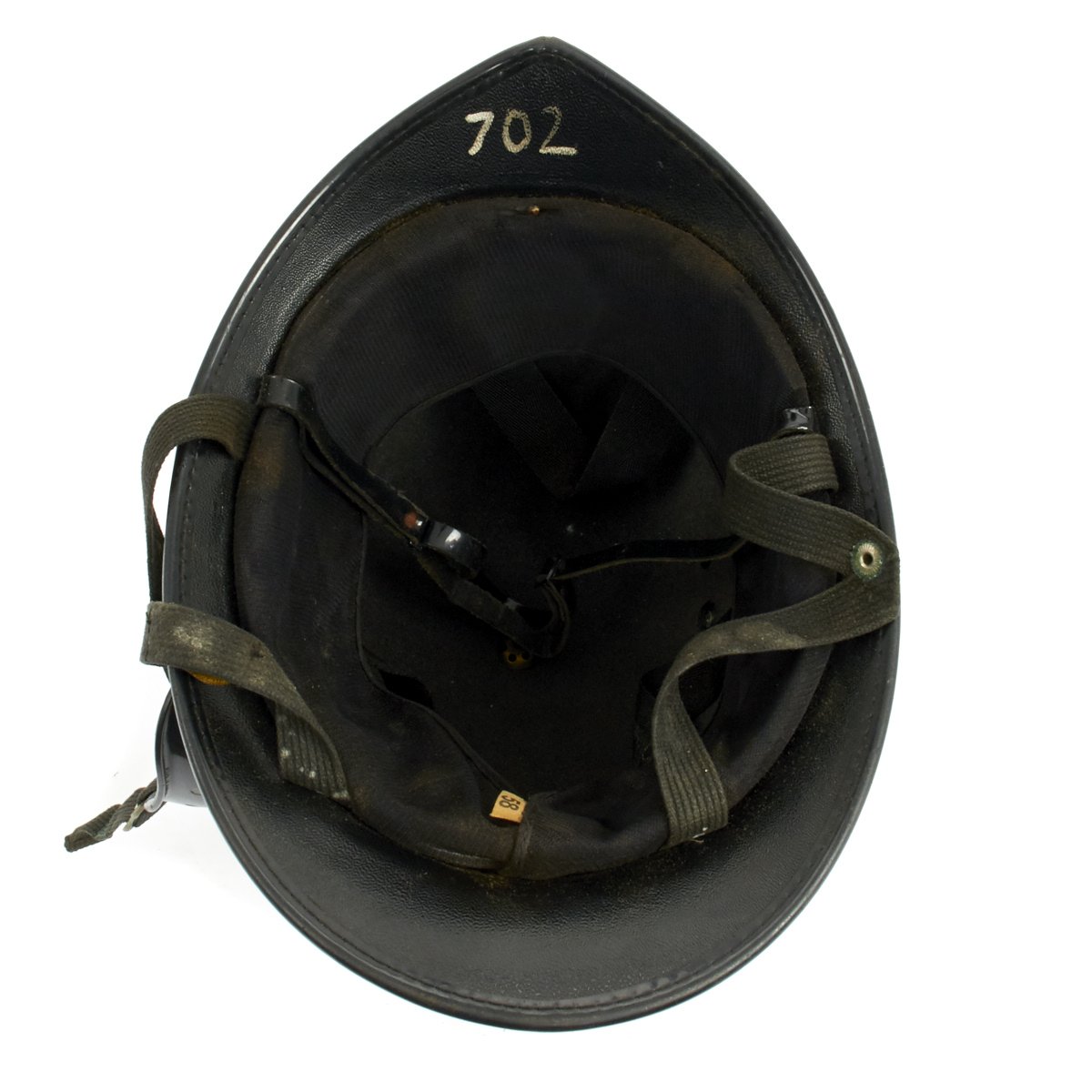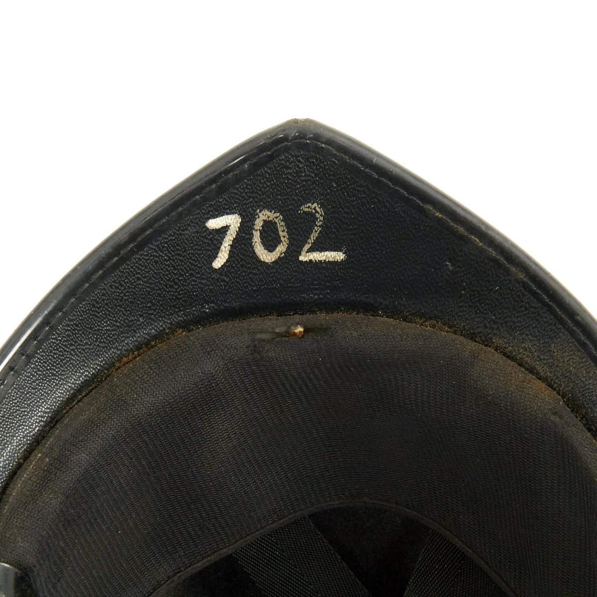 Helmet is Size 58 and marked is rigged with it's Riot Gear liner with web chin strap, retaining it's Riot Chin "Cup." The Helmet also is fitted with i's everyday patent leather chin strap as well. One of the straps is marked: