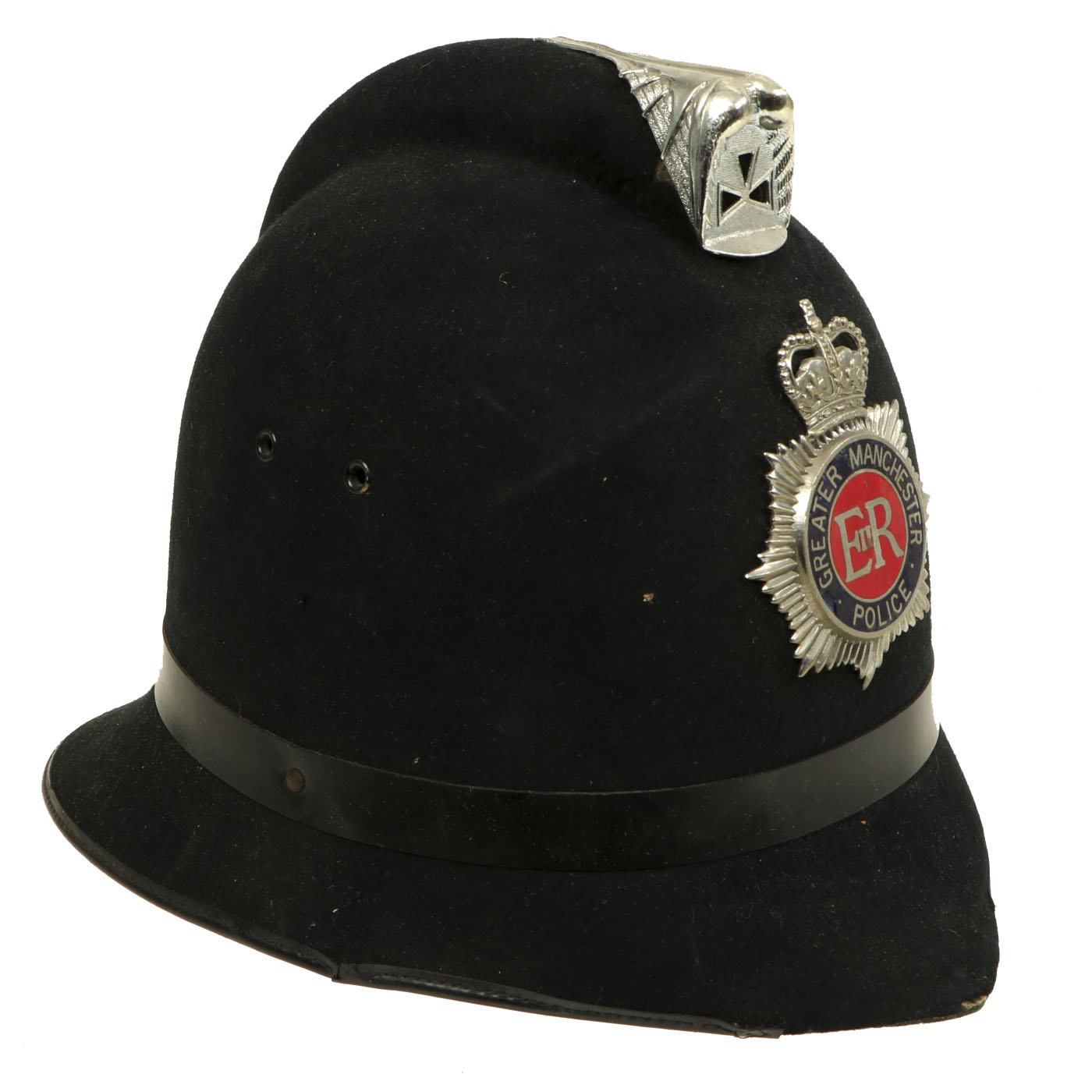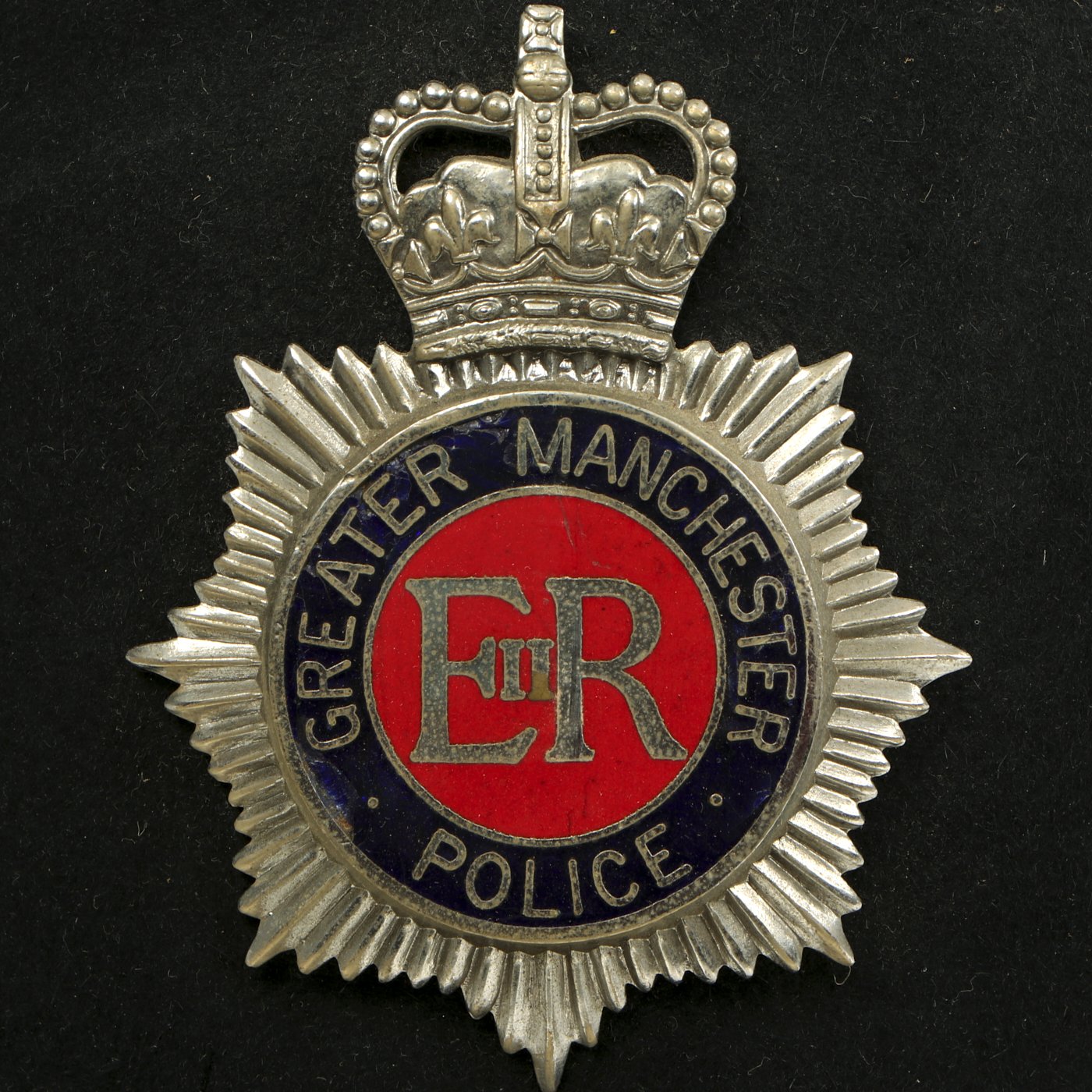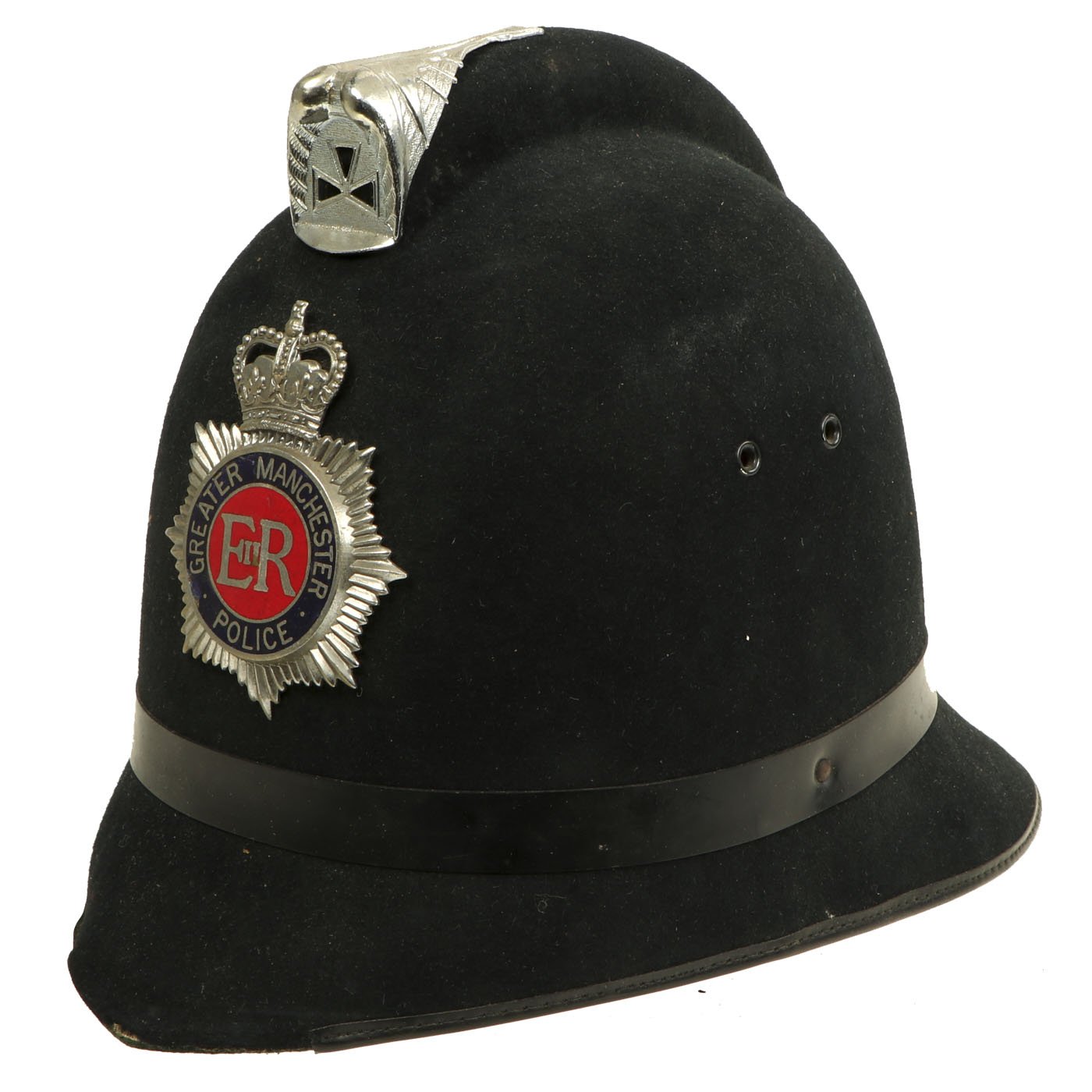 The front Helmet plate has a "Queens's Crown" to top, over a star burst, with GREATER MANCHESTER / POLICE in a blue enameled circle. In the center of the plate is E II R inside a red circle, the royal cypher of Queen Elizabeth II. The "Queen's Crown" further indicates issue sometime after 1952, when Queen Elizabeth II assumed the throne.