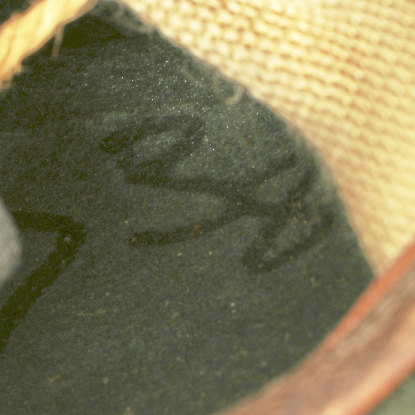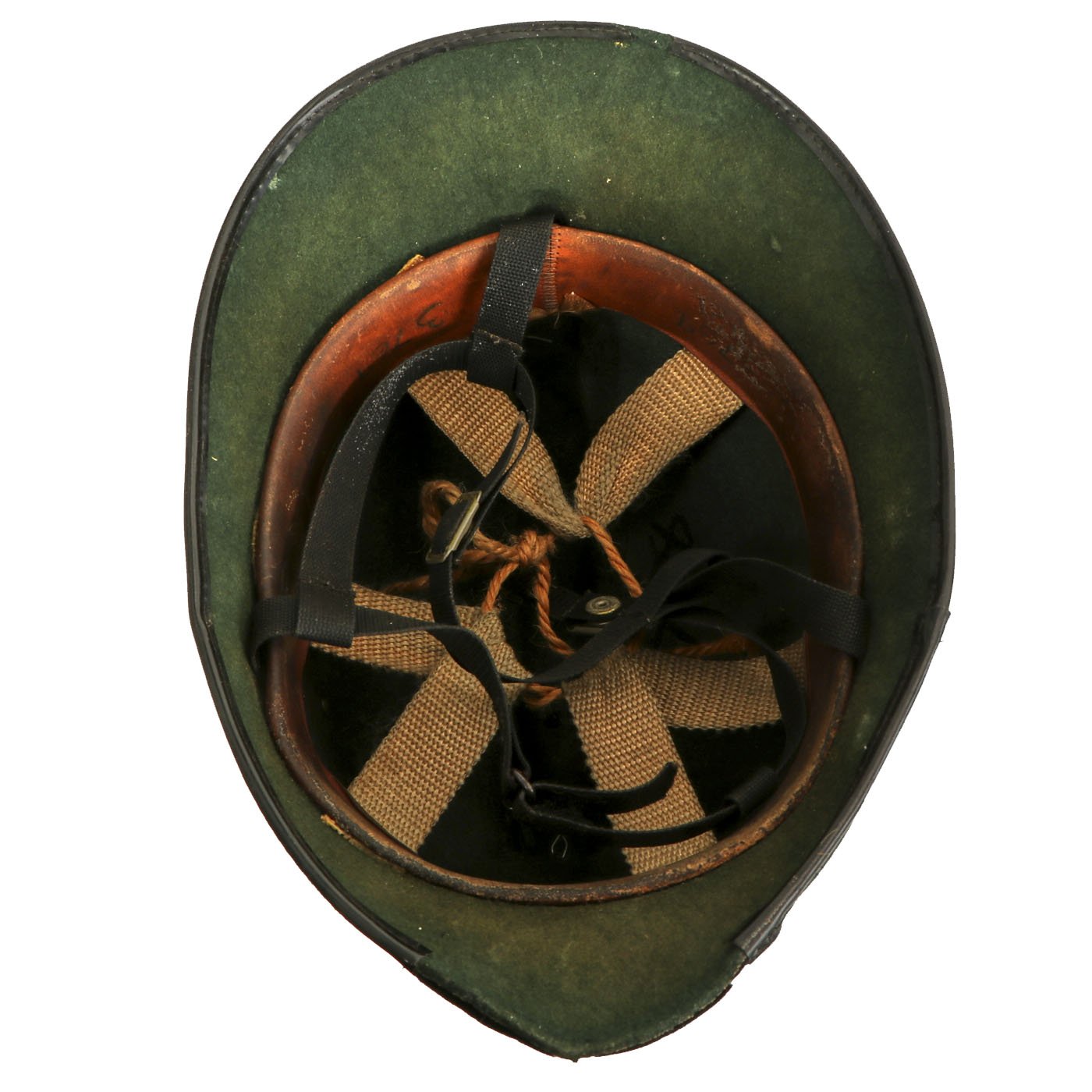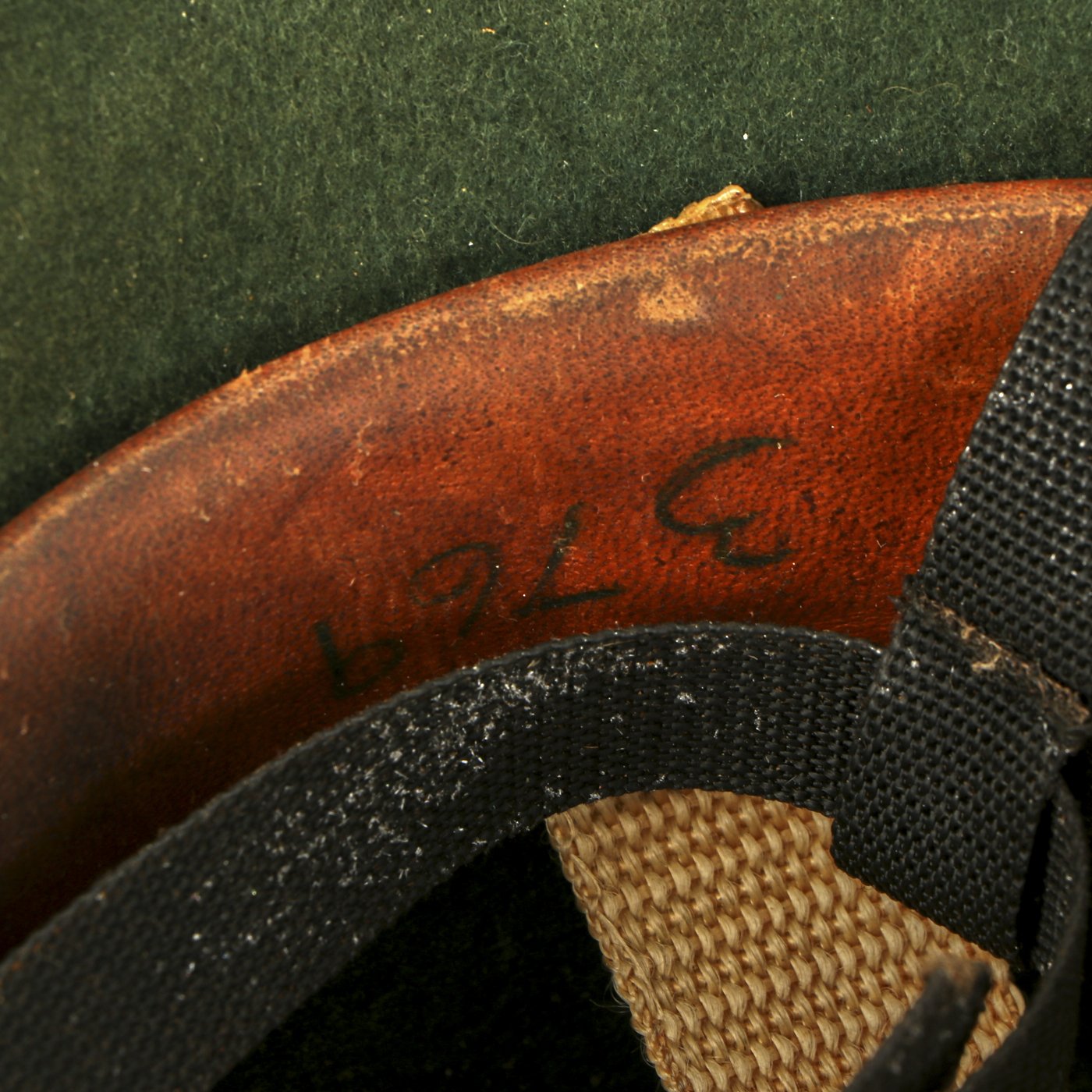 Based on the design, we feel this is probably from the 1970s or 1980s. It is made from pressed stiff green felt, with a dark navy blue felt covering. The interior has a brown leather sweatband marked CHRISTYS' LONDON, and the rigging looks to be made of rayon or nylon. The helmet does not have a dress chin strap, just a fabric one with a sliding buckle, which is in very good condition.