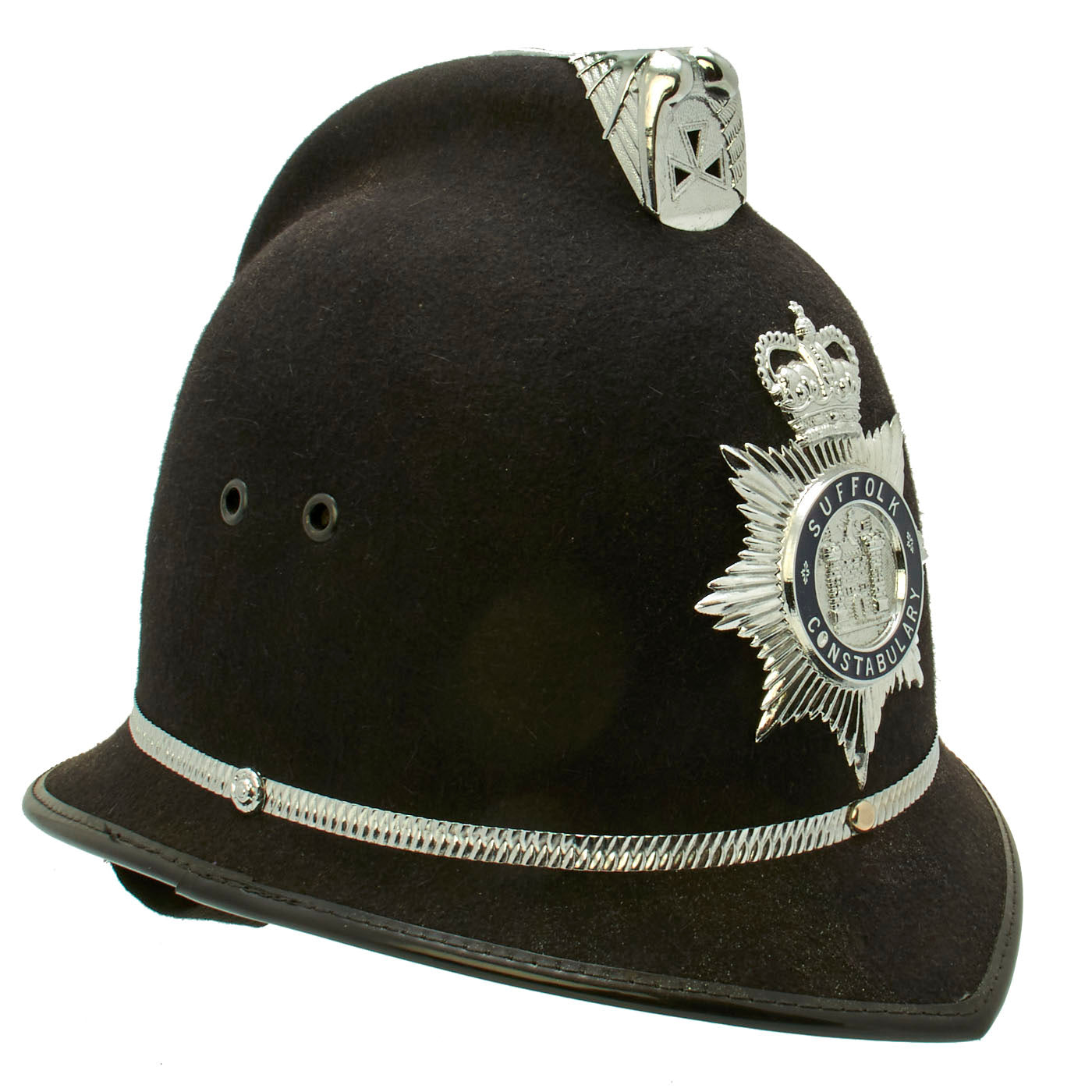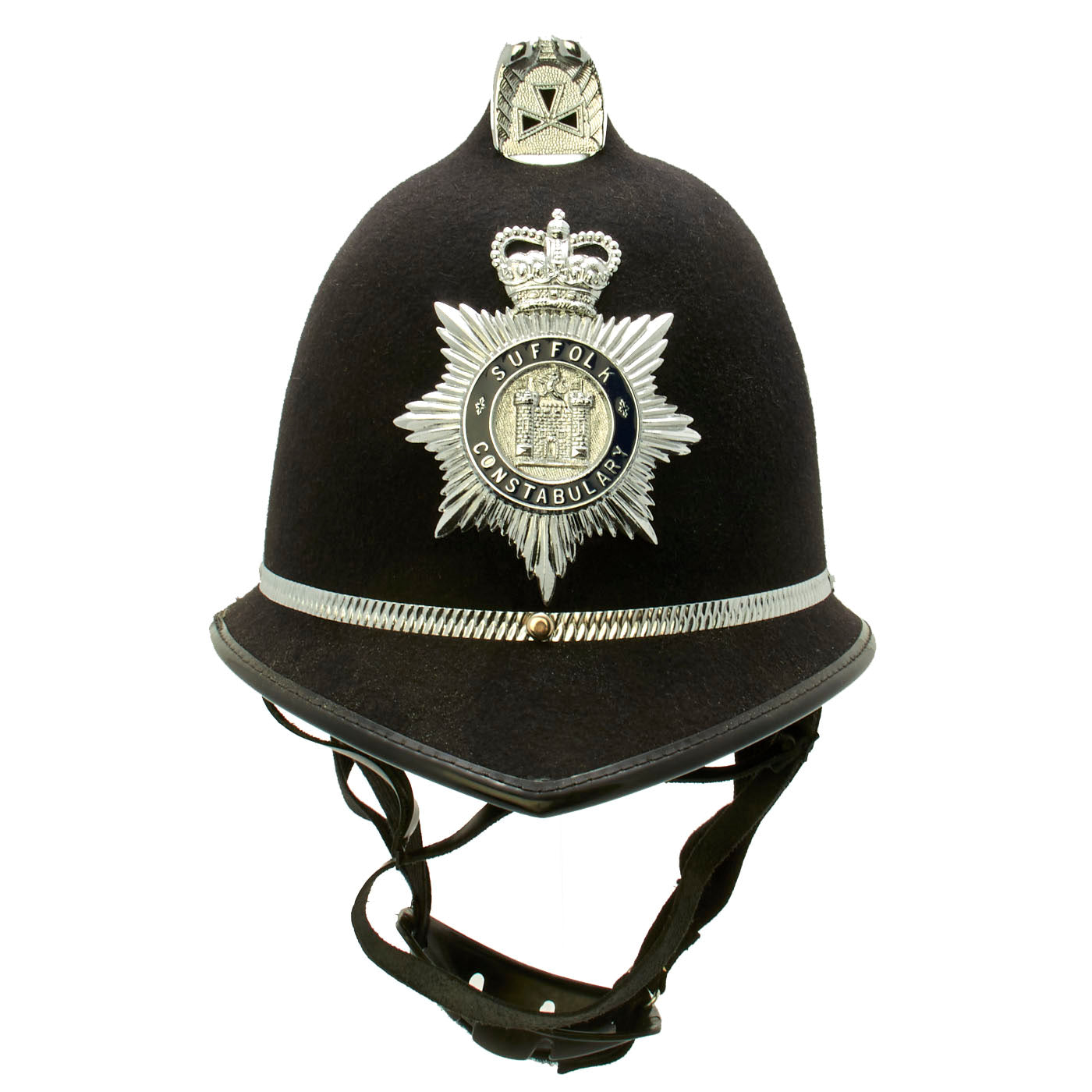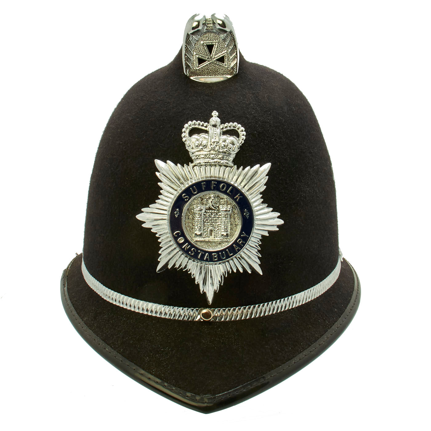 The front Helmet plate has a "Queens's Crown" to top, over a star burst, with SUFFOLK / CONSTABULARY in a blue enameled circle. The "Queen's Crown" indicates issue sometime after 1952, when Queen Elizabeth II assumed the throne. Based on the design and the label, this helmet is dated 1995.