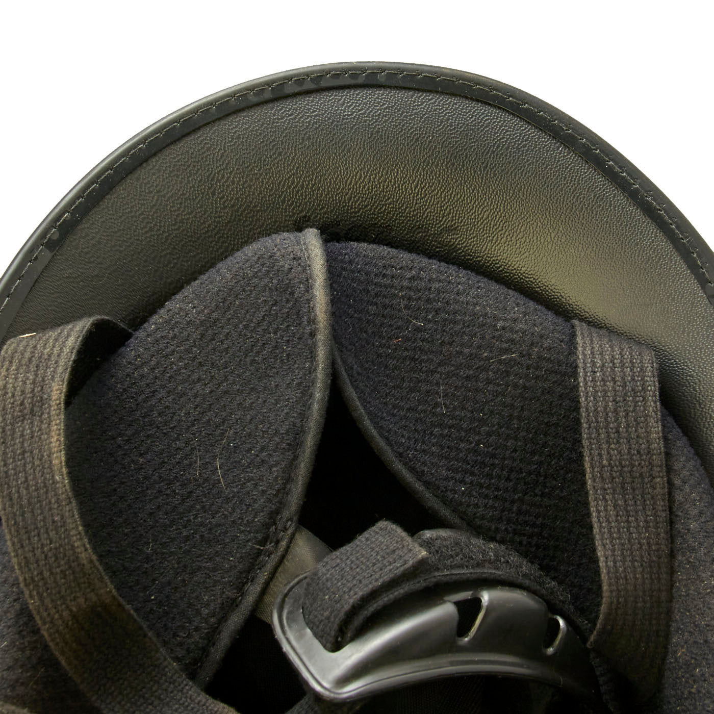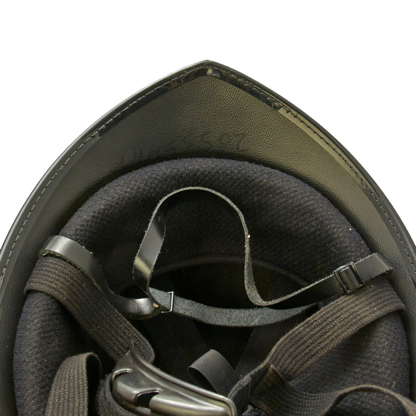 The helmet interior is rigged with its Riot Gear liner with web hook and loop fastener chin strap. The Helmet also is fitted with i's everyday patent leather chin strap as well. The original label is still present, indicating that it is a Custodian Helmet. The suspension indicates it is a size 57 cm. Unfortunately the soft foam of the liner has started to degrade, which has caused it to become very delicate, having partly disintegrated.