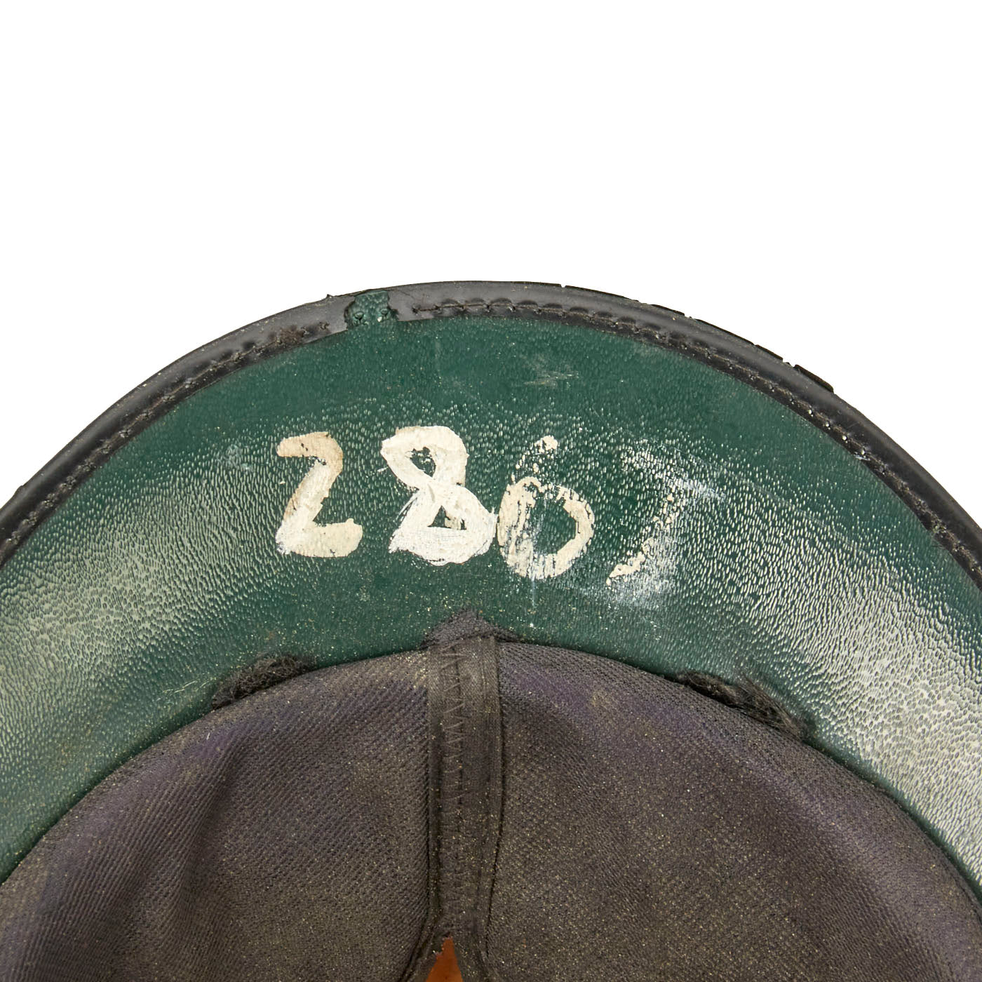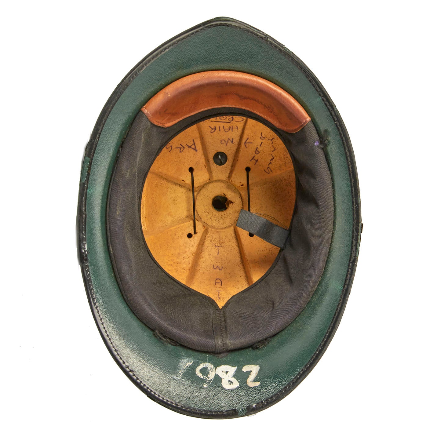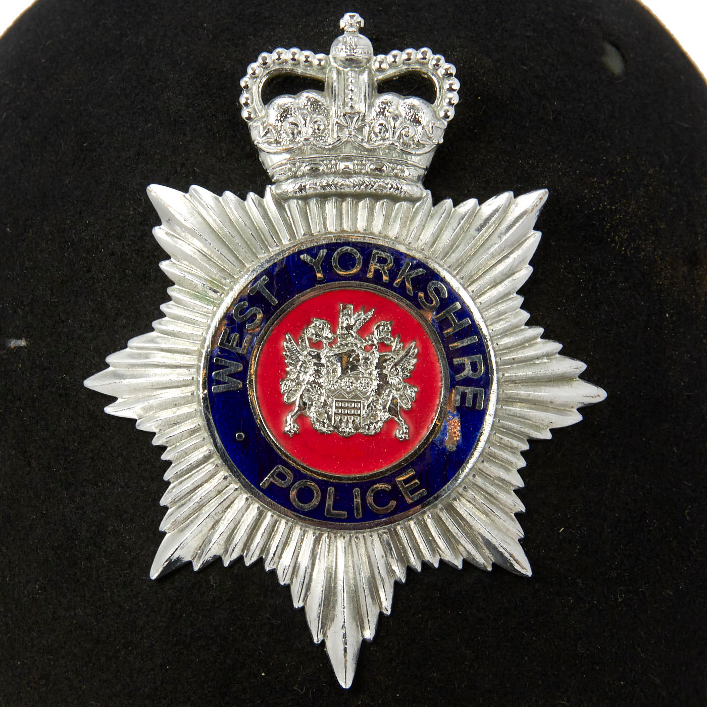 The front Helmet plate has a "Queens's Crown" to top, over a star burst, with WEST YORKSHIRE / POLICE in a blue enameled circle. The "Queen's Crown" indicates issue sometime after 1952, when Queen Elizabeth II assumed the throne. Based on the design, label and the marking on the inside, this helmet dates to around 1982.