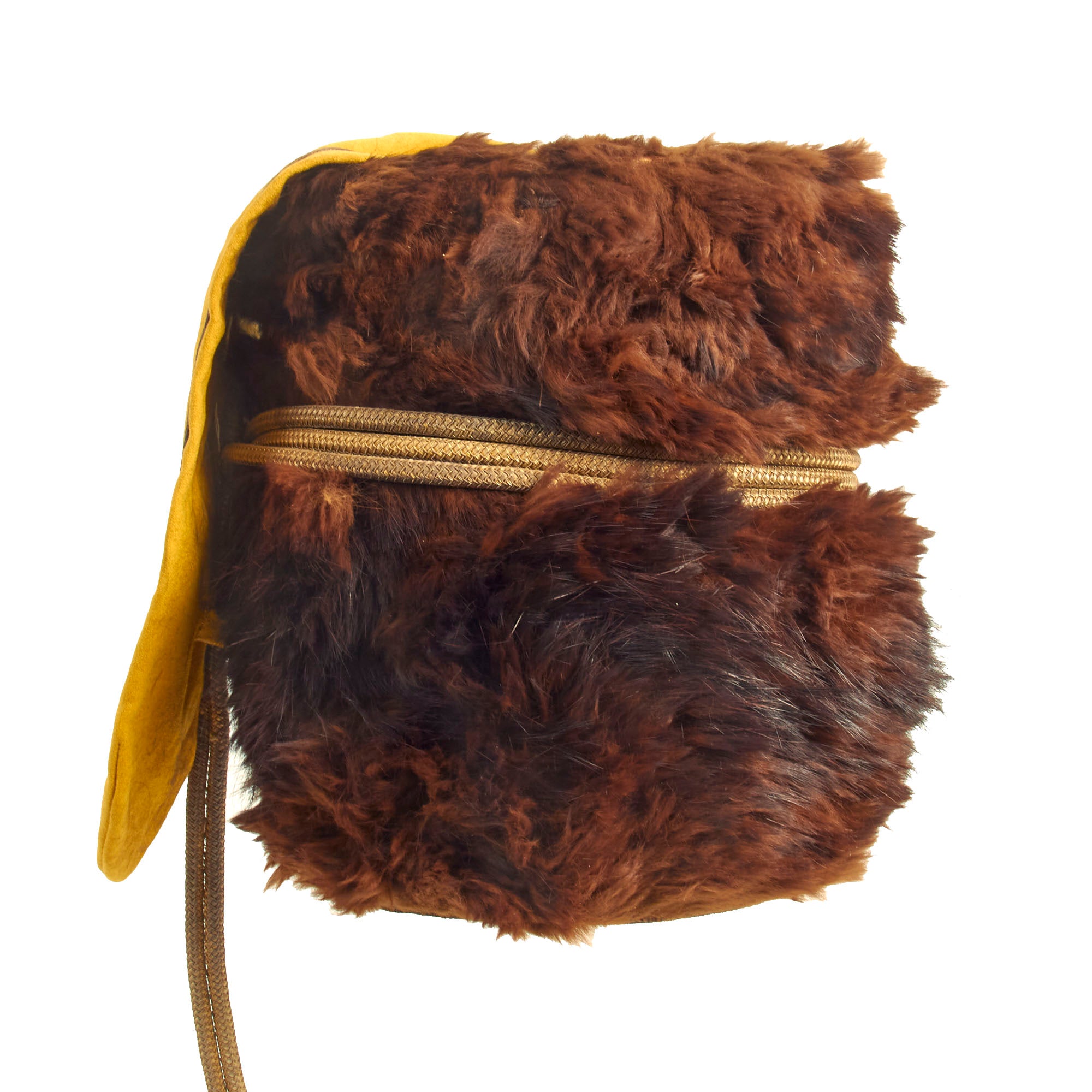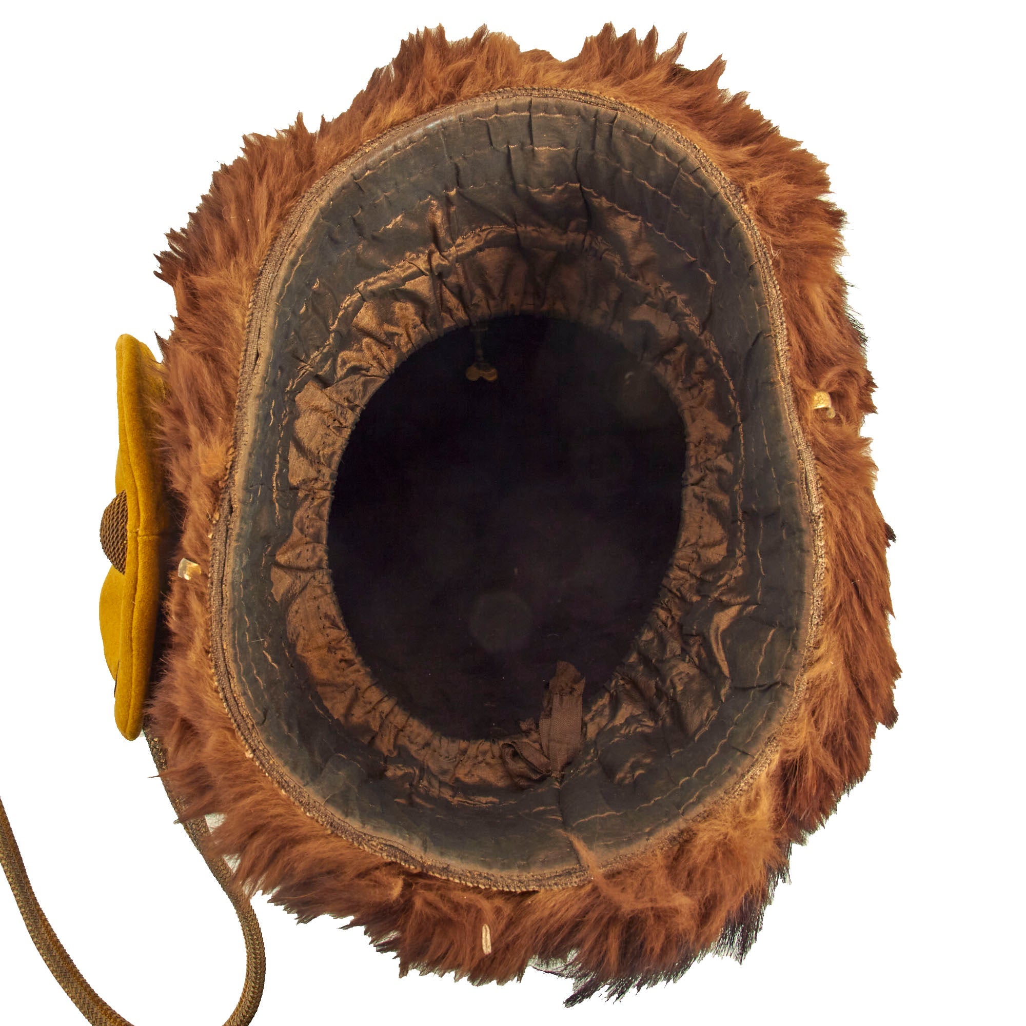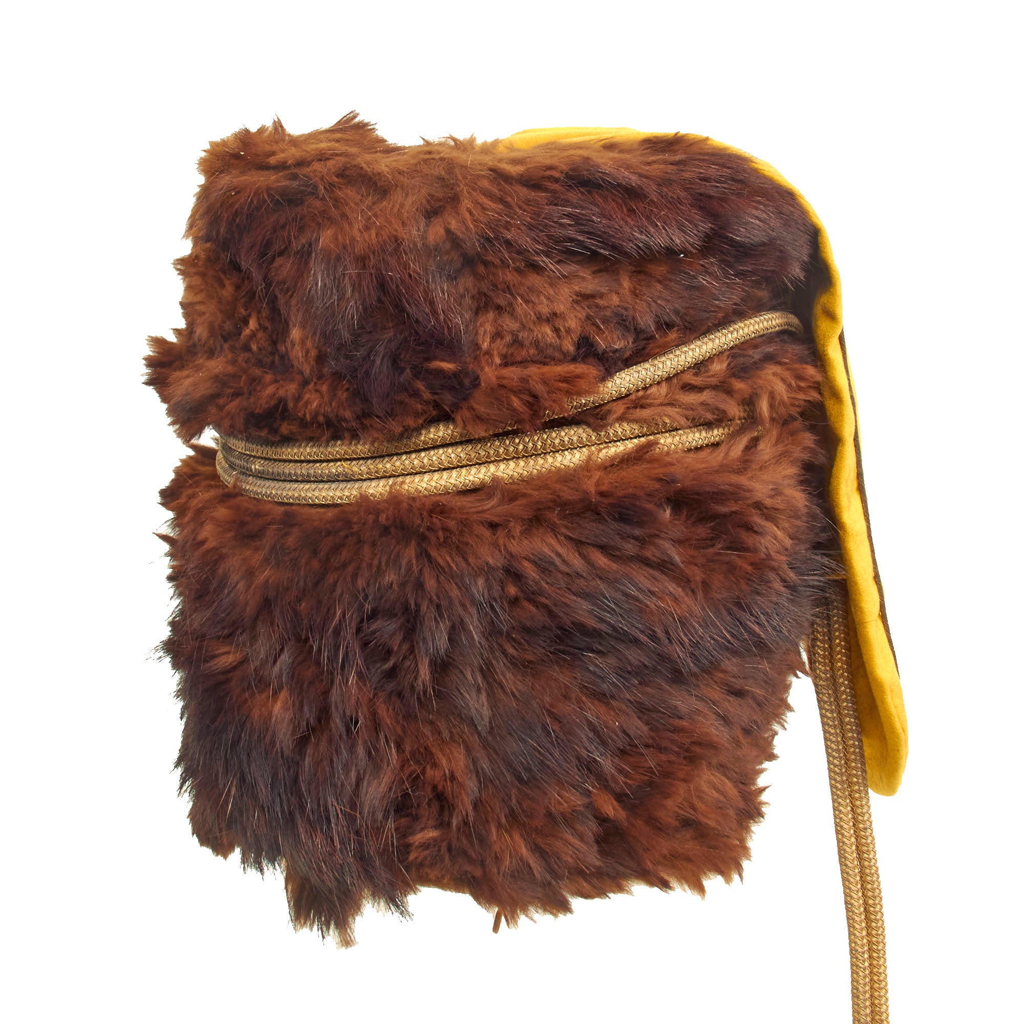 Original Item: Only One Available. This is a very beautiful genuine fur bearskin Busby used by the 4th Hussars, and has been ever since the infamous “Charge of the Light Brigade” in the 1850s. The helmet is complete with the symbolic right side “Yellow Bag” and yellow/gold cord surrounding, without chin scales and yellow cockade. Size is approximately a US 7 1/4.