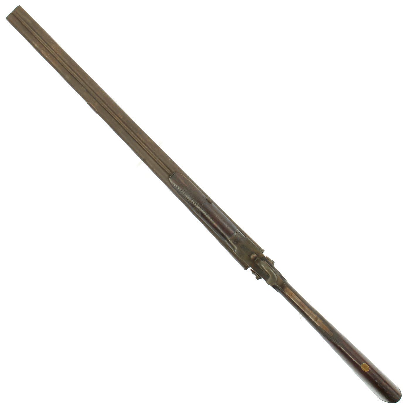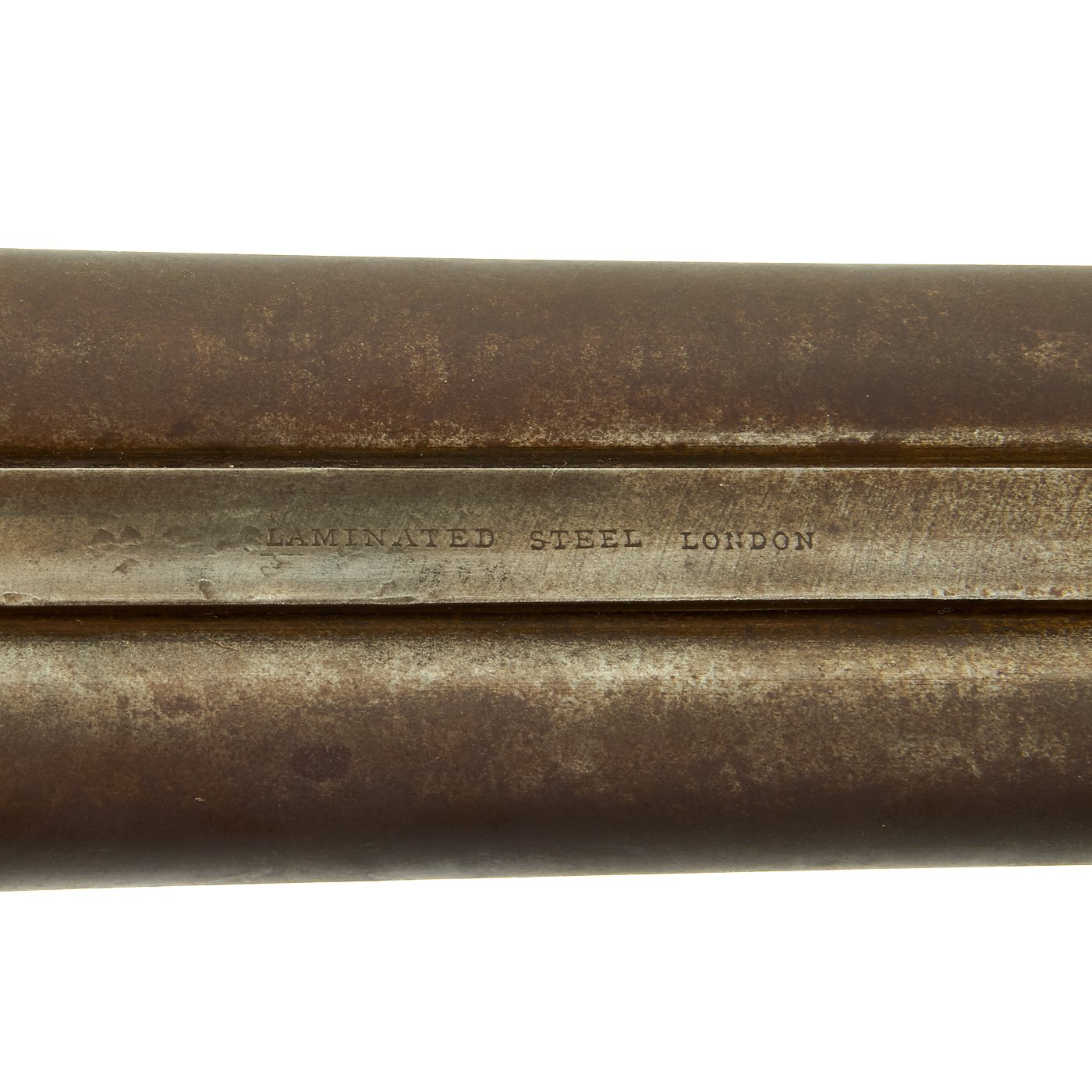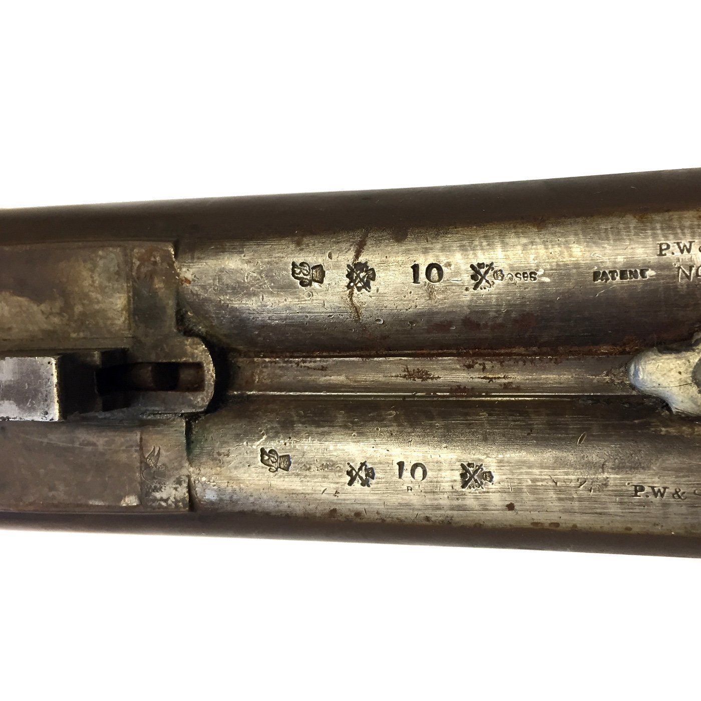 The top-break action is opened by an "Under Level" nestled around the trigger guard, that when depressed allows the barrels to tip down giving access to the chambers. Both barrels have multiple pits and deterioration on the outer surfaces. The barrel rib is stamped LAMINATED STEEL LONDON, with the trigger guard bearing engraved serial number of 6567. Removing the fore stock and barrels reveals a multitude of British proof marks, as well as the makers initials P.W. & S. as well as the 10 bore size. The serial number 6567 is marked on both barrels, as well as on the frame side. Some of the original laminated barrel finish can even still be seen under the fore stock! The locks are in full operating condition both hammers present. Stocked in good grade walnut with small silver escutcheon oval plate to the under side, unmarked.