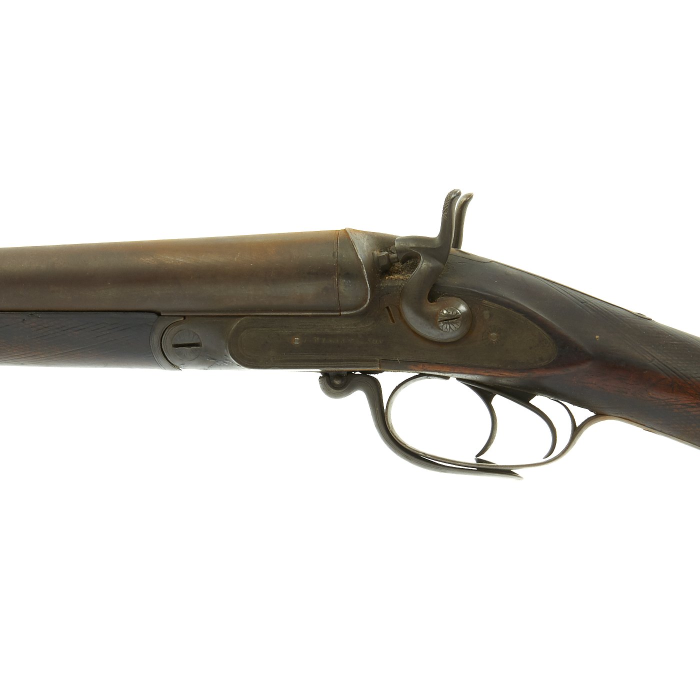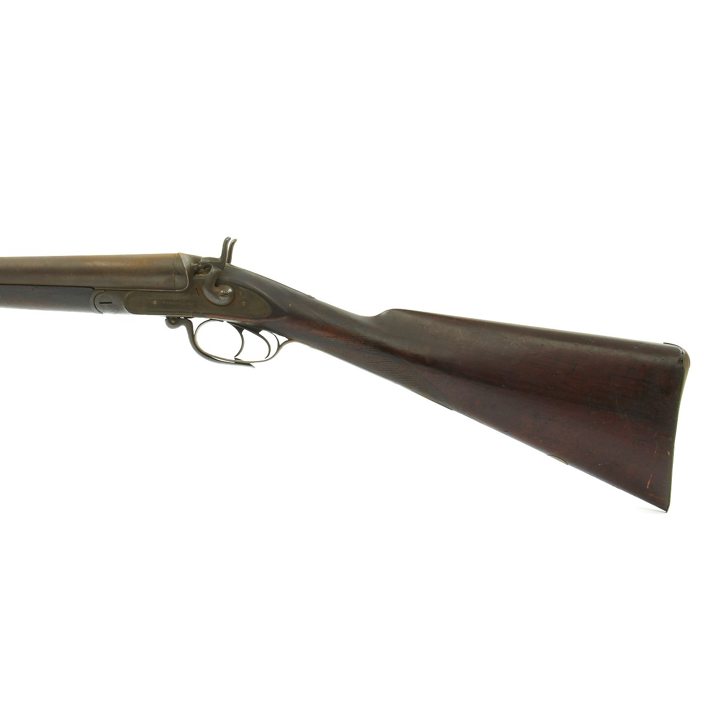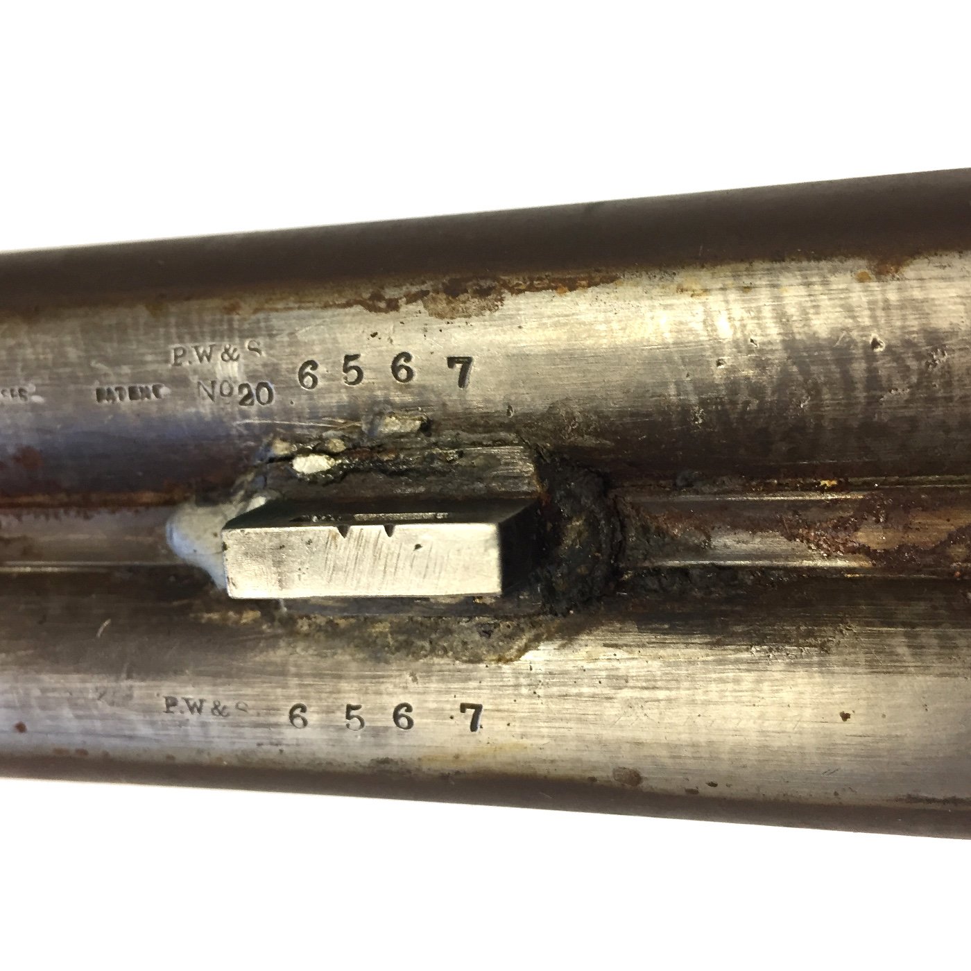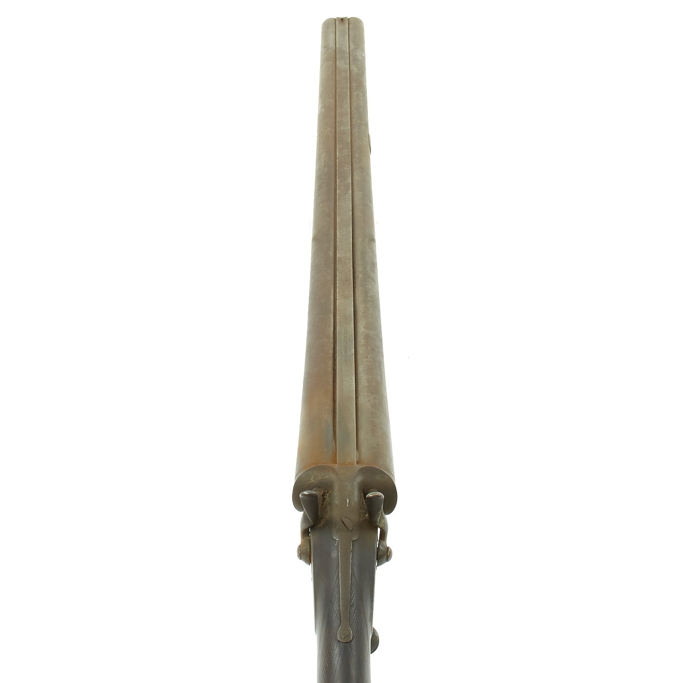 The top-break action is opened by an "Under Level" nestled around the trigger guard, that when depressed allows the barrels to tip down giving access to the chambers. Both barrels have multiple pits and deterioration on the outer surfaces. The barrel rib is stamped LAMINATED STEEL LONDON, with the trigger guard bearing engraved serial number of 6567. Removing the fore stock and barrels reveals a multitude of British proof marks, as well as the makers initials P.W. & S. as well as the 10 bore size. The serial number 6567 is marked on both barrels, as well as on the frame side. Some of the original laminated barrel finish can even still be seen under the fore stock! The locks are in full operating condition both hammers present. Stocked in good grade walnut with small silver escutcheon oval plate to the under side, unmarked.