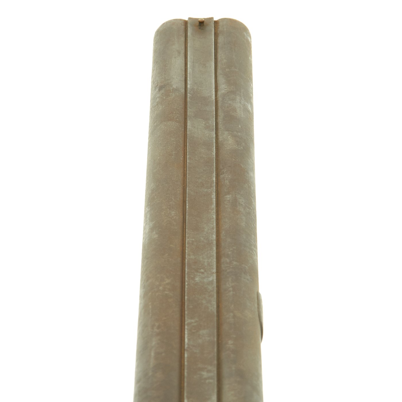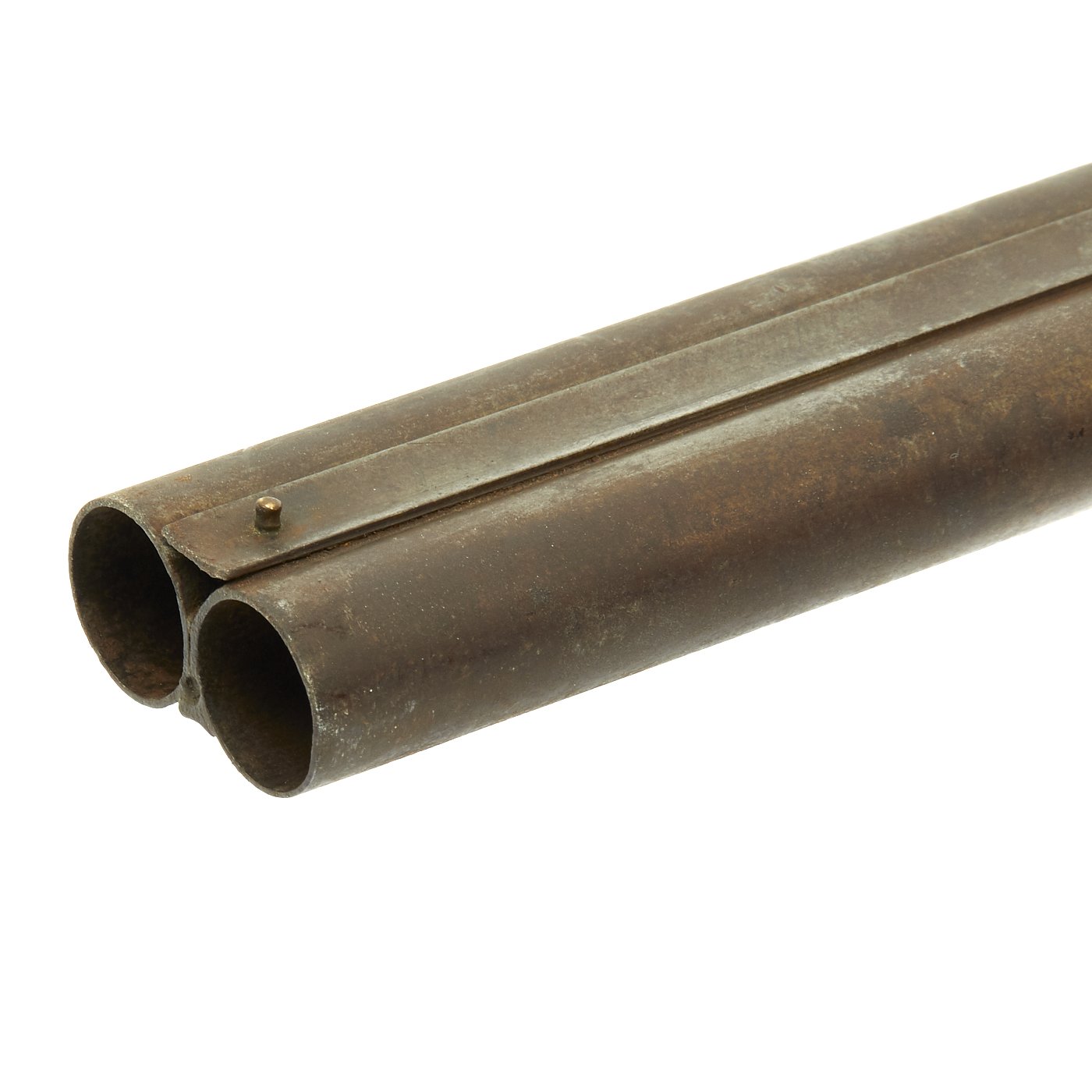 This particular example is a Double Barrel 10 Gauge Shotgun or Scatter gun fitted with 30" barrels, measuring 46 1/2" in overall length. The right hand tube having an ancient steel patch to the side, a real sign of the times. DEFINITELY NOT FOR SHOOTING TODAY!