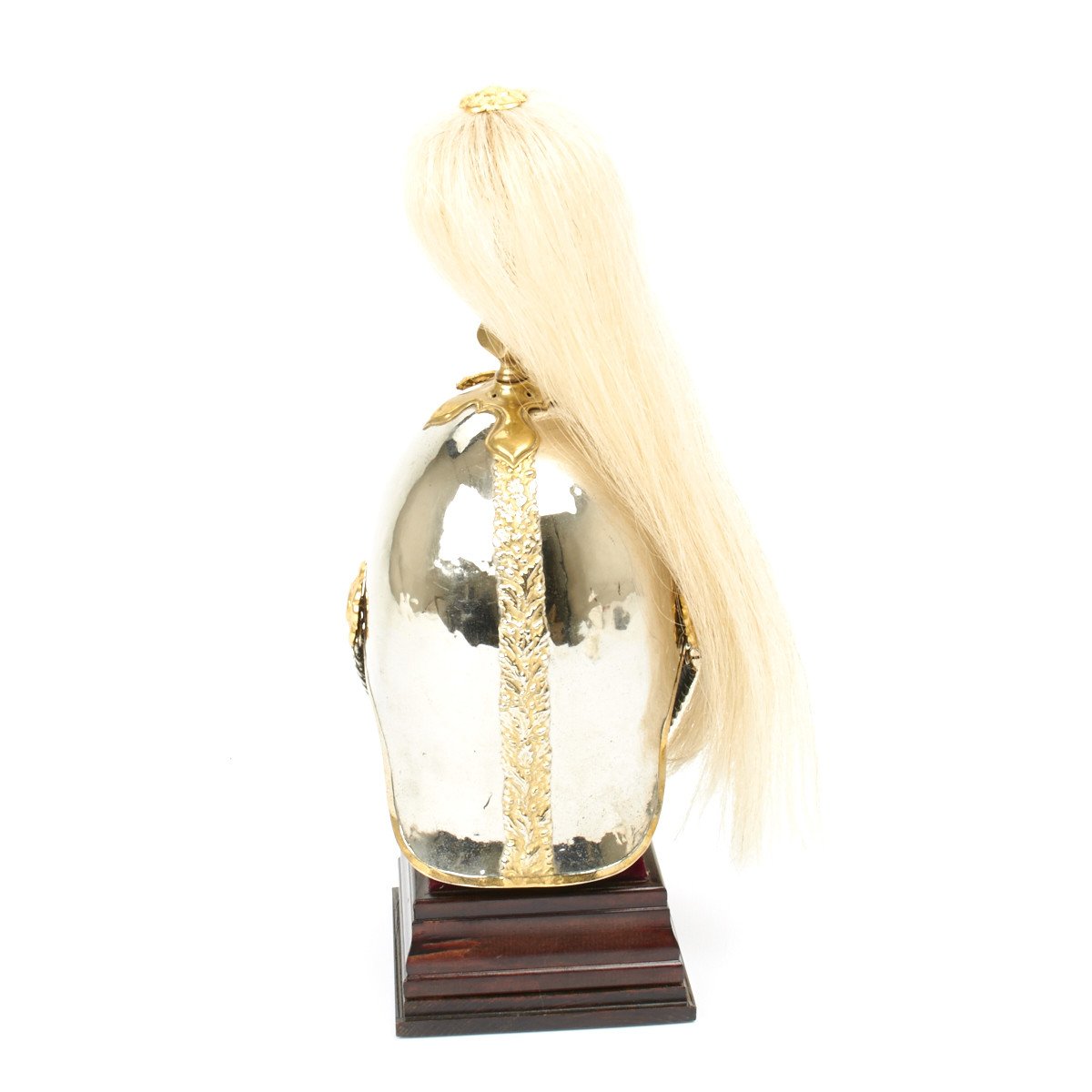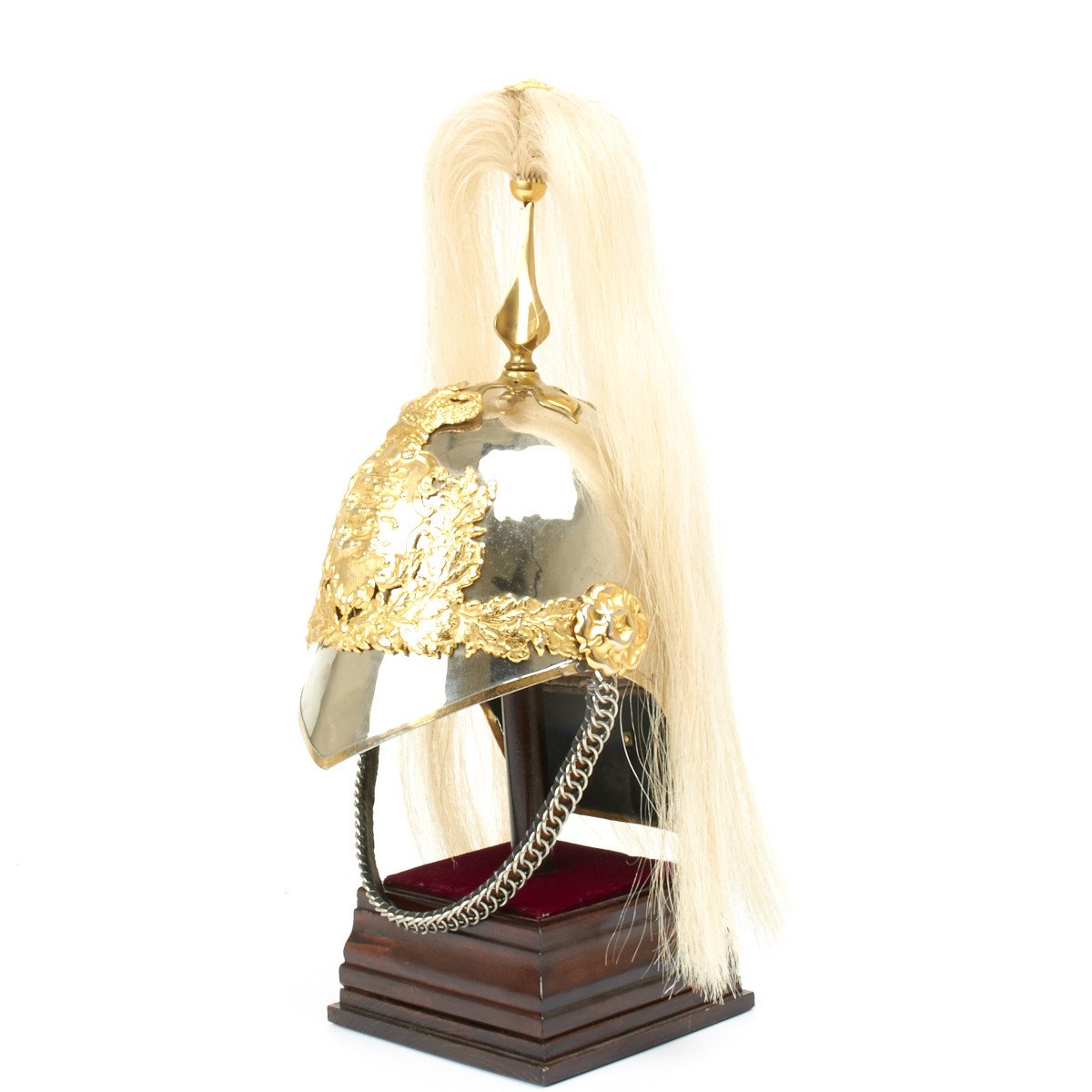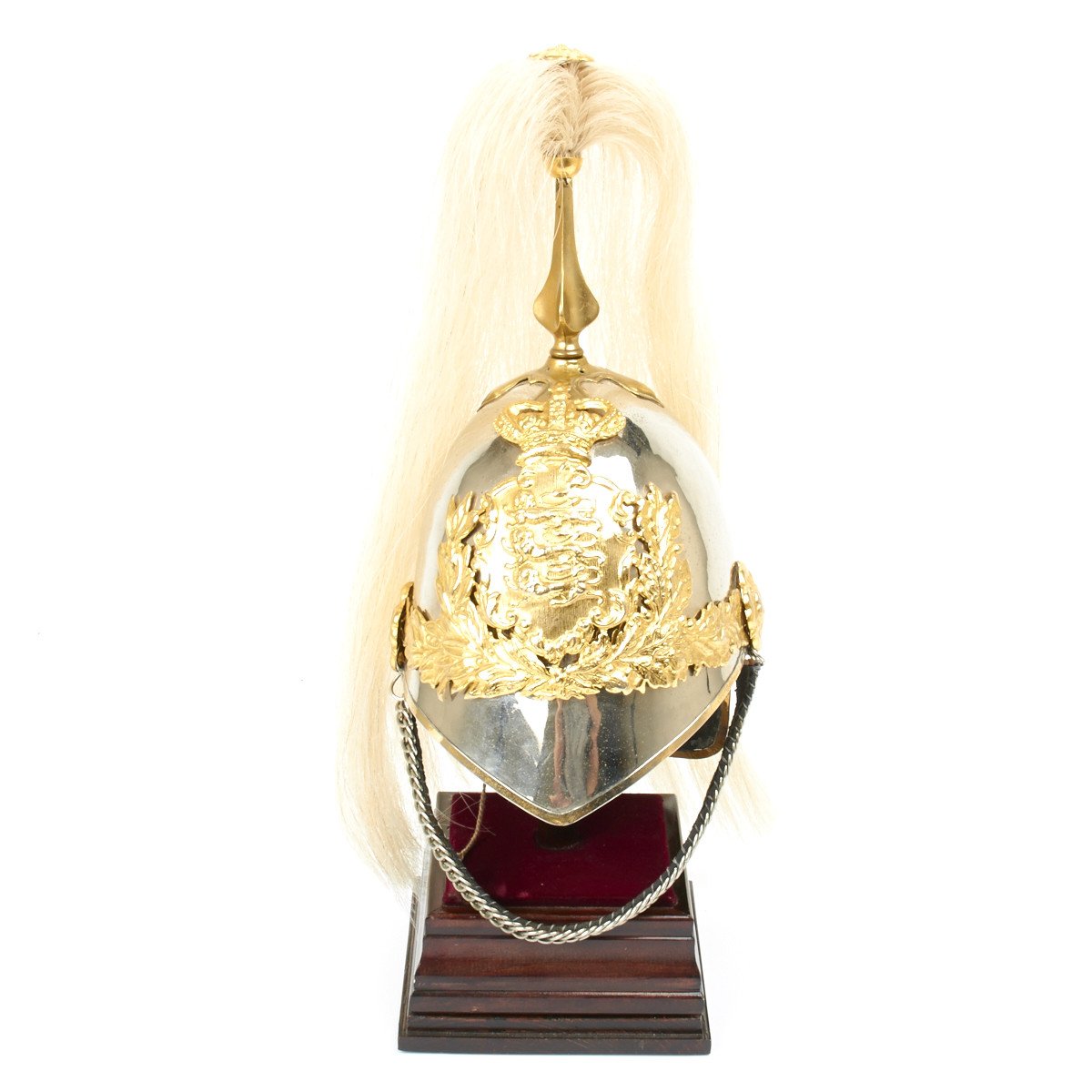 This lovely bright-silvered helmet dates from a short period in the 1880s when Queen Victoria was on the British Throne. Offered in lovely condition the helmet comes with the original liner, chin scales and horsehair plume together with full regimental cypher to the helmet plate that is gilded as are the mounts making this a very collectible magnificent scarce British cavalry helmet!