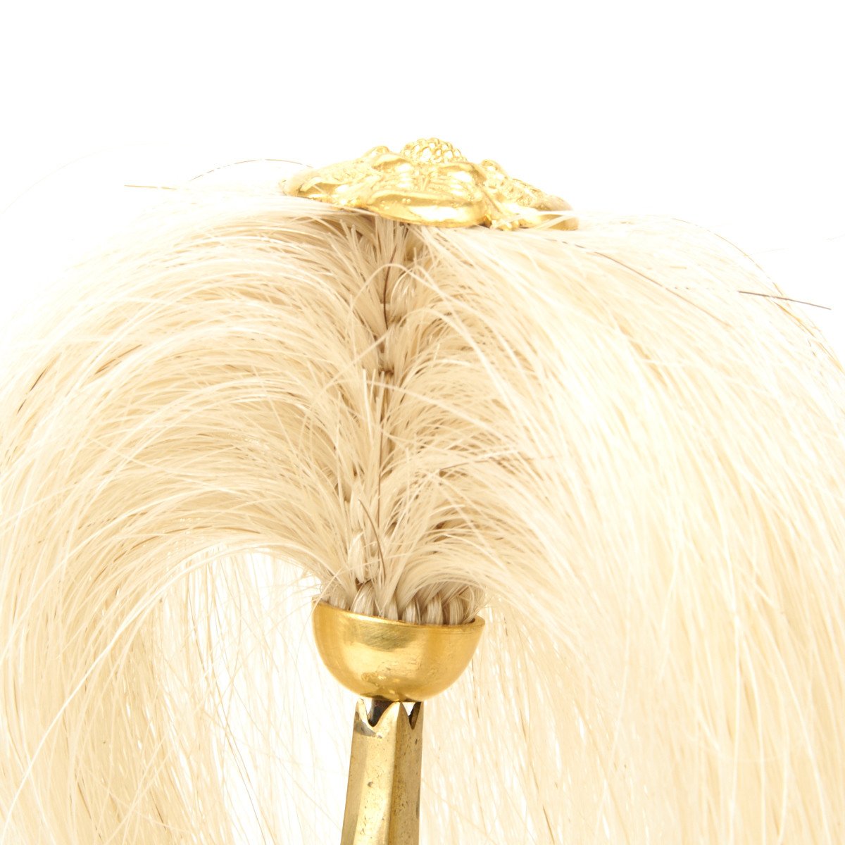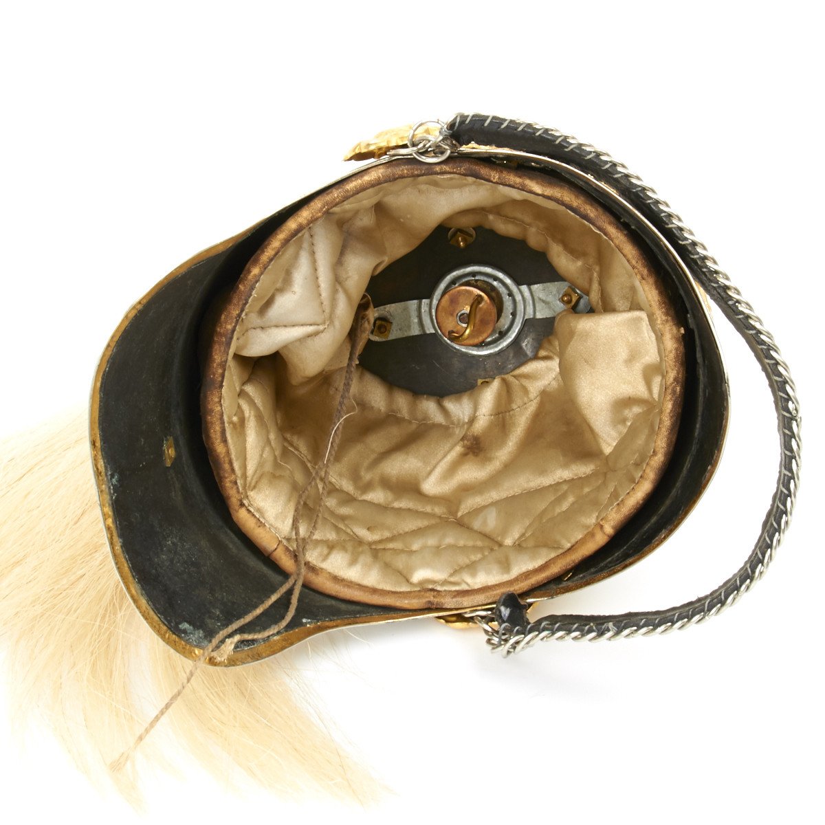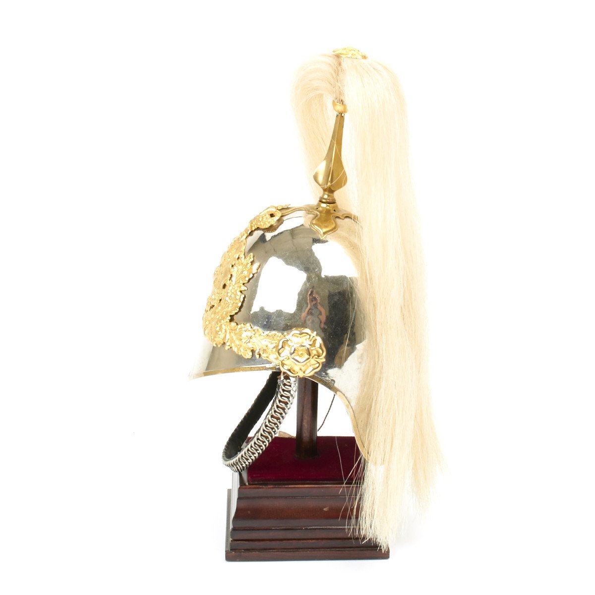 This lovely bright-silvered helmet dates from a short period in the 1880s when Queen Victoria was on the British Throne. Offered in lovely condition the helmet comes with the original liner, chin scales and horsehair plume together with full regimental cypher to the helmet plate that is gilded as are the mounts making this a very collectible magnificent scarce British cavalry helmet!