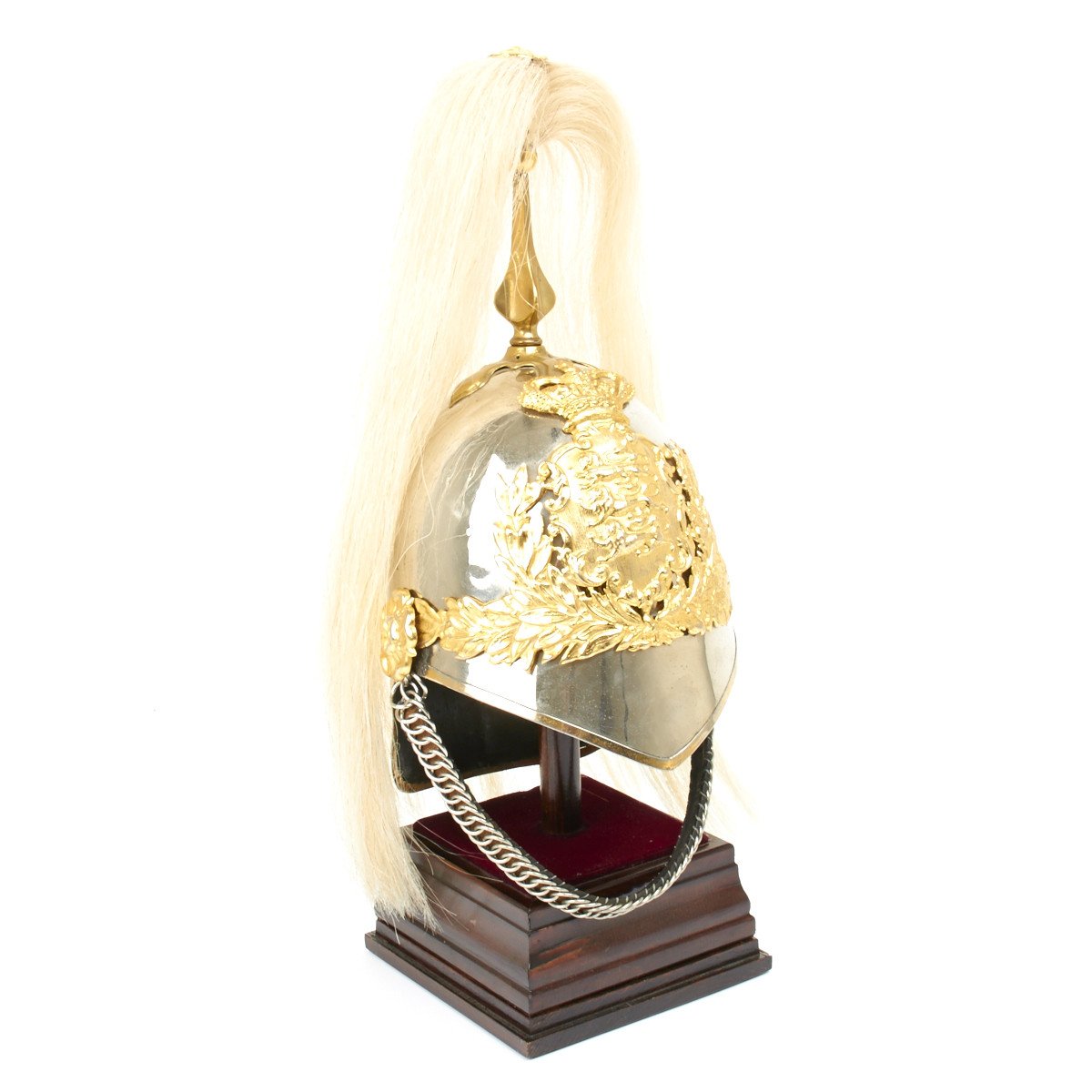 By the second half of the 19th century the regiment became known as The Duke of Lancaster's Own Yeomanry Cavalry. In 1877 this dragoon style helmet was adopted but the shell was black.