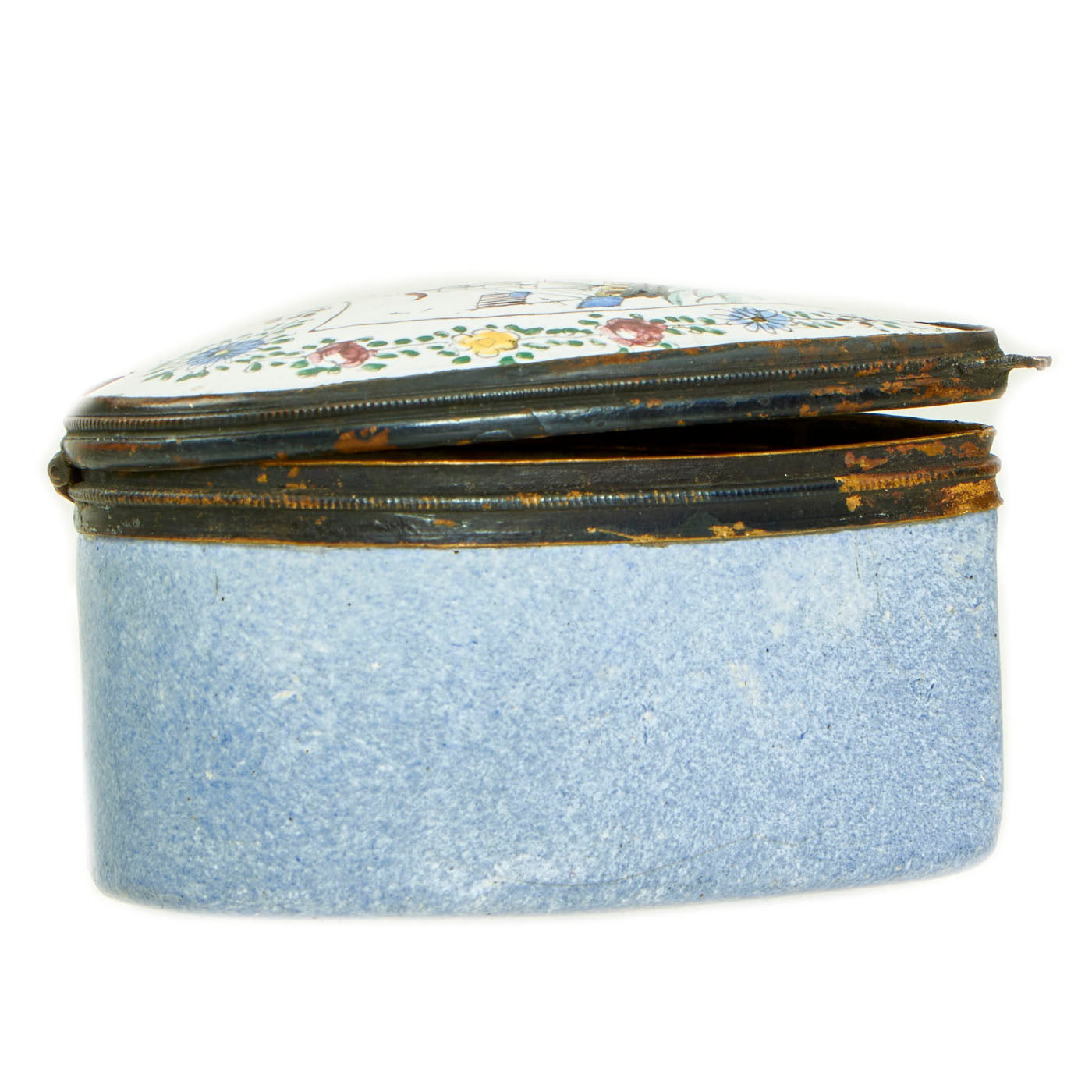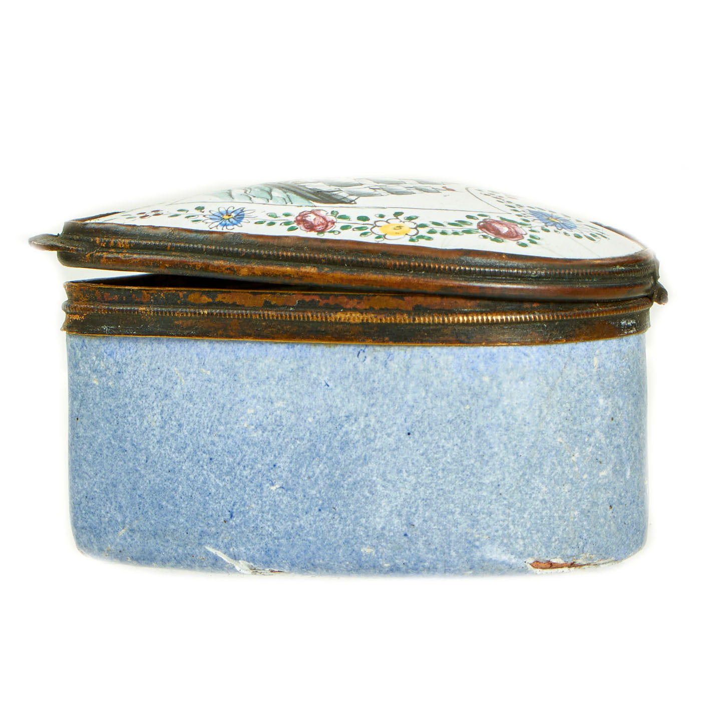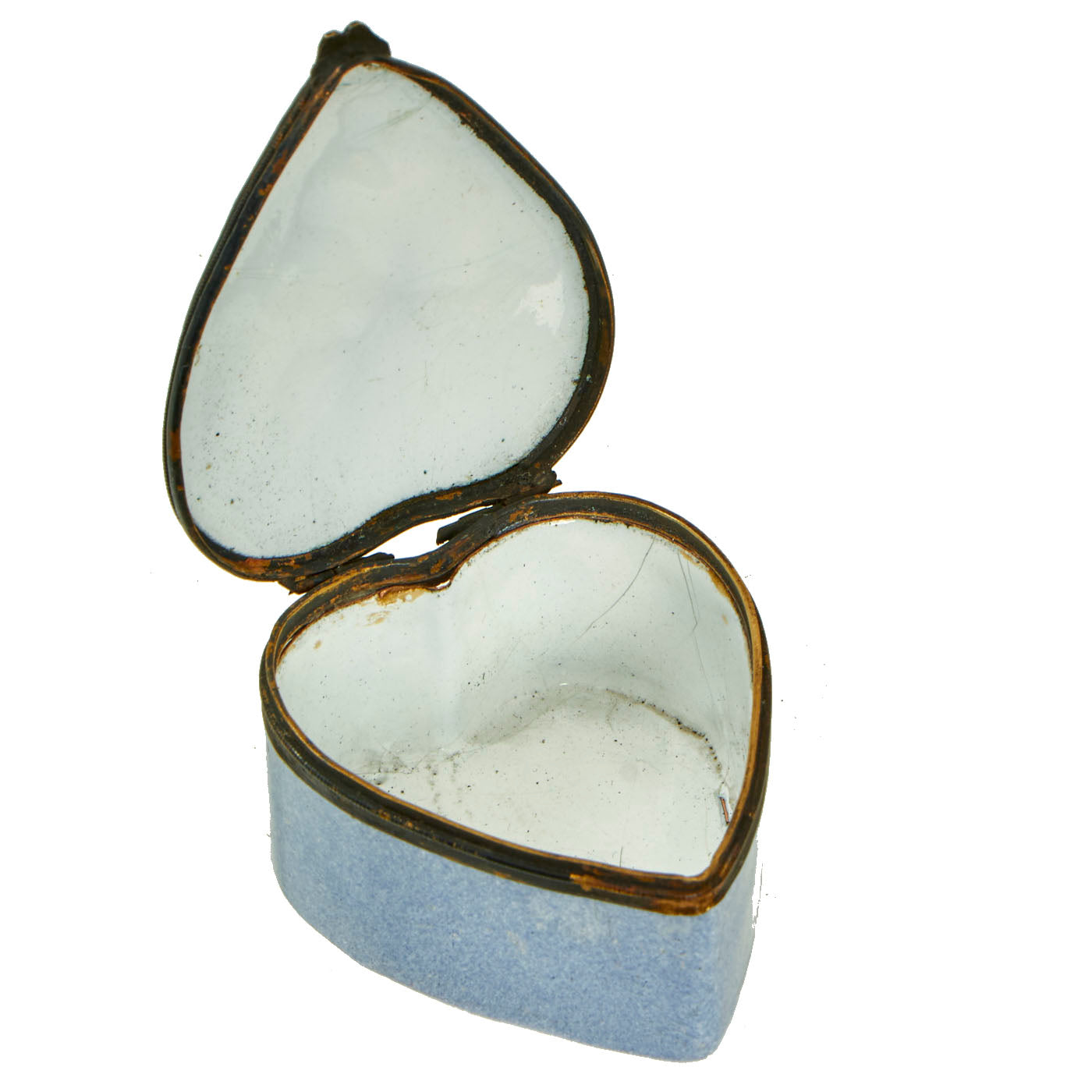 Original Item: Only One Available. This gorgeous small enameled copper HEART-SHAPED box with what was gilt brass frame was intended for cheek patches that were then very much en vogue, or other such like accessories. The hinged cover showing enamel Man-o-War that appears to have a U.S. flag displayed, interestingly perhaps being flown incorrectly upside down. The enamel worker's error perhaps.