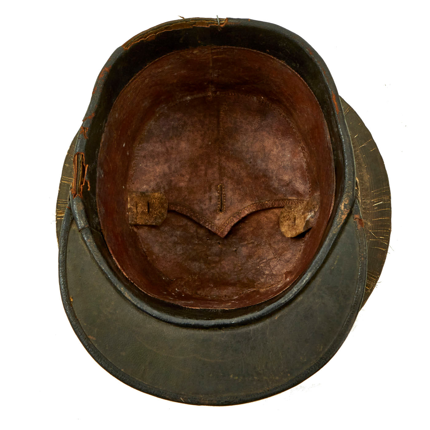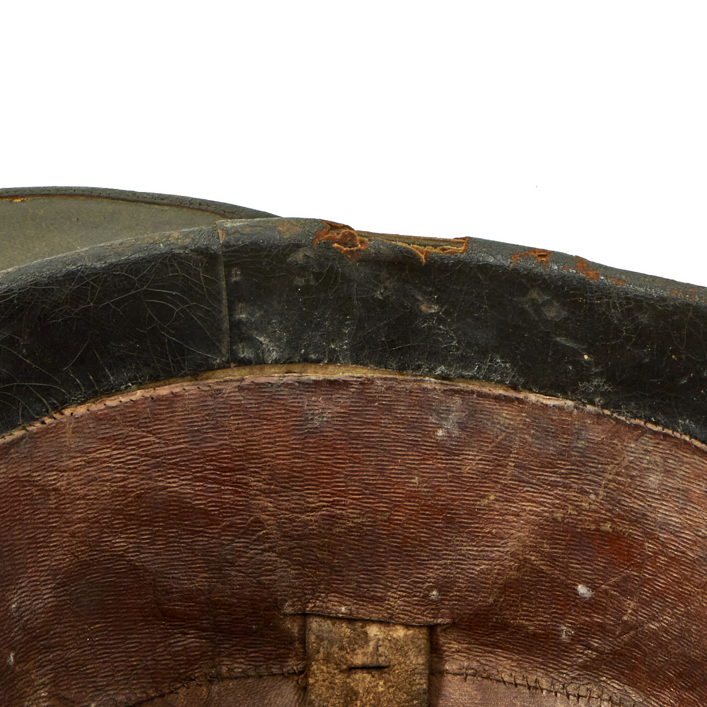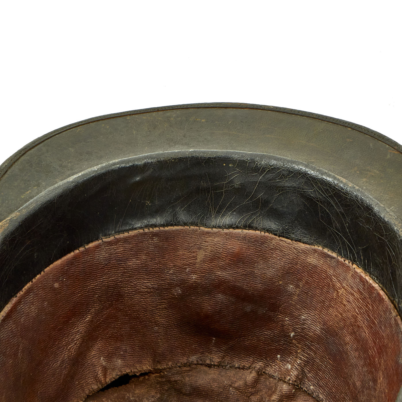 We believe this Bell Top example to be of British origin. It is in lovely condition for the age, but unfortunately there are no original badges or adornments present, only the blue cloth badge in the center. The badge on the front is most likely a much later replacement added for display purposes and appears to be homemade. Most of the black finish on the leather has been retained, but there is rub and wear present on the edges, exposing a lovely russet brown leather. All stitching appears to be intact as well as a majority of the leather liner on the inside, but it is heavily worn with a section missing.