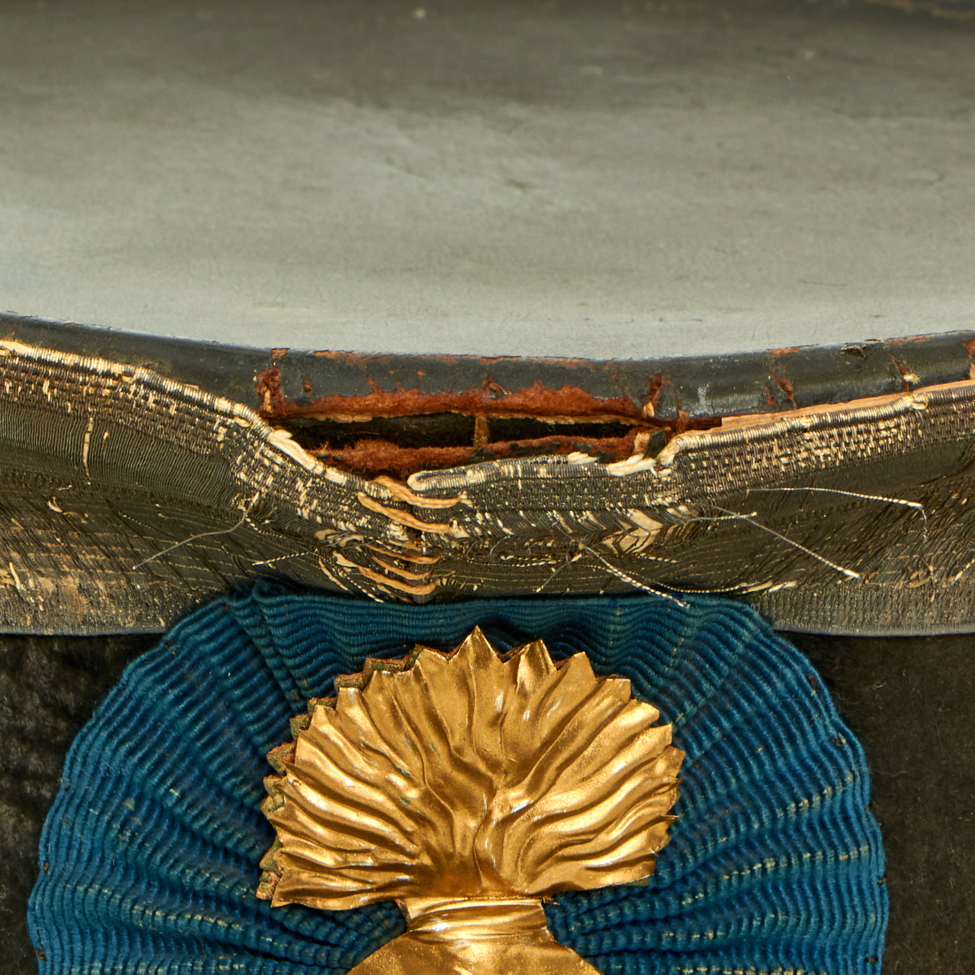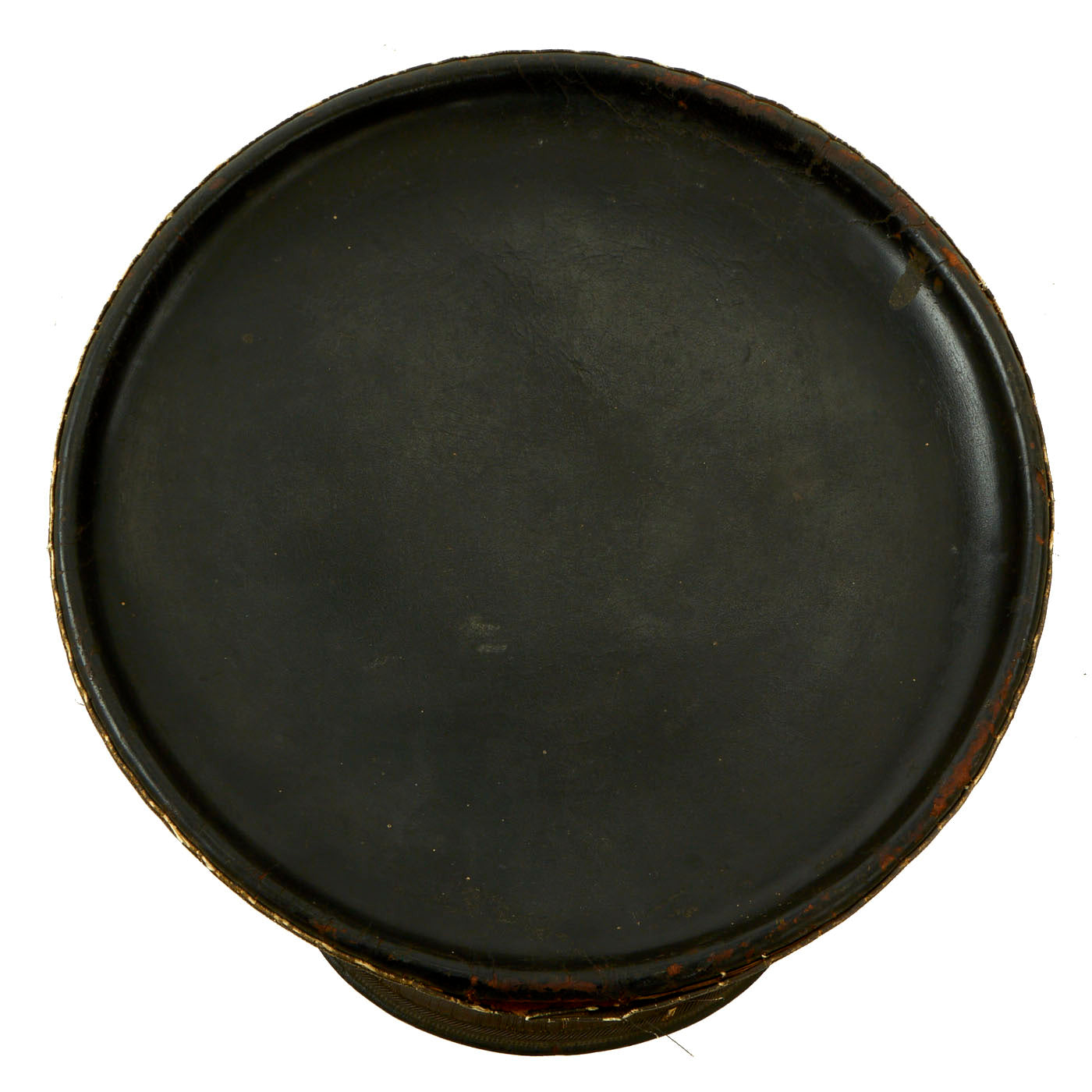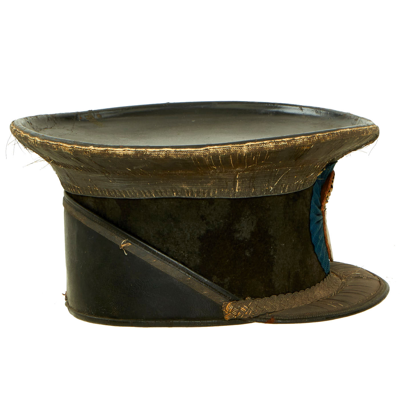 We believe this Bell Top example to be of British origin. It is in lovely condition for the age, but unfortunately there are no original badges or adornments present, only the blue cloth badge in the center. The badge on the front is most likely a much later replacement added for display purposes and appears to be homemade. Most of the black finish on the leather has been retained, but there is rub and wear present on the edges, exposing a lovely russet brown leather. All stitching appears to be intact as well as a majority of the leather liner on the inside, but it is heavily worn with a section missing.