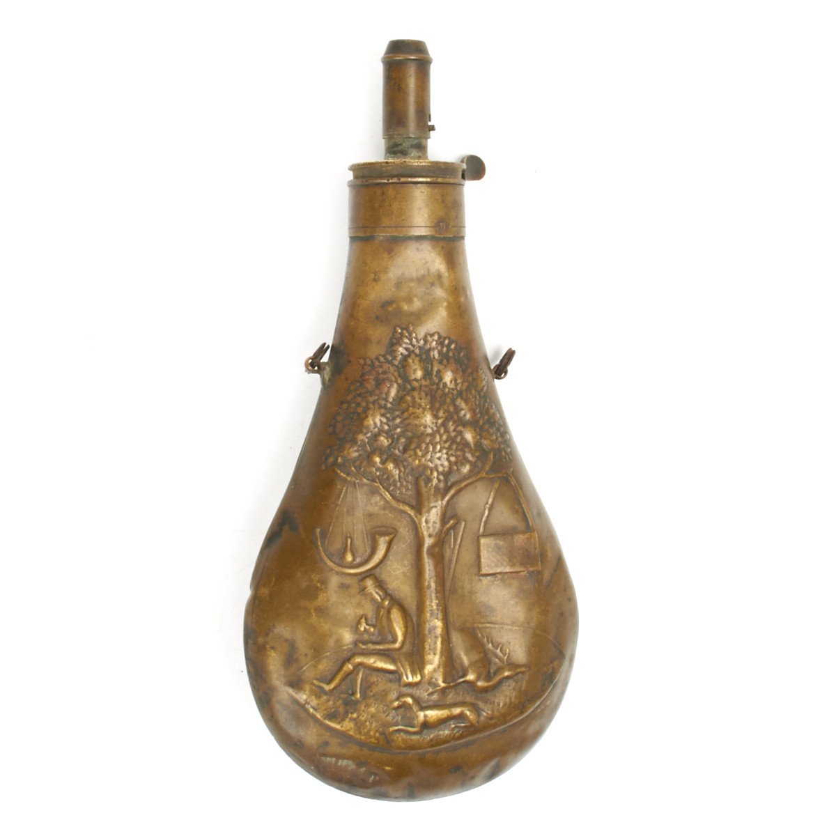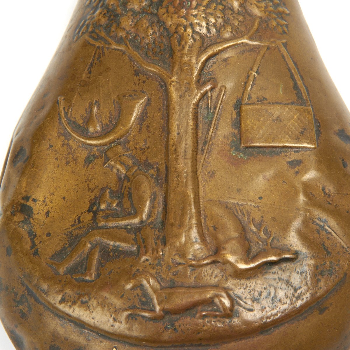 Original Item: One-of-a-kind. This is a large, 9.5" tall, brass powder flak embossed with a hunter sitting under a tree taking a little libation with his dog at his feet and a dead stag laying on the ground. His powder flask, hunting horn and game bag hang in the tree above him.