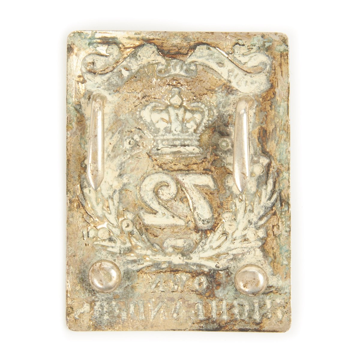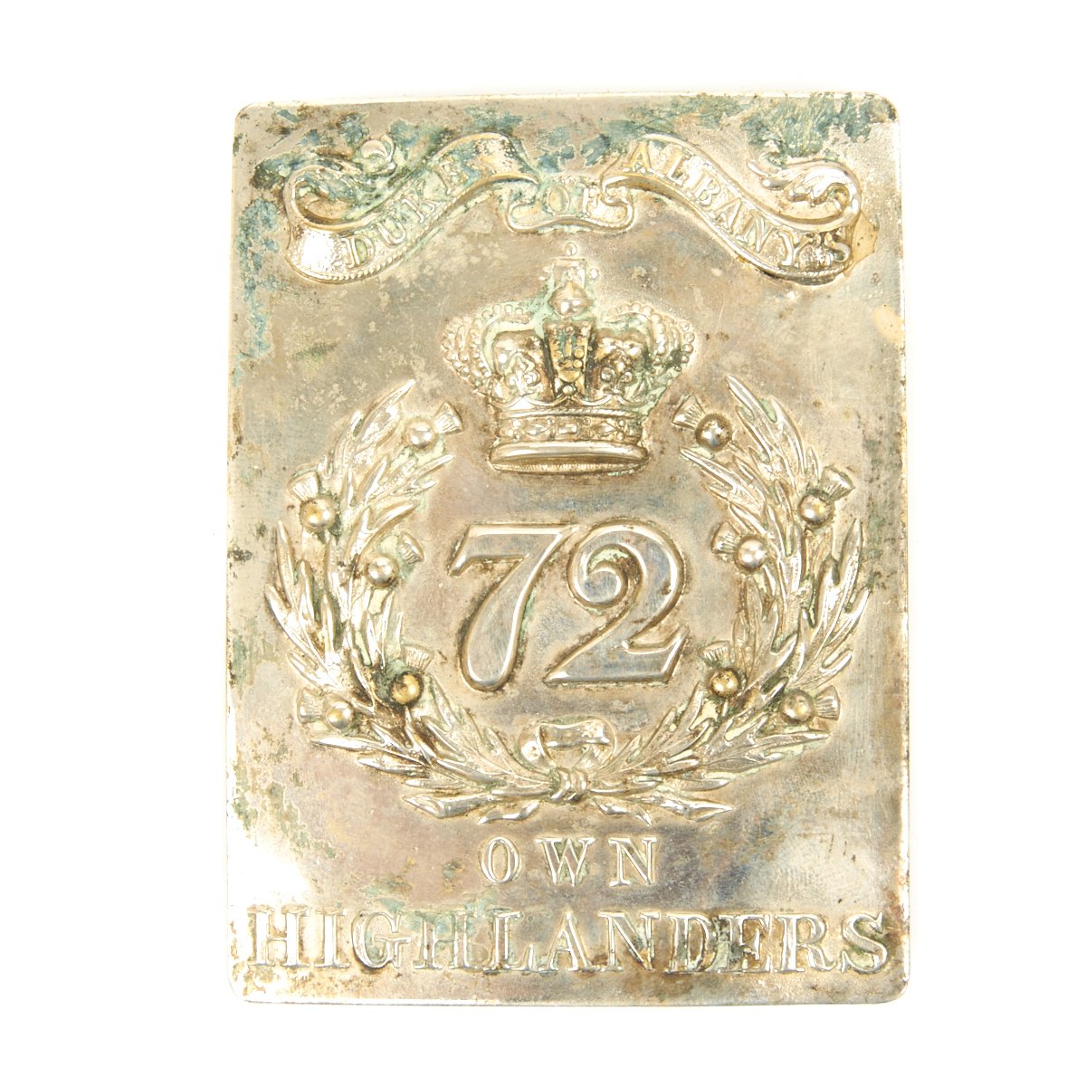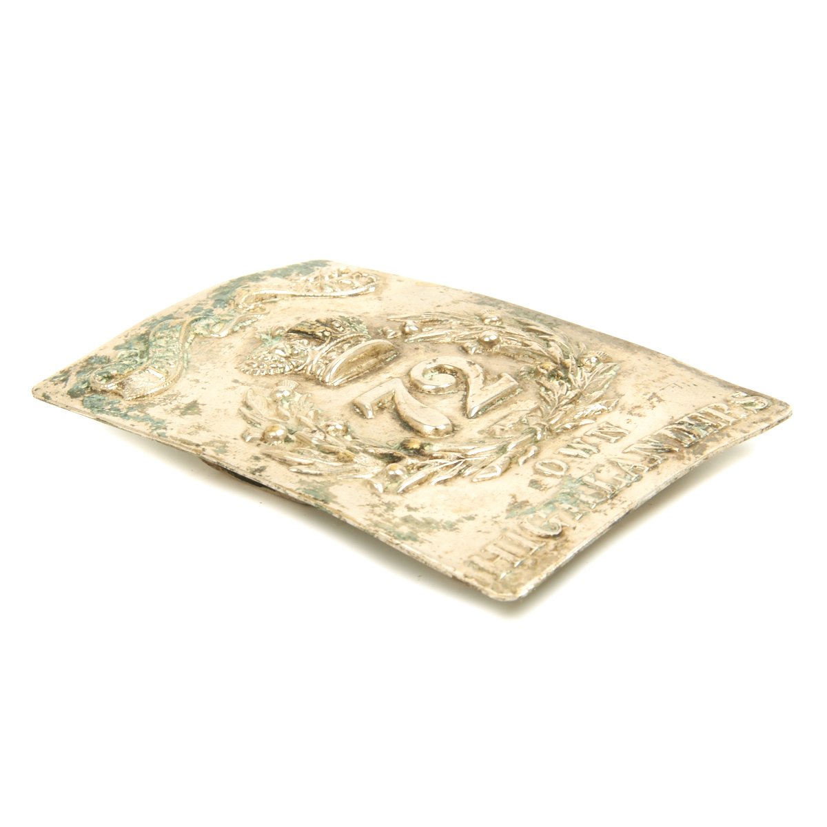 Original Item: Only One Available. A Cross Belt plate was worn on the white buff belt slung across an Infantryman's shoulder and chest, very often to carry his ammunition pouch. In the case of Officers, the Cross Belt plate was used to carry the Infantry Sword. The plate displays the Royal Crown over regimental designation 72, surrounded by laurel leaves, and the DUKE OF ALBANY'S OWN HIGHLANDERS on the top and bottom.