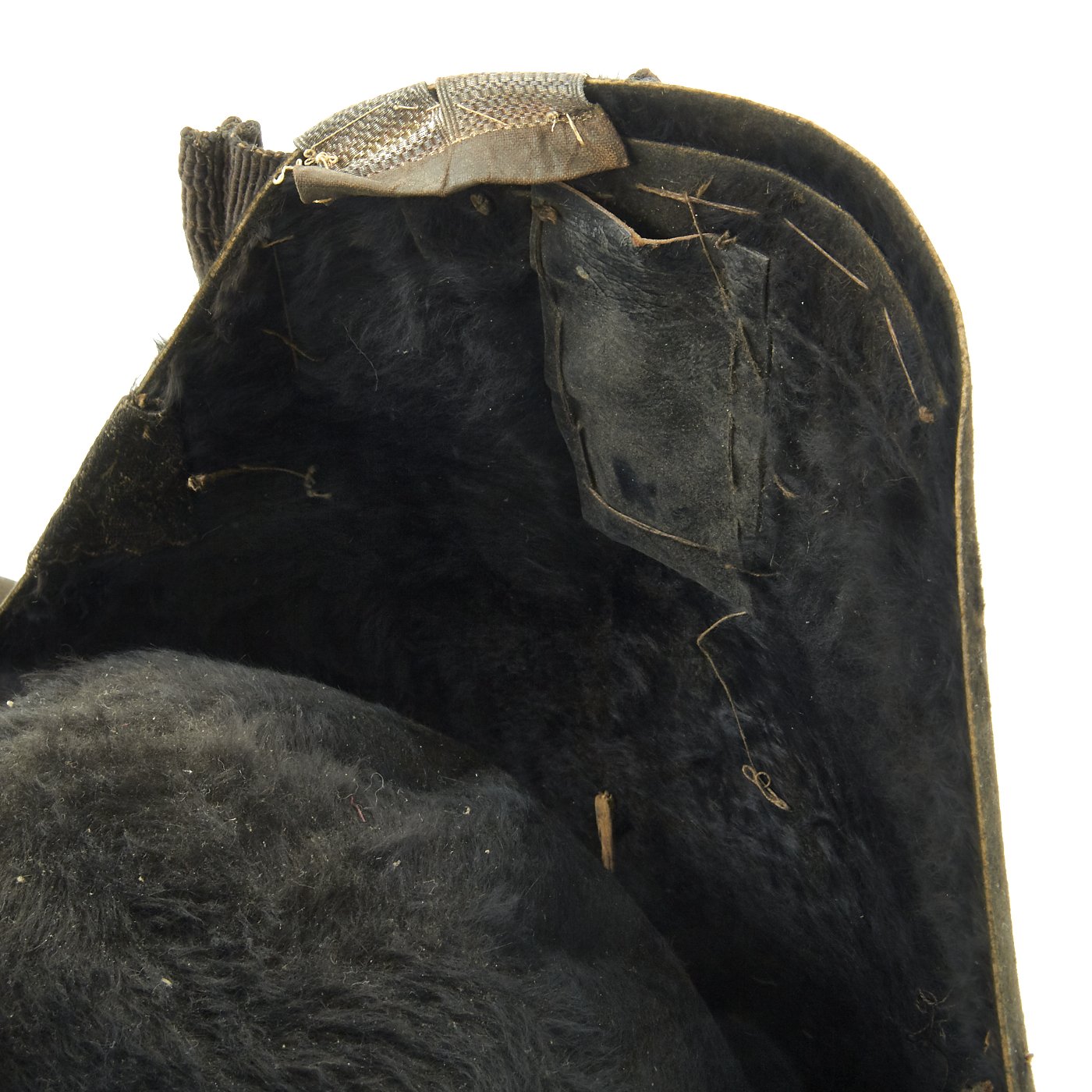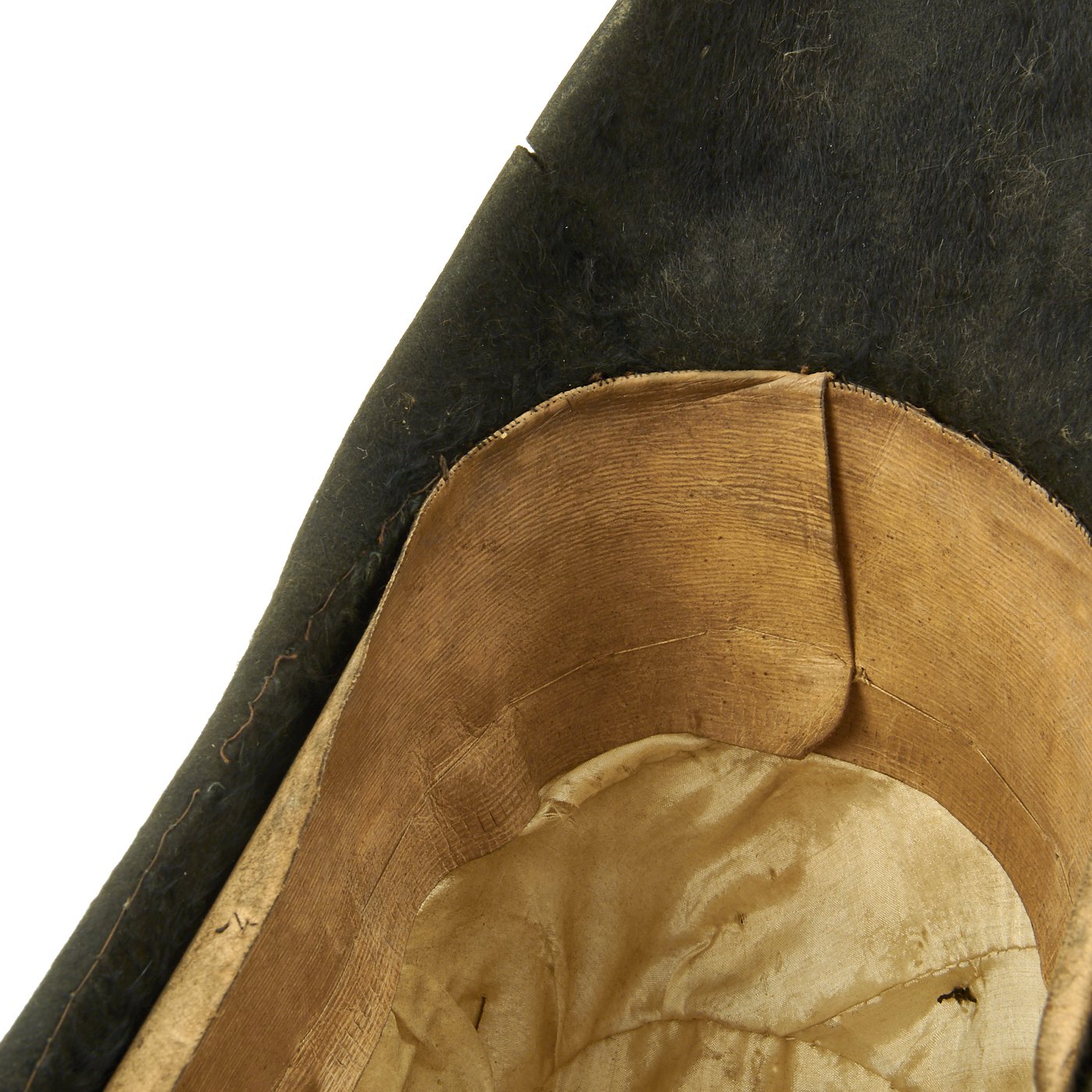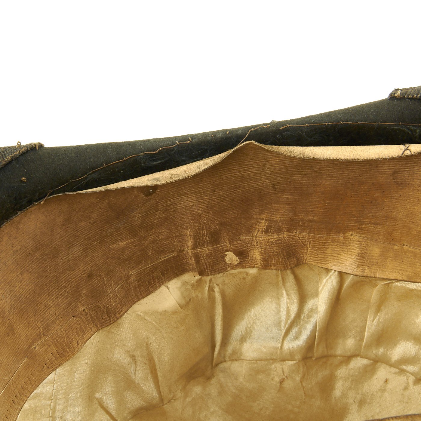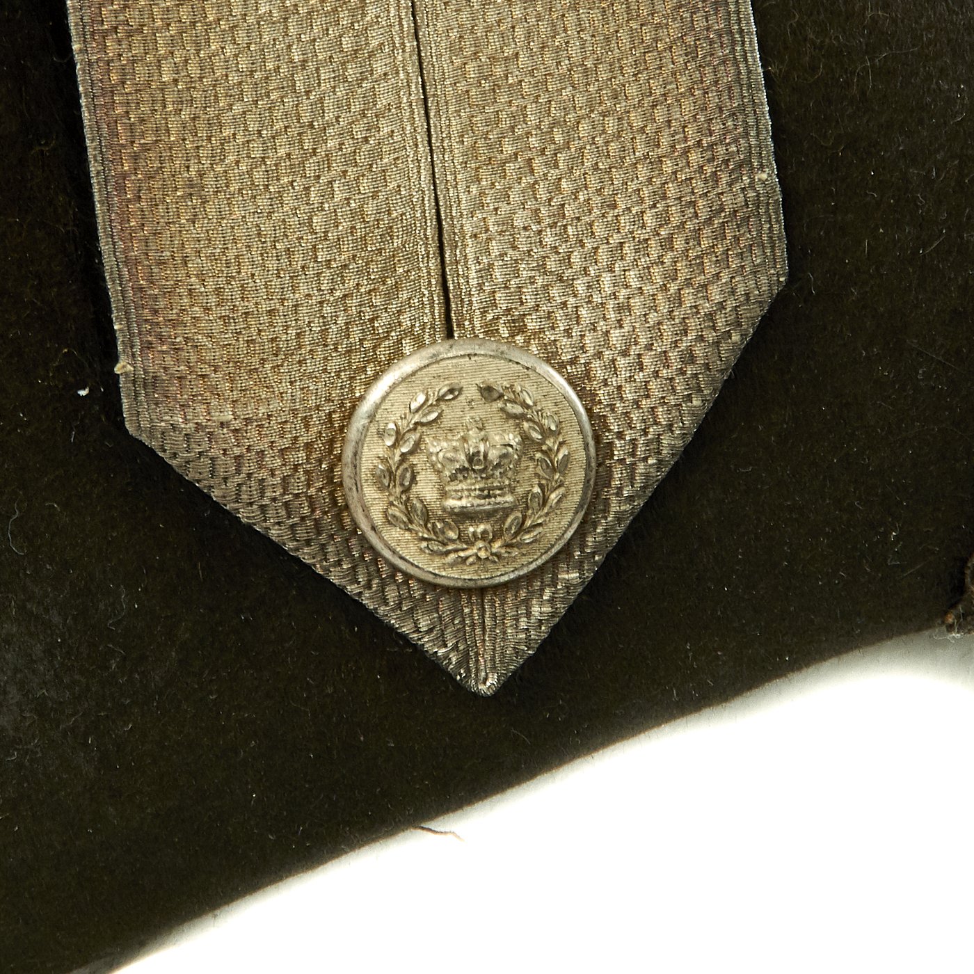 Original Item: Only One Available. This is a classic Fore and Aft hat worn by both the British Army and royal Navy during the Napoleonic Wars and through the Victorian era. The exact date of this hat is unknown, we believe that it dates from the earlier part of the 19th century between 1830 to 1860. It features a shaved sealskin fur body, silver brocade trim, and a queens crown button on the right side. The white silk lining is intact as well as the sweatband. Size is approximately a US 7 1/4 (58cm). The body of the hat is not crushed or broken, the fur is in good condition, but the hat does show signs of age with minor cracking at one side.