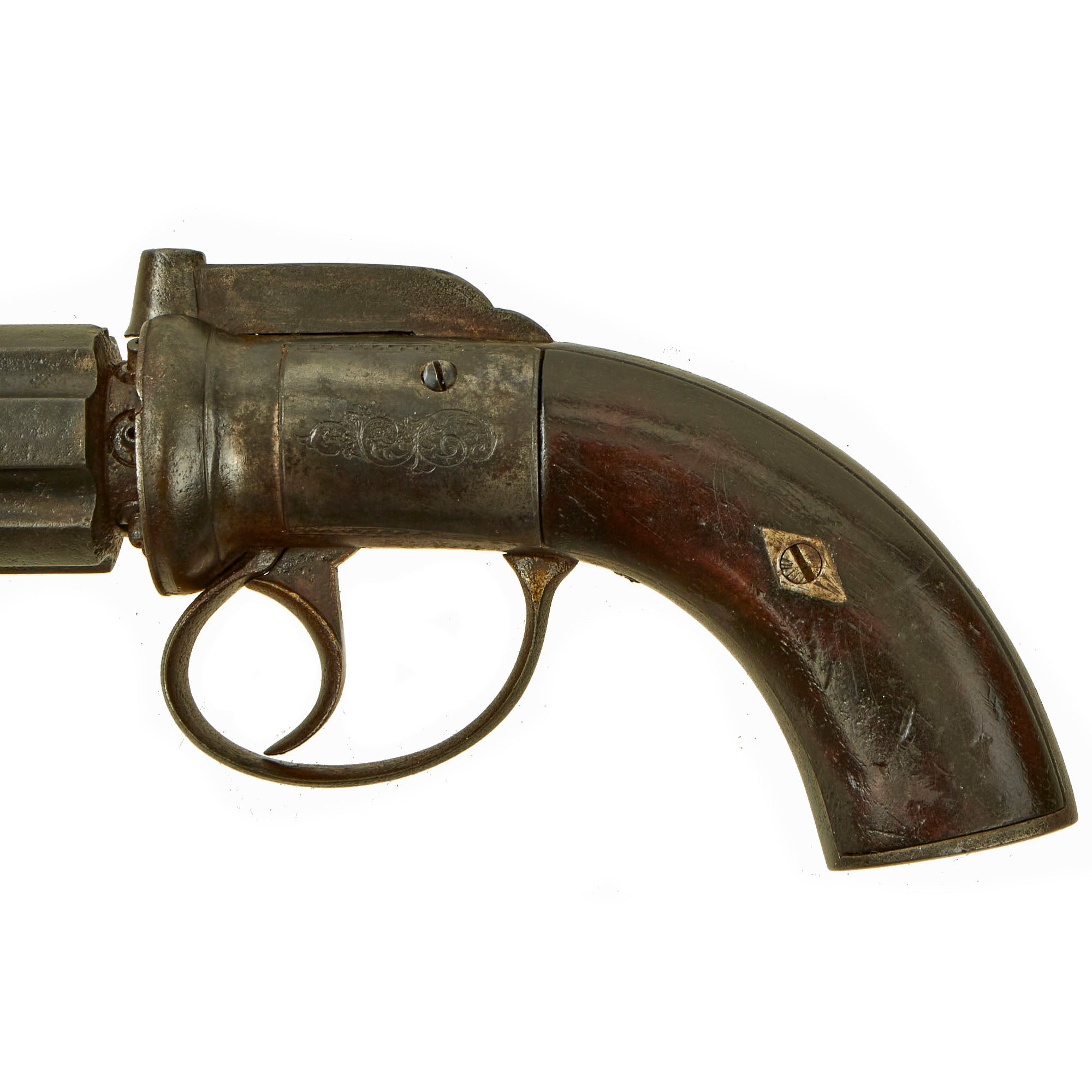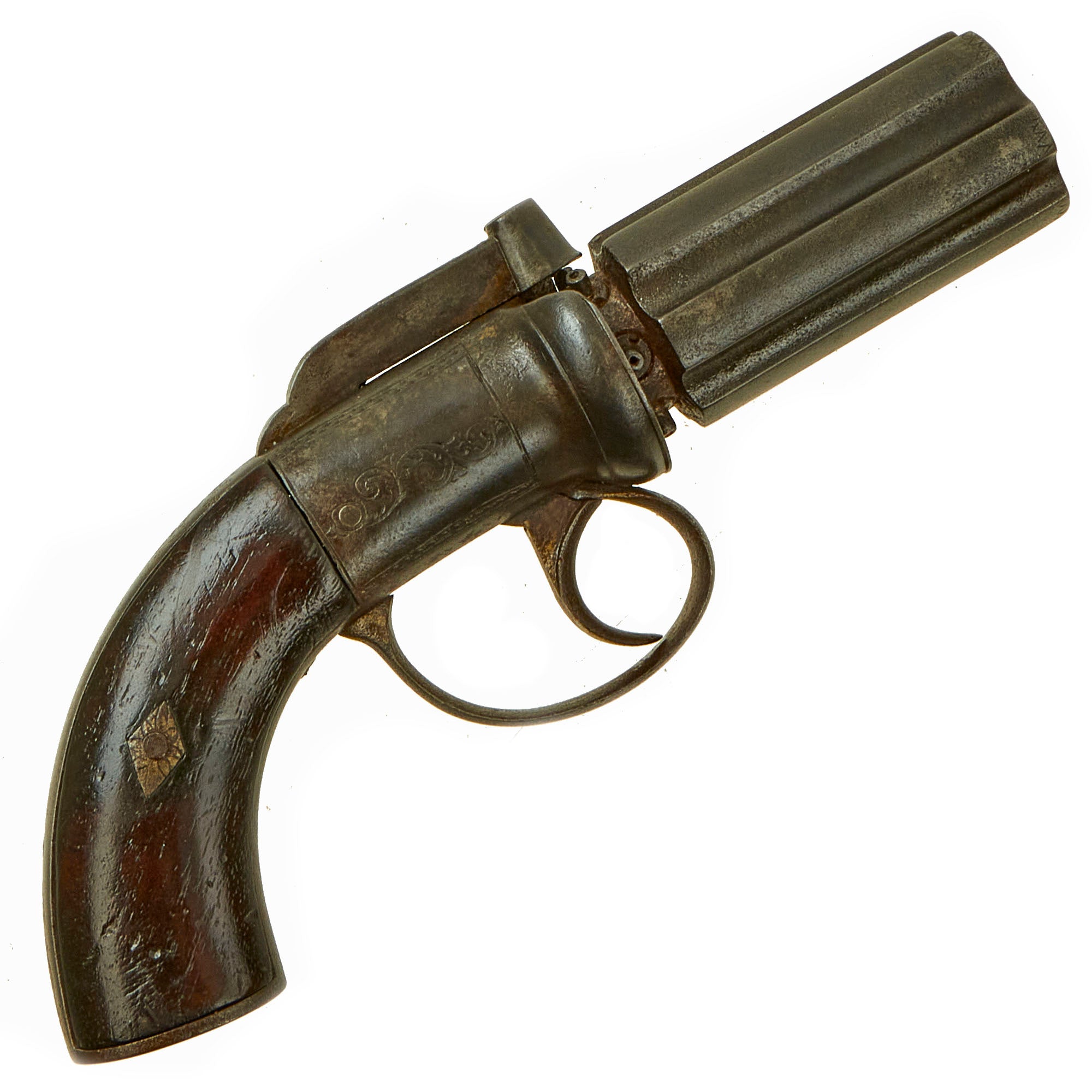 • Original Item: Only One Available. This is a very nice example of the unusual system known as the "PEPPERBOX". The muzzle is similar to the business end of a Pepper Pot of the the early days of Queen Victoria. All six barrels are contained in one solid "tube" or cylinder of steel revolving as a unit. The system was quickly superseded with the design of the traditional revolver, using a rotating chamber and a single barrel in the 1840-1850s. Pepper boxes as such were short lived with the possible exception in France and Belgium, where examples using the Pin Fire and Rimfire systems were made into the late 1870's.