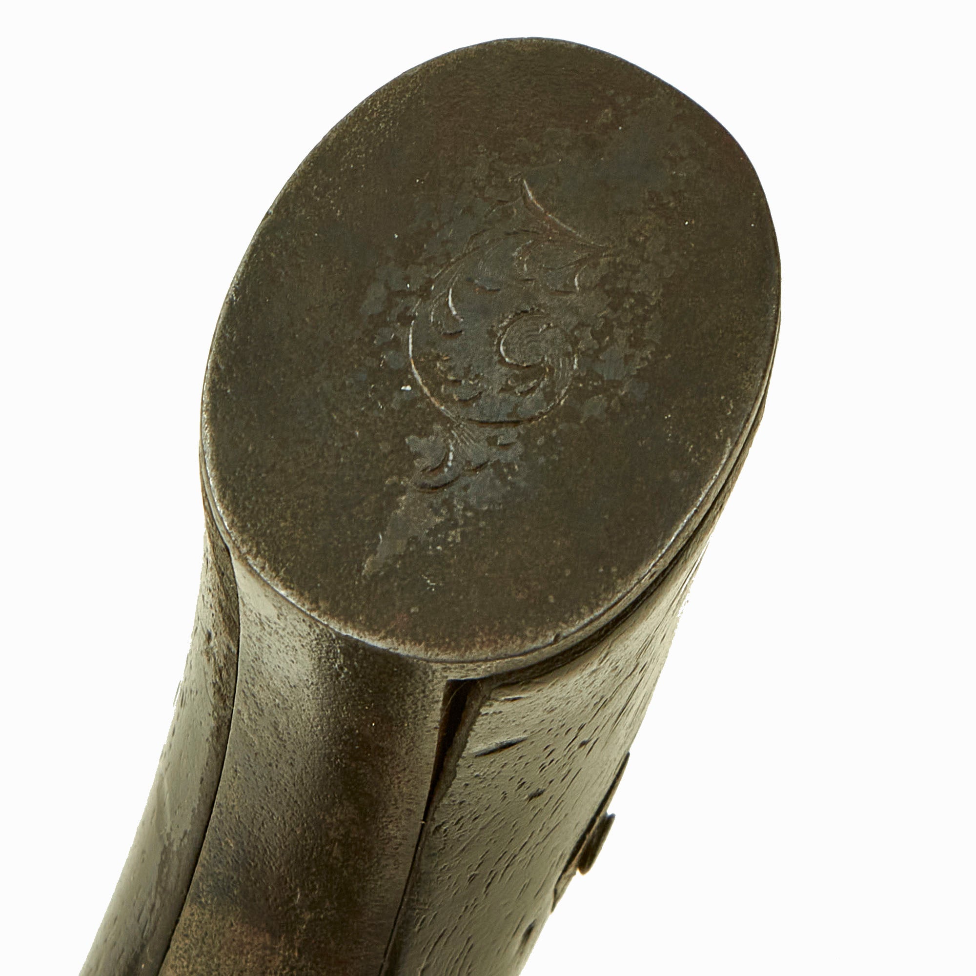 The metalwork on the pistol was probably originally blued or case hardened, but is now faded to a gray patina overall, with areas of light peppering due to powder burn. The sides of the action, the top of the hammer, and the grip backstrap all show lovely hand engraved designs, which are still mostly visible. The grip scales look to be walnut, and have a lovely color and a nice finish. We tested the action, and it functions beautifully, and does not appear to have any issues with indexing or cycling.
