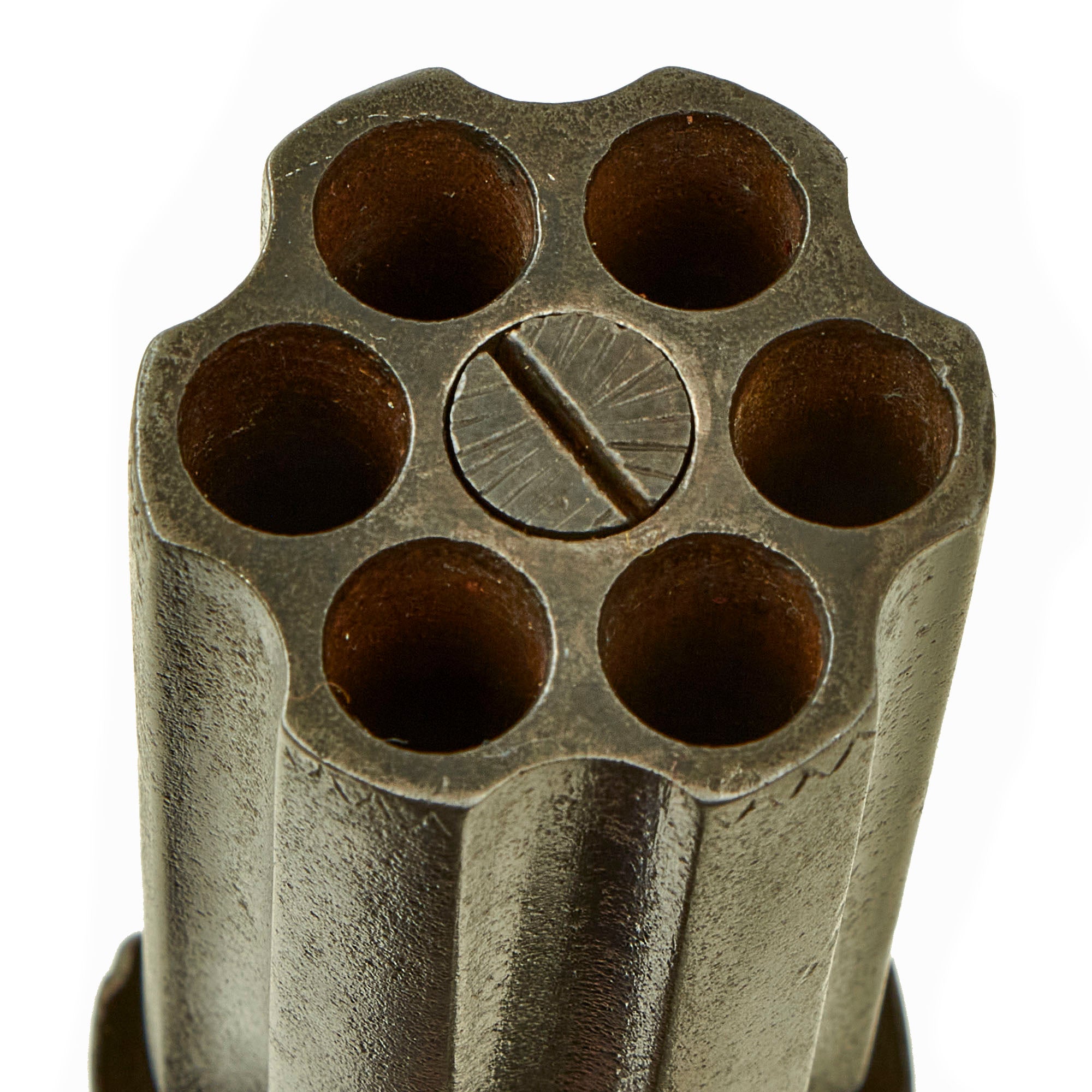 Our example does not have any maker marks on it, as these were usually made with the intention that the retailer would add their own marks to the frame, however that did not happen in this case. The only markings present on the exterior are the CROWN / CROSSED SCEPTERS / B P C "black powder proof" and CROWN / CROSSED SCEPTERS / V "viewed" marks from the city of Birmingham, stamped on the breech end of the cylinder flutes. This city was well known for its firearms industry, which supplied many guns to smaller gun shops and outfitters. There is also the marking IIIIX on the inside of both grips and on end of cylinder, visible when the cylinder is removed.
