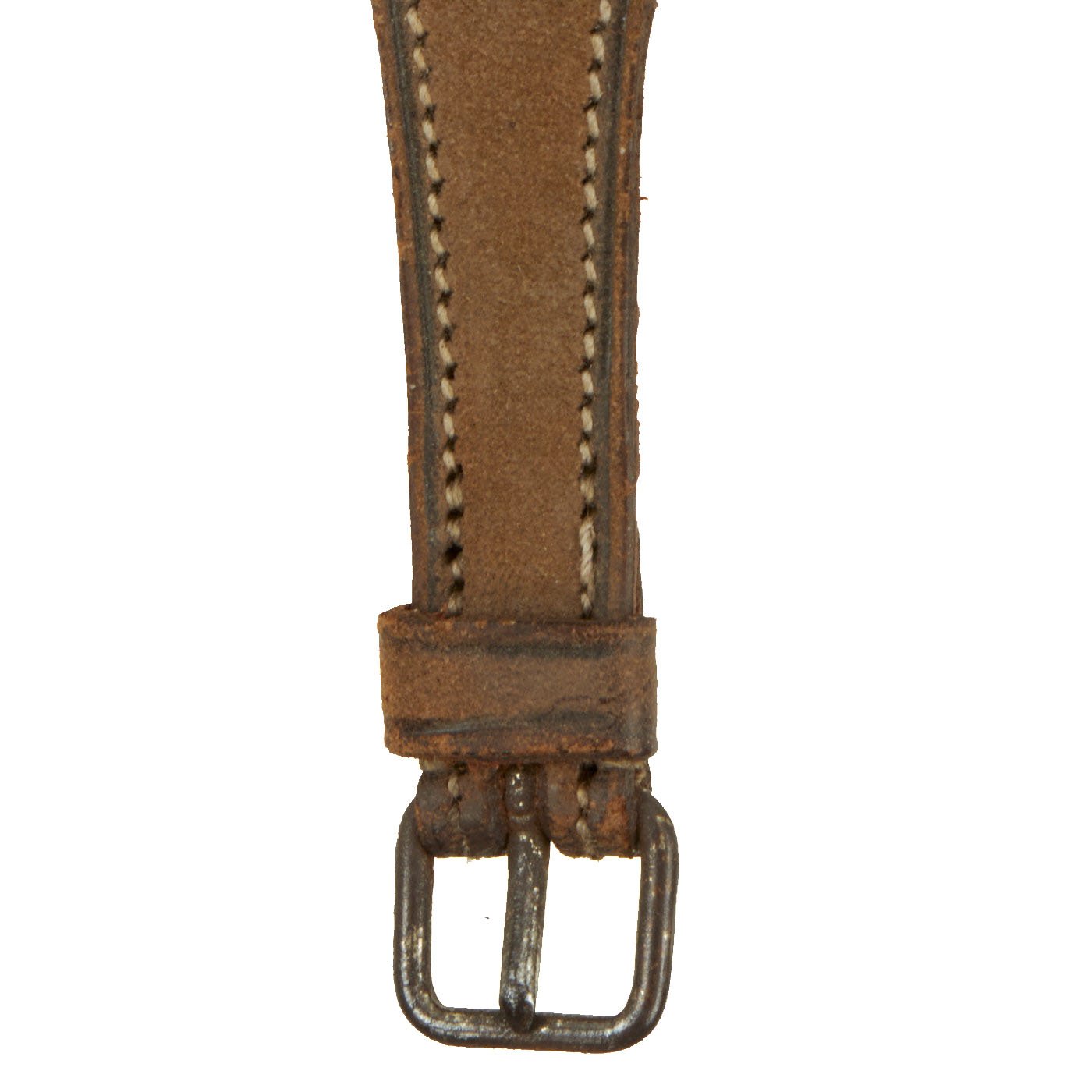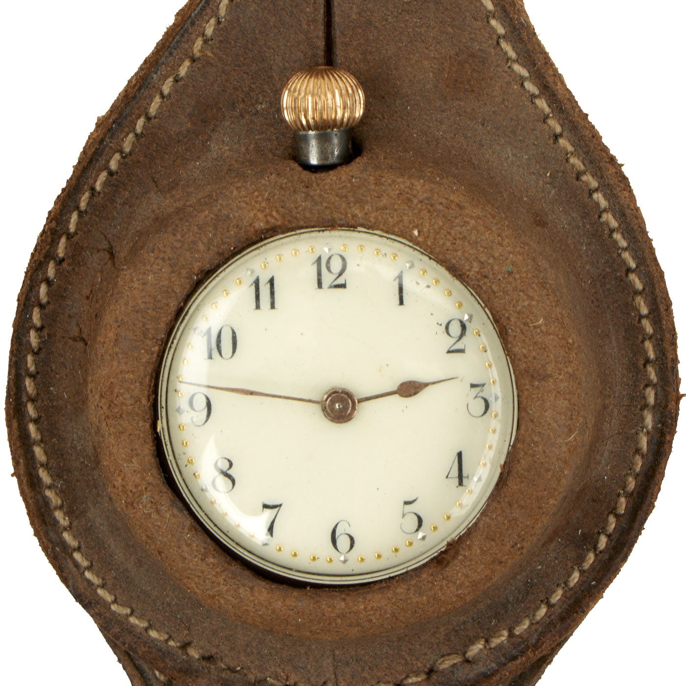 The watch can be removed from the leather band, which has had the stitching completely tear out on one side. The small watch has a blued steel case, with a brass winding dial and time set button. The case on the back opens up as a stand, and is marked on the inside with serial number 50350 20. There are no other markings we can see.