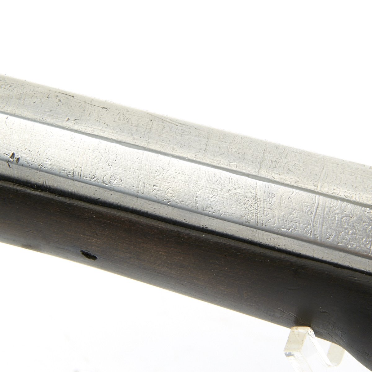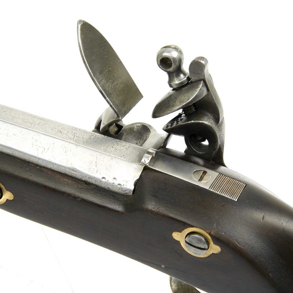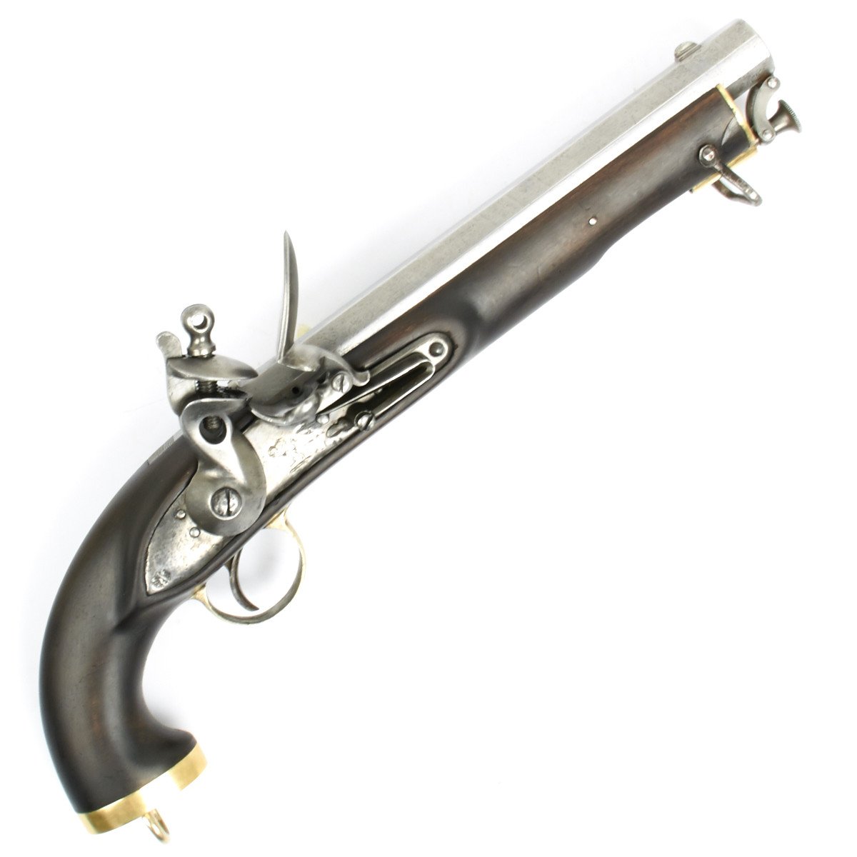 Original Item: Only One Available. This is very unusual, at first glance it appears to be the British East India Company Flintlock Dragoon Pistol, known as the "Baker Pattern" in use between 1819 and 1839. However, one swiftly notes that the pistol has a steel octagonal barrel which upon examination was once a rifled sporting gun barrel cut down with most of the rifling bored out so the smoothbore is now in .75 caliber, the same as a musket and not just .65 bore as was used on pistols.