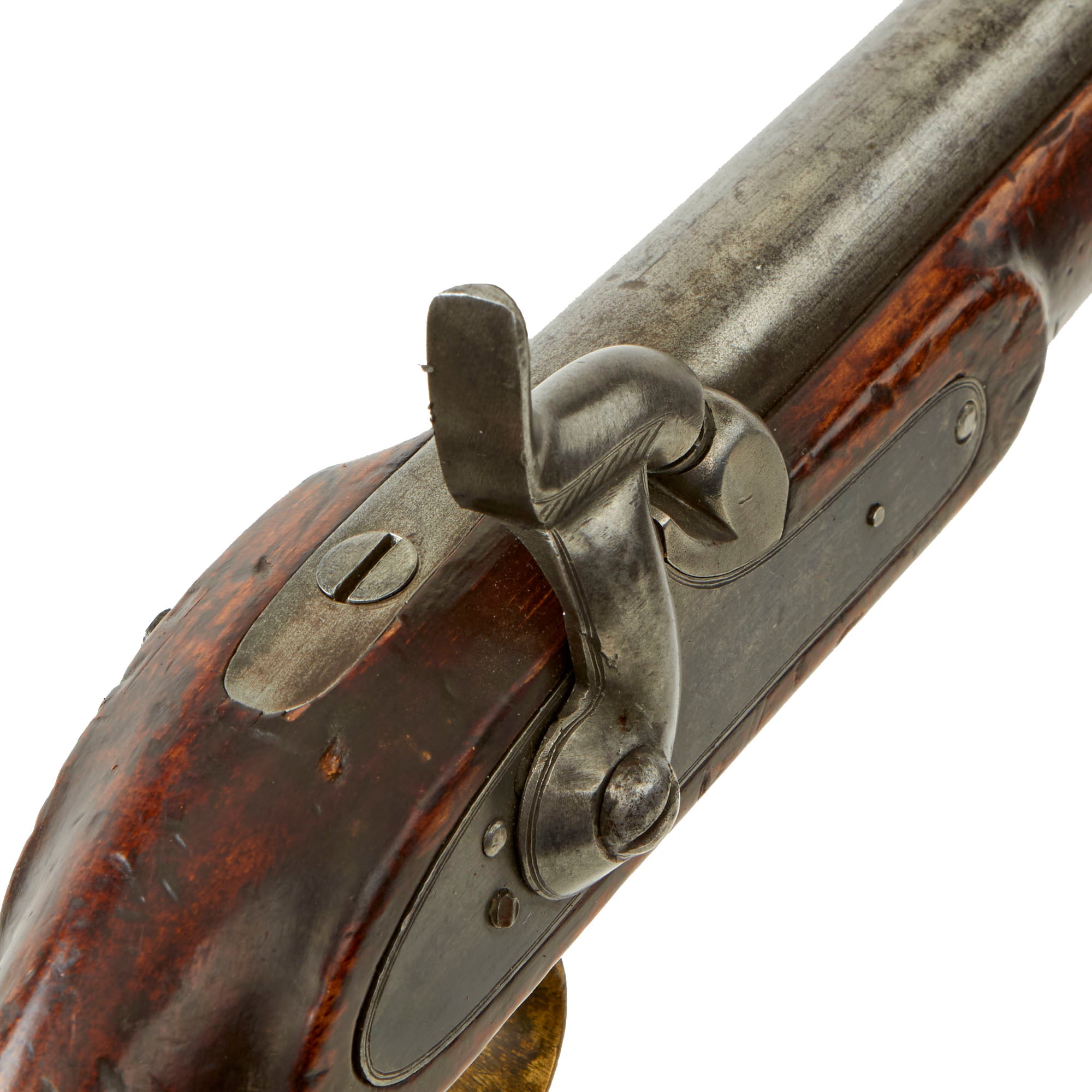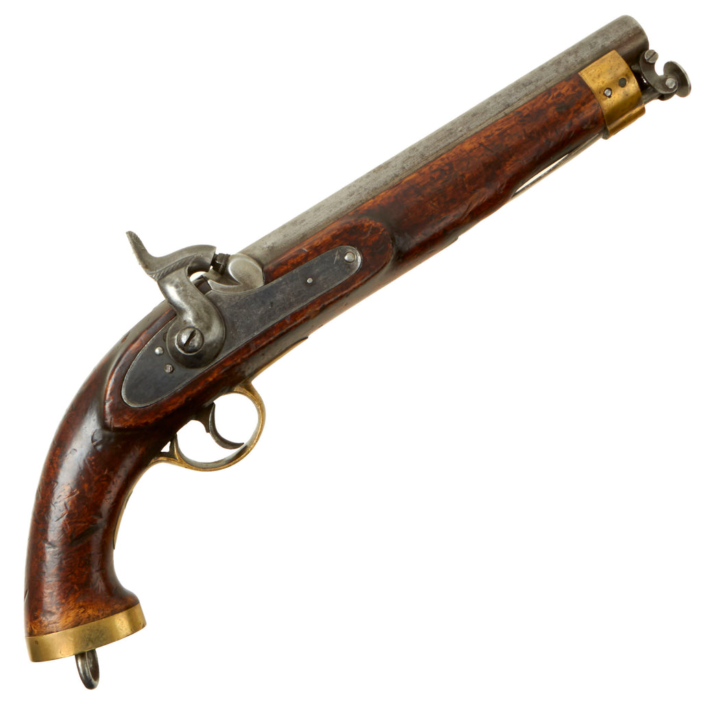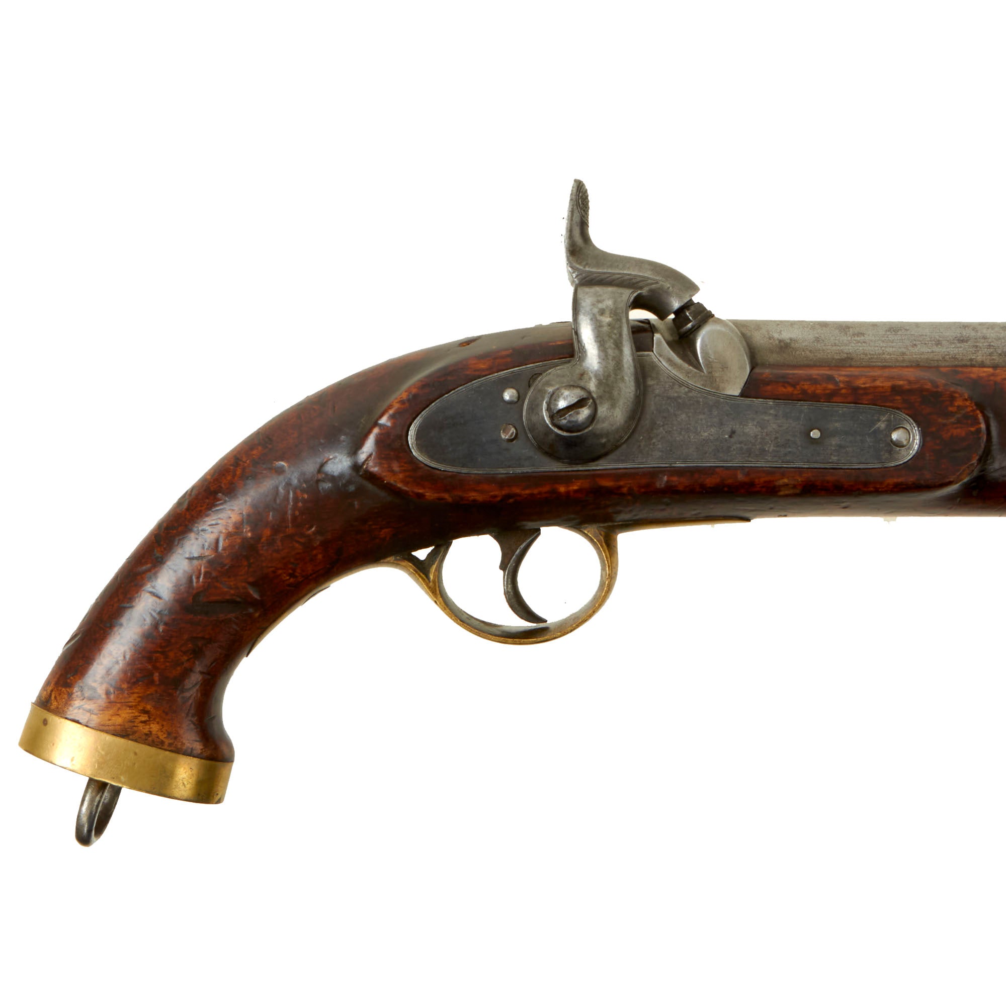 Original Item: Only one available. This is a standard British EIC Cavalry Pistol adopted in 1843, fitted with is known as the "new series side lock". This pistol replaced the Model of 1840 that had the "old series side lock" which appeared (but wasn't) to have been constructed from flintlock parts. This pattern 1843 became the principal handgun of the East India Company up until it was taken over by the British home Government in 1859.