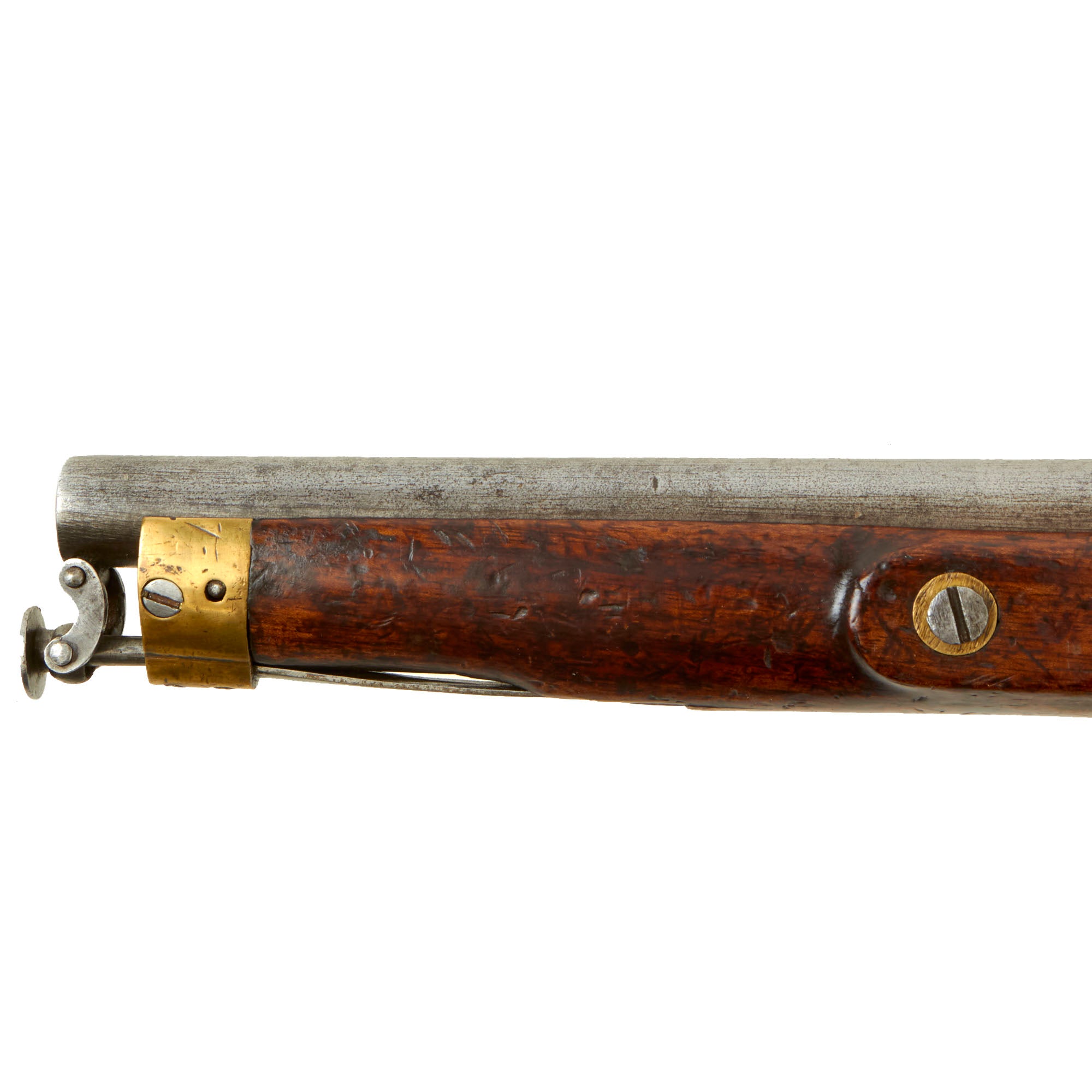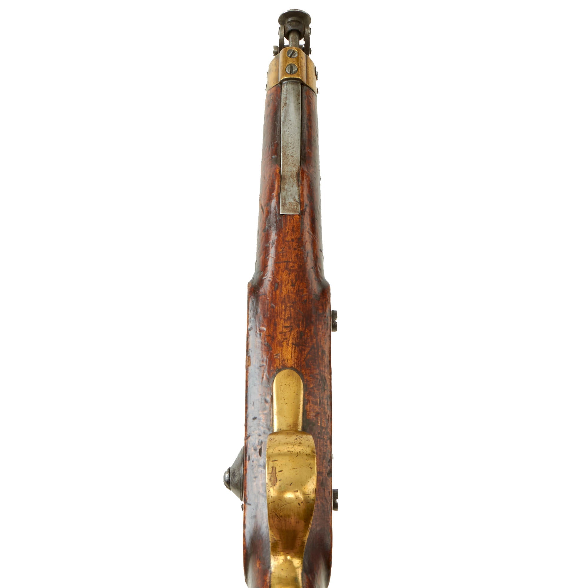 This originated from our Nepalese Palace purchase of 2003, and is completely unmarked on the exterior, indicating that it was gifted to Nepal by the EIC. The intention was most likely that they would mark it themselves, and as it would no longer be EIC property, they did not want their markings on it. It has the correct trapped swivel ramrod for use while mounted on a horse, and the standard lanyard ring on the butt, to keep the pistol itself from being dropped.