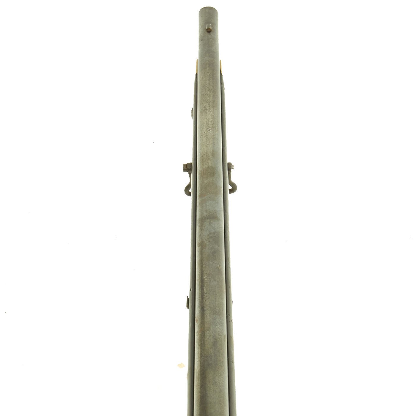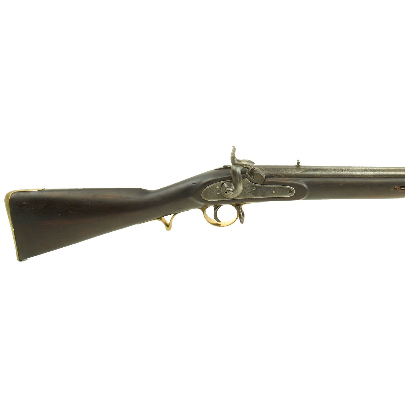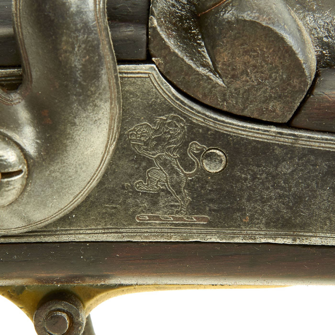Original Item: Only One Available. This is an extremely scarce Sappers and Miners Short Musket of the British East India Company, measuring 49 inches in overall length. Introduced in 1842, it utilizes the traditional musket length Musket Percussion Lock bearing E.I.C. “Rampant Lion Motif”. The quality of the engraving definitely indicates British manufacture, and not local production. Fitted with a 33" barrel, this Musket has all brass mounts; butt plate, no throat pipe, two ramrod pipes and Nose Cap. The brass trigger guard has the scroll grip behind the trigger guard itself simulating a "pistol grip" effect.
