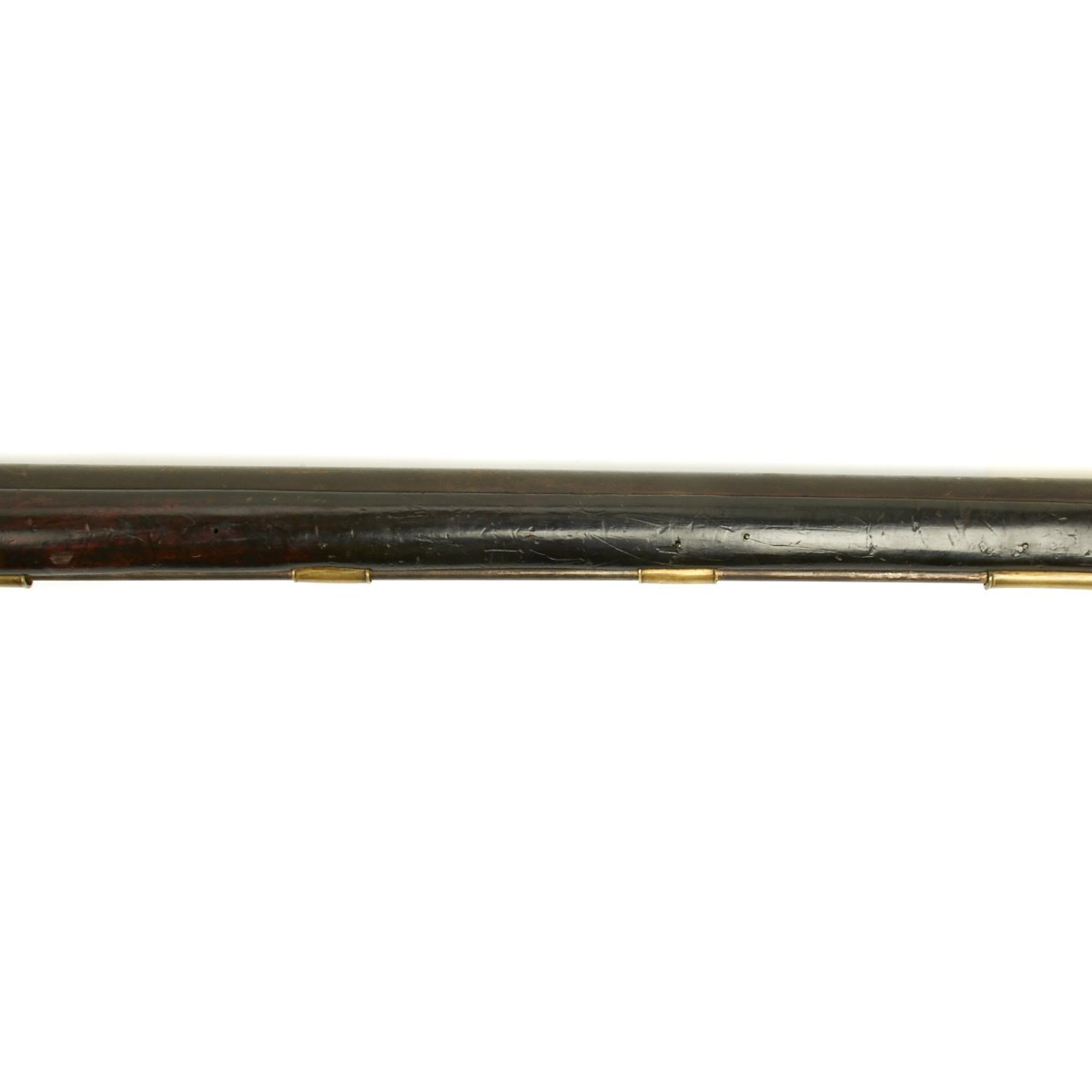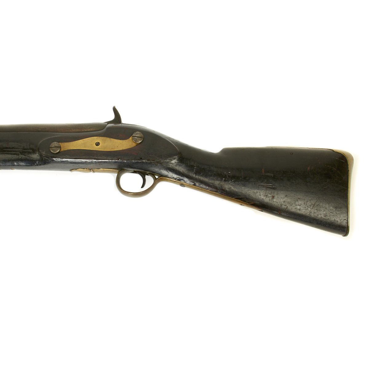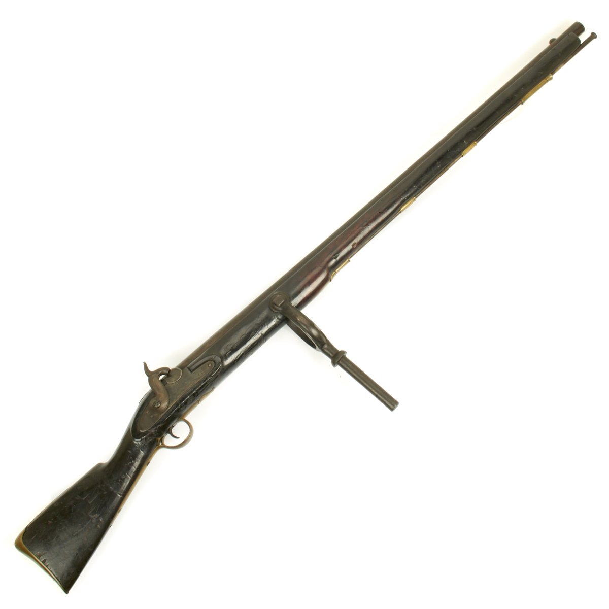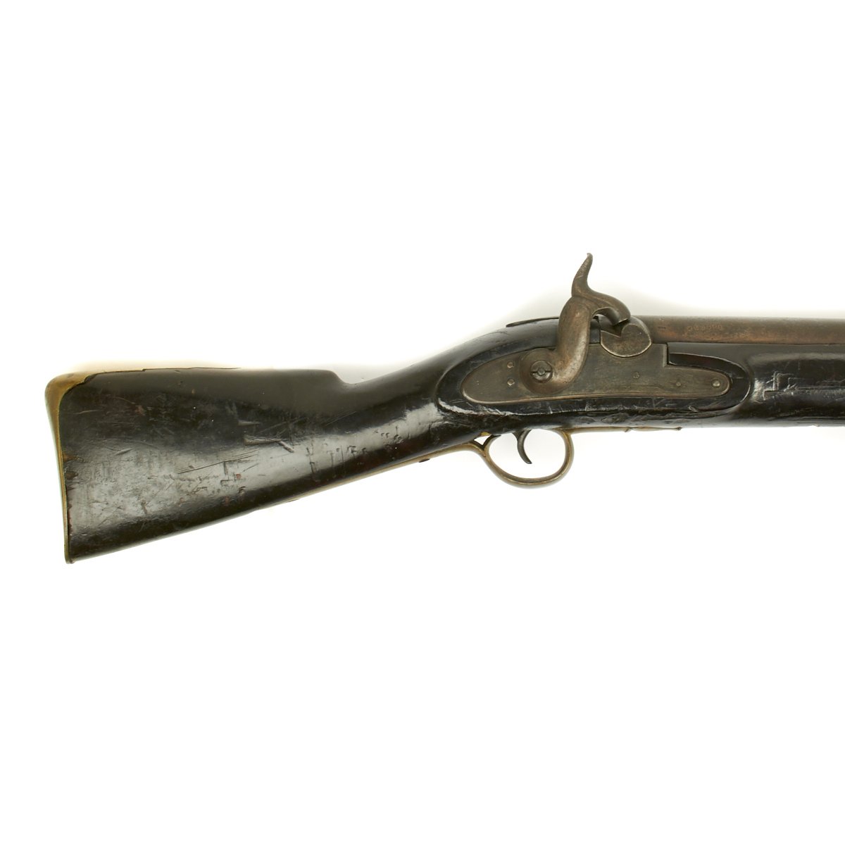 Officially ordered by the BRITISH EAST INDIA COMPANY this is a fine example in approximately 5 BORE (15/16 inch). This configuration was made between 1840 and 1852 and designated the PATTERN 96. The heavy barrel measures 54 inches in length, as compared to a standard musket barrel of 39 inches. The Lock measures 8 3/4" X 1 3/4" and has a double line engraved around the edge. Its style is referred to as "Old Style" and appears to be a conversion from Flintlock, but that was NOT the case as these were all purpose built as Percussion weapons. There are FOUR Ram Rod pipes, including the tail pipe, and like the massive trigger guard, butt plate and side plate are made of brass.
