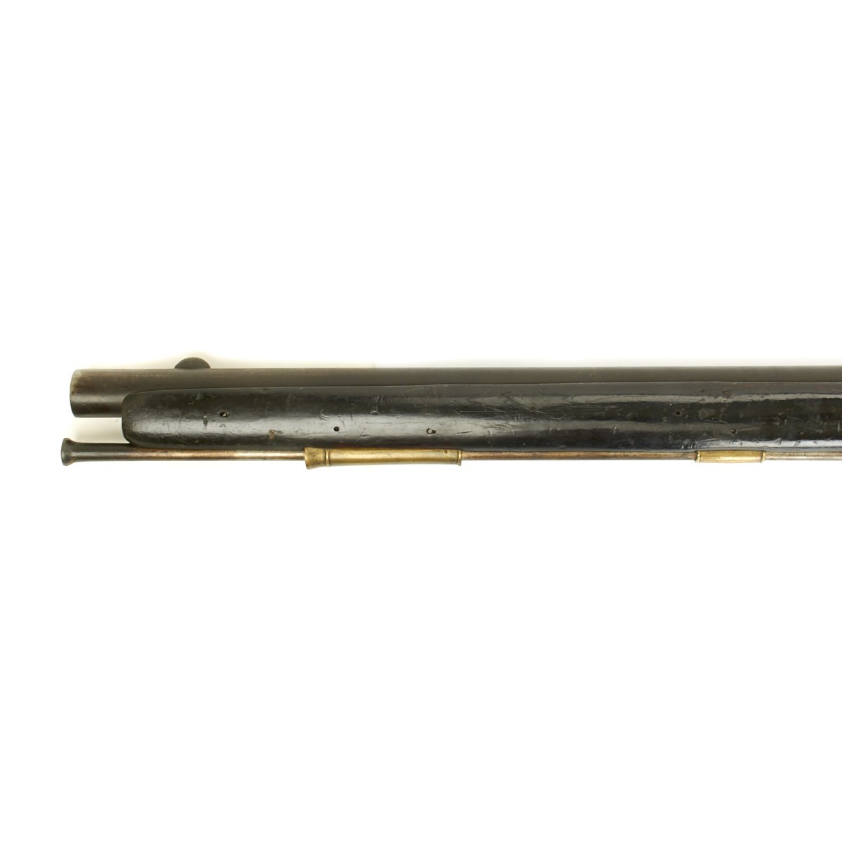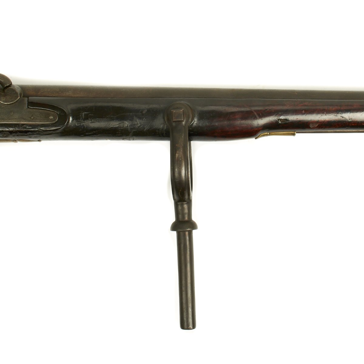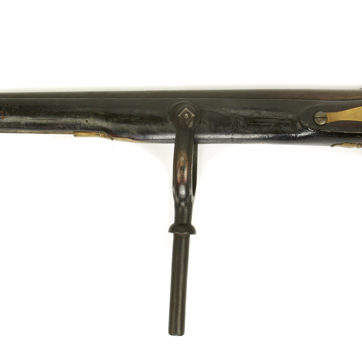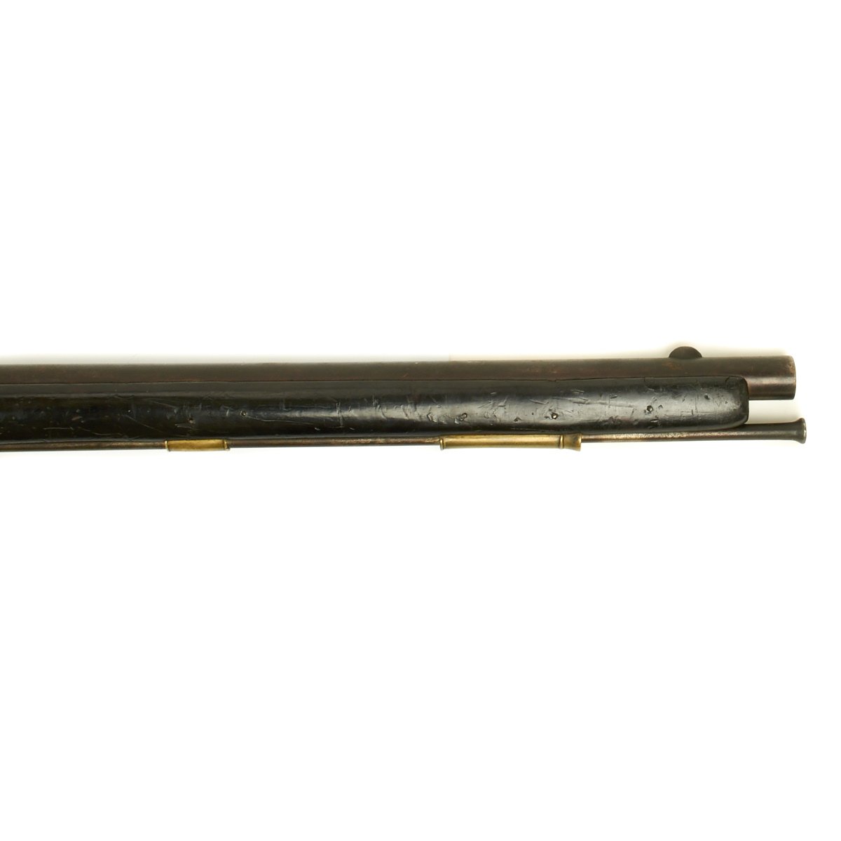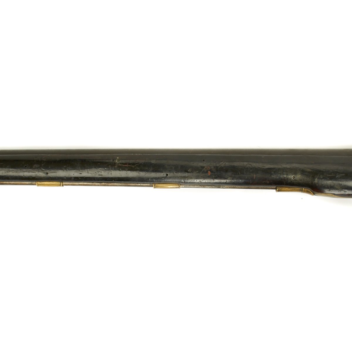 Officially ordered by the BRITISH EAST INDIA COMPANY this is a fine example in approximately 5 BORE (15/16 inch). This configuration was made between 1840 and 1852 and designated the PATTERN 96. The heavy barrel measures 54 inches in length, as compared to a standard musket barrel of 39 inches. The Lock measures 8 3/4" X 1 3/4" and has a double line engraved around the edge. Its style is referred to as "Old Style" and appears to be a conversion from Flintlock, but that was NOT the case as these were all purpose built as Percussion weapons. There are FOUR Ram Rod pipes, including the tail pipe, and like the massive trigger guard, butt plate and side plate are made of brass.