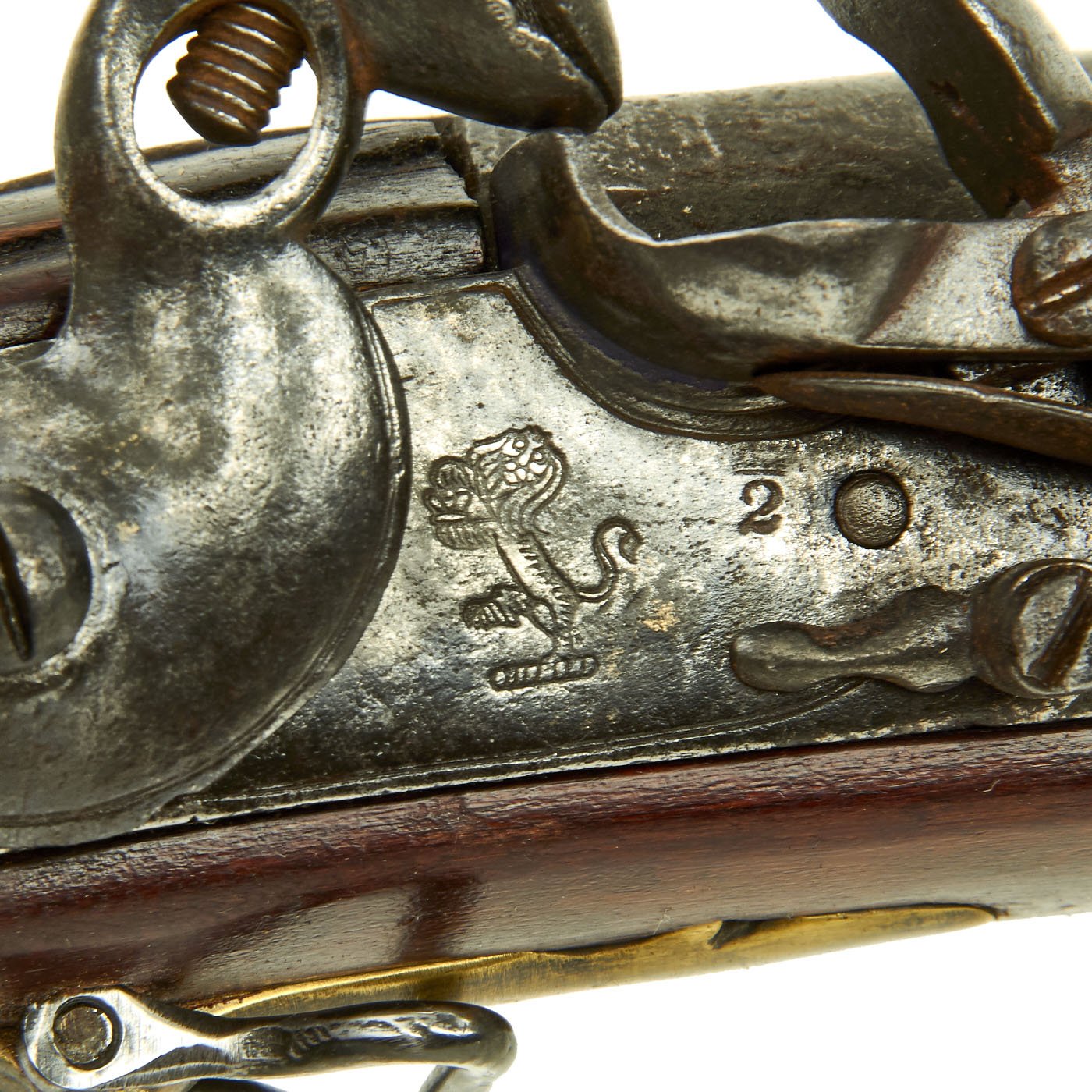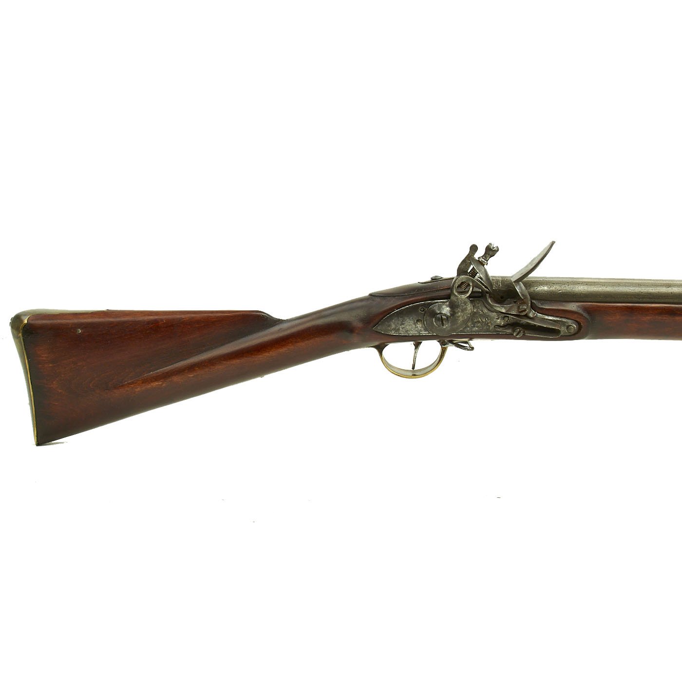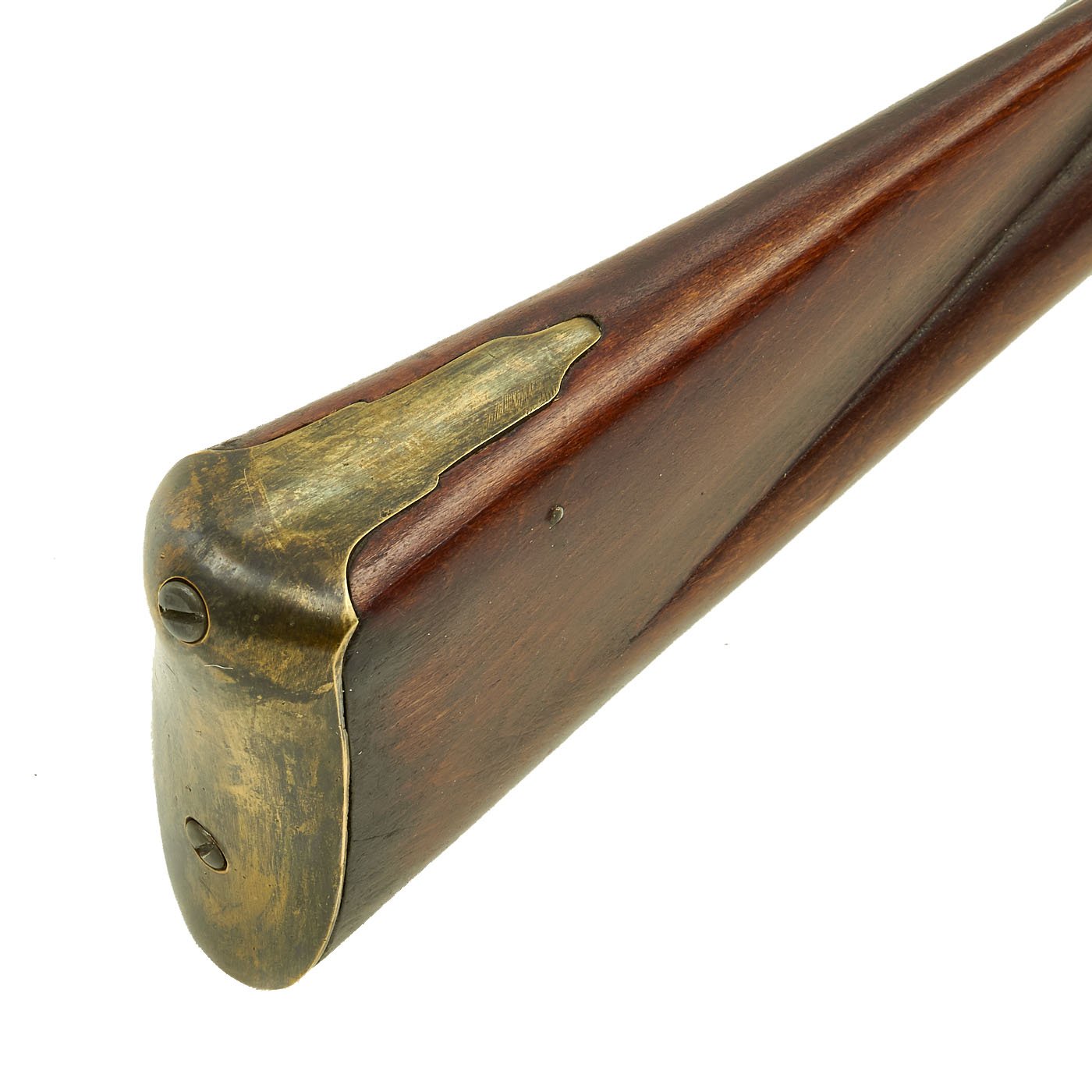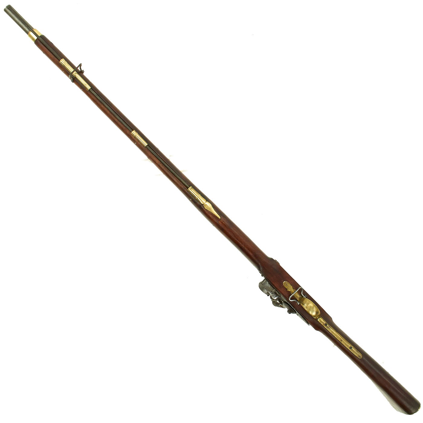 Here we have an original BRITISH EAST INDIA COMPANY, English made 3rd Model BROWN BESS MUSKET displaying the relevant EIC Musket features. Notably the barrel tang is rounded and there is an EIC HEART LOGO stamped into the barrel itself. This mark is between the London Proofhouse CROWN / CP black powder proof and CROWN / V viewed marks. The lock is East India Company marked, however this is a replacement post-1808 Mechanism showing the EIC Rampant Lion Logo and dated 1815. It functions correctly, holding at half cock and firing at full.
