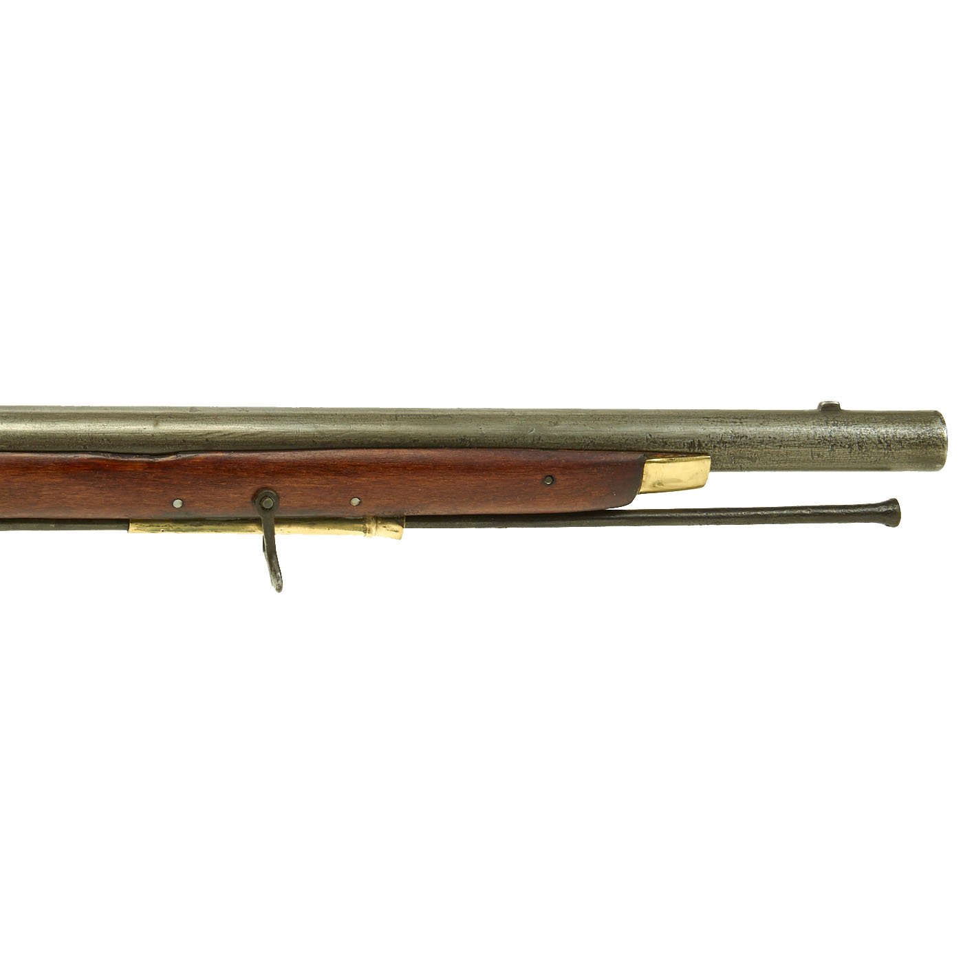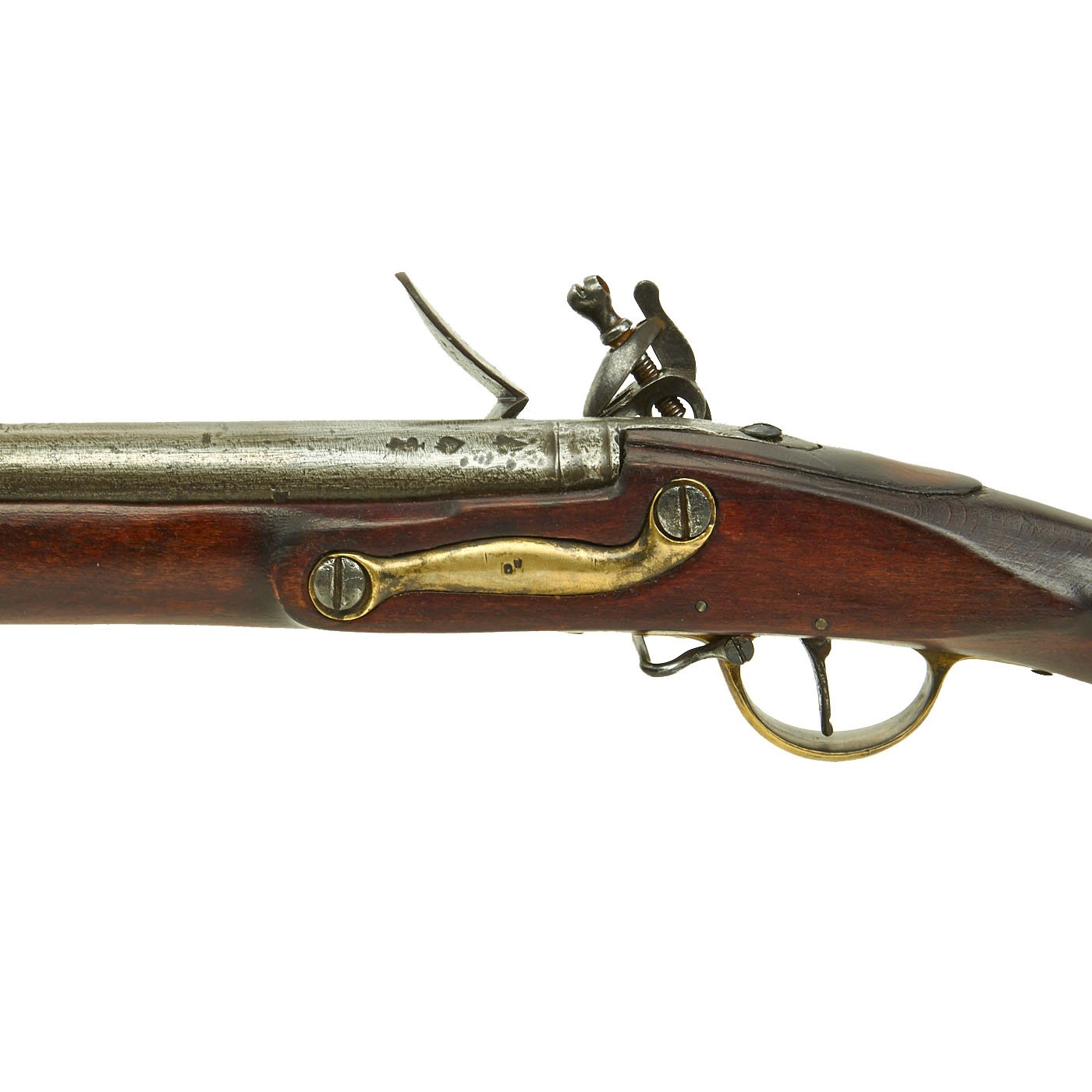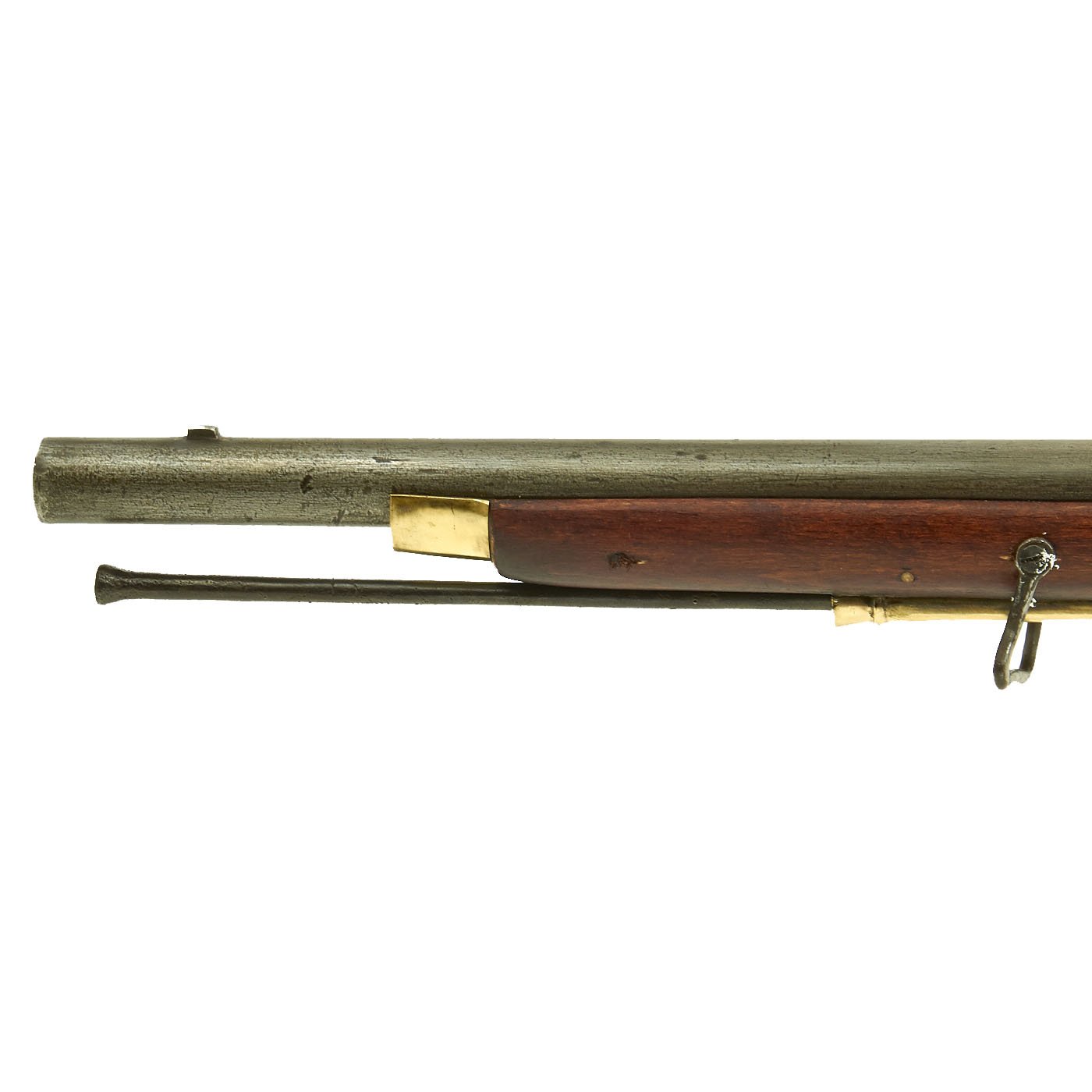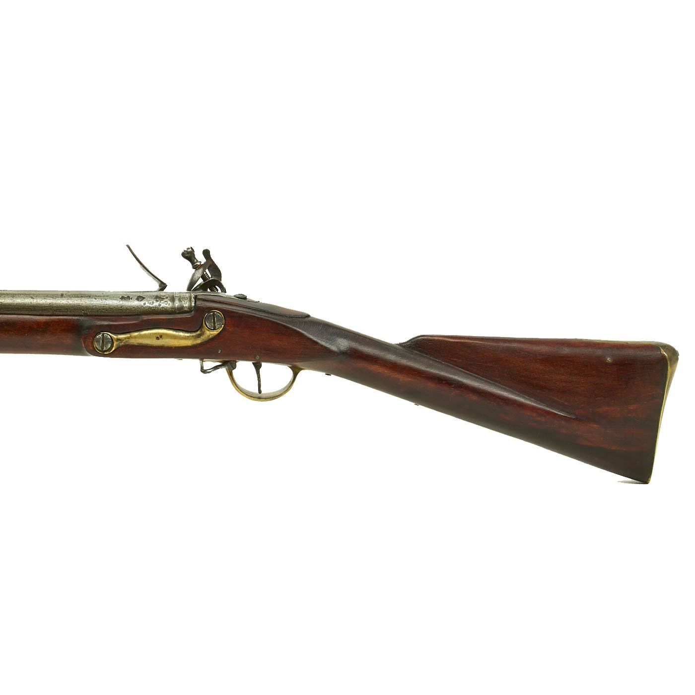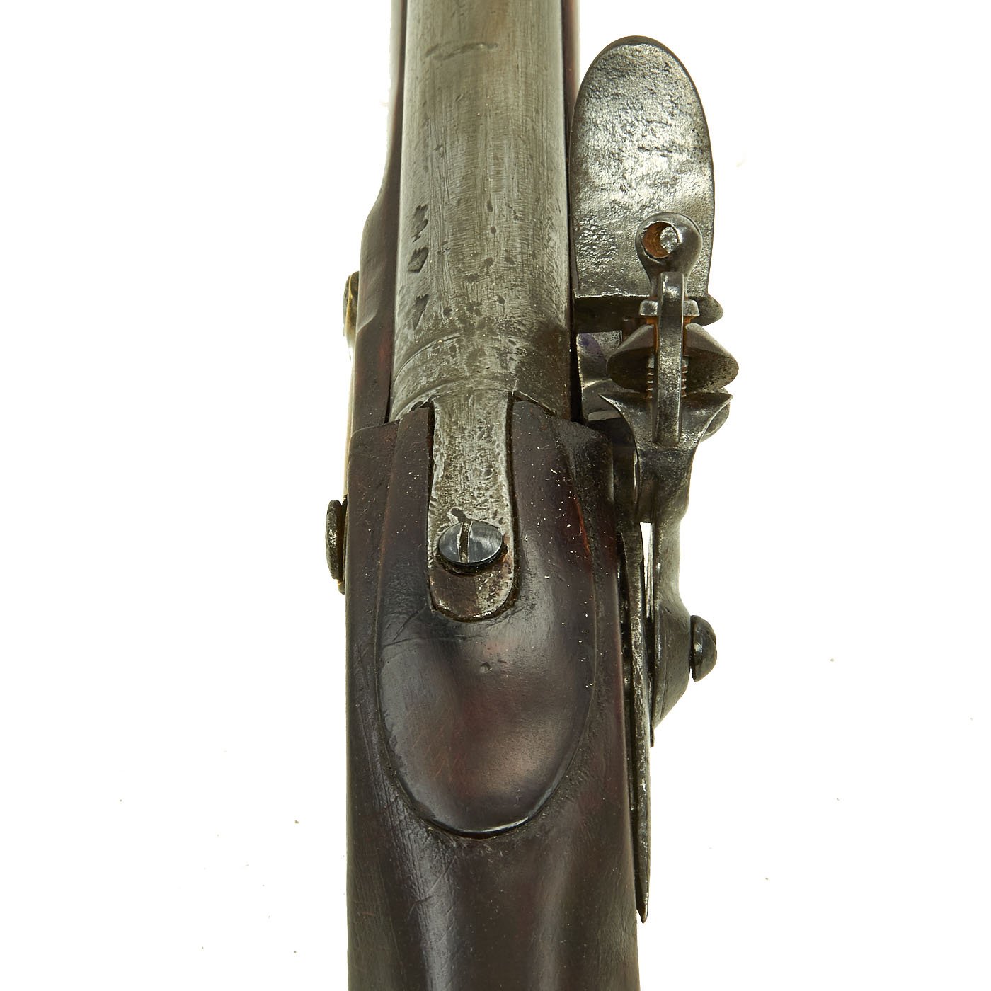 Here we have an original BRITISH EAST INDIA COMPANY, English made 3rd Model BROWN BESS MUSKET displaying the relevant EIC Musket features. Notably the barrel tang is rounded and there is an EIC HEART LOGO stamped into the barrel itself. This mark is between the London Proofhouse CROWN / CP black powder proof and CROWN / V viewed marks. The lock is East India Company marked, however this is a replacement post-1808 Mechanism showing the EIC Rampant Lion Logo and dated 1815. It functions correctly, holding at half cock and firing at full.