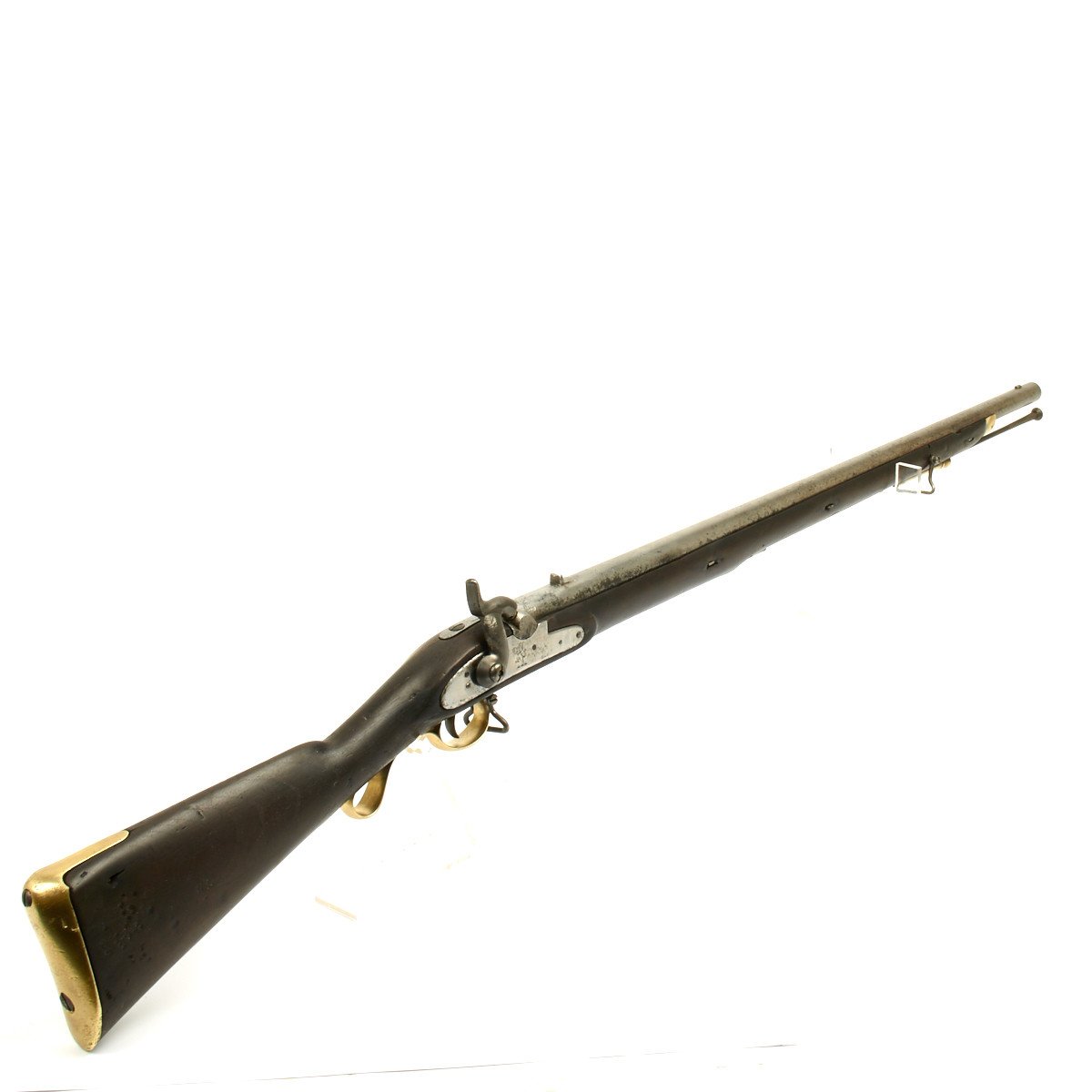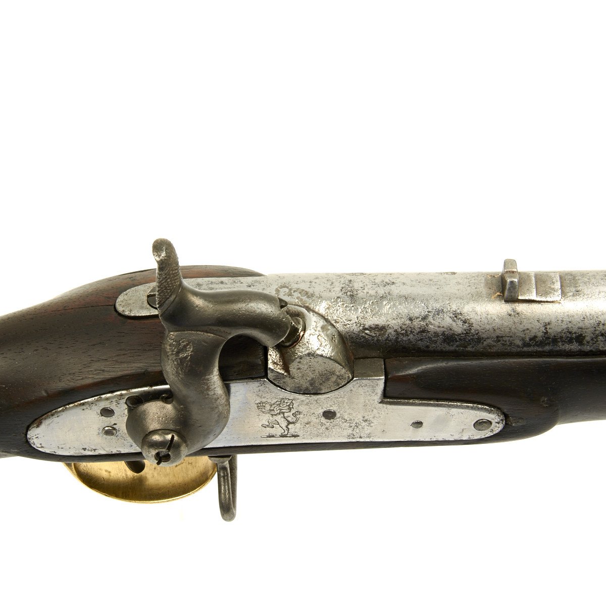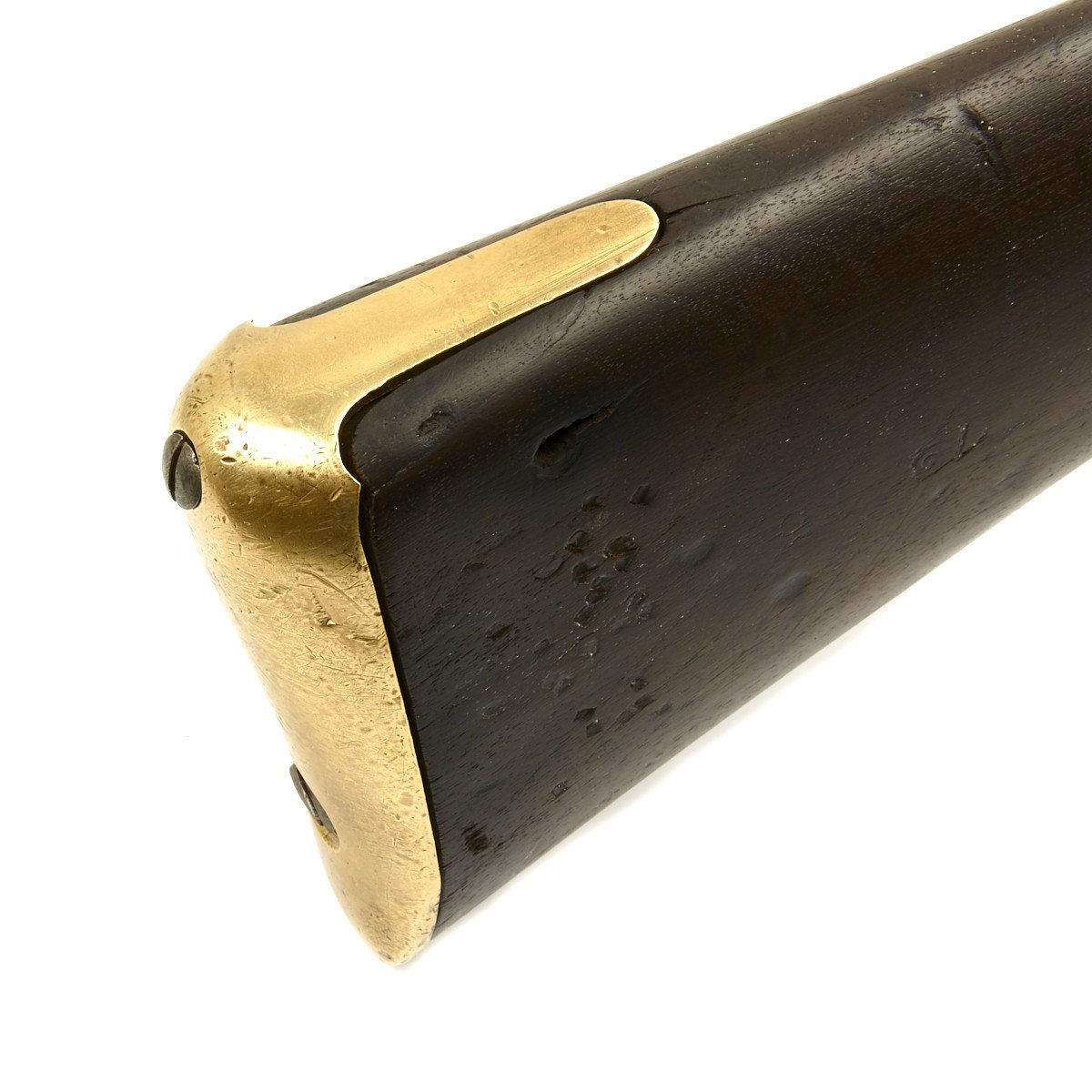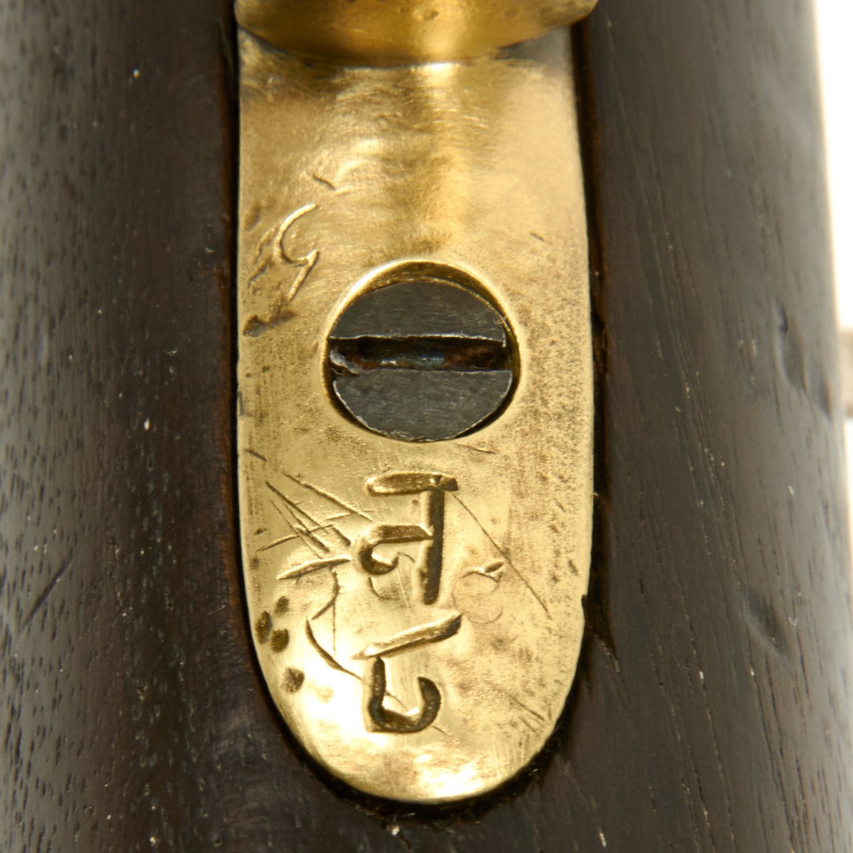 This example, offered in cleaned and complete condition, is either the first variant (Type 1 1840-41) due to its style of trigger guard, lack of a hanoverian bayonet catch, old series sidelock and other characteristics. It features a British proofed barrel and lock marked with the EIC Lion.