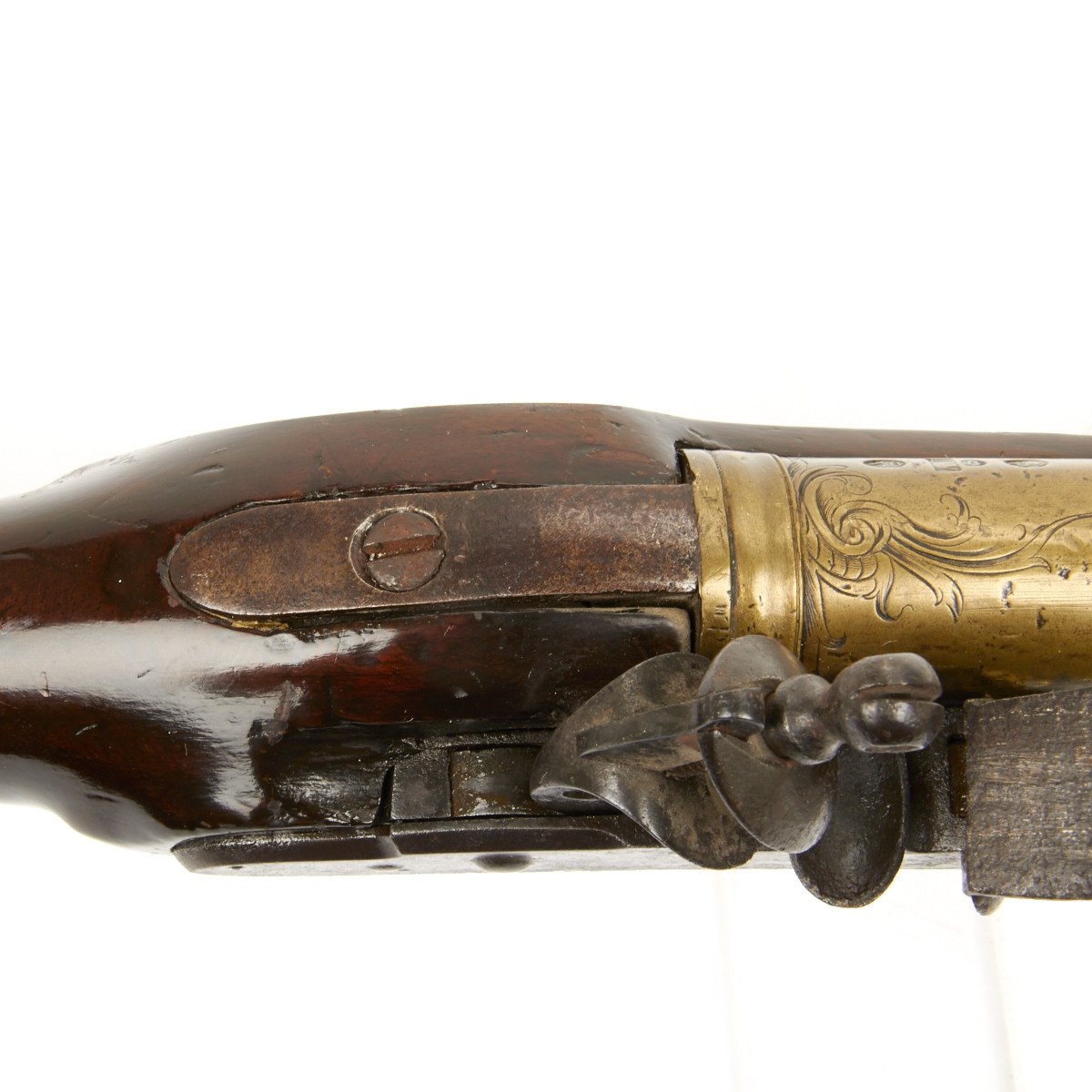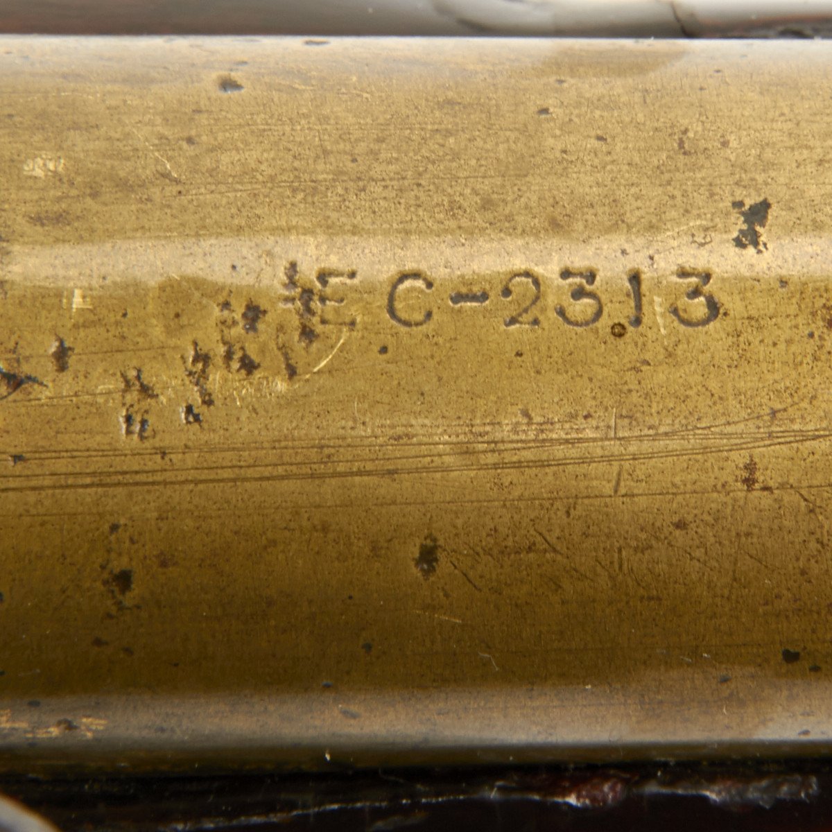 The 15-inch Brass Blunderbuss barrel with canon type muzzle bears correct British proof marks, some decorative engraving and Irish census markings, EC-2313, from the Napoleonic Wars period of about 1805. The furniture is all brass and the original ramrod is still present. This really is a peach, not only fabulously rare but offered in sleeper-untouched condition, the way we all just love to find them.