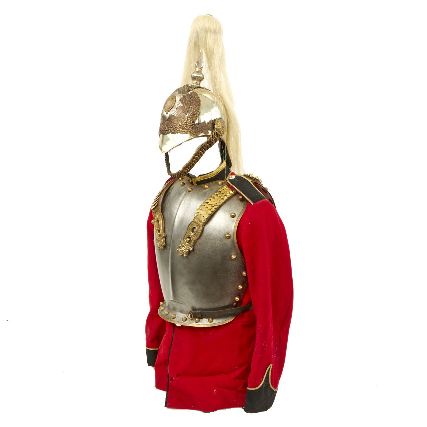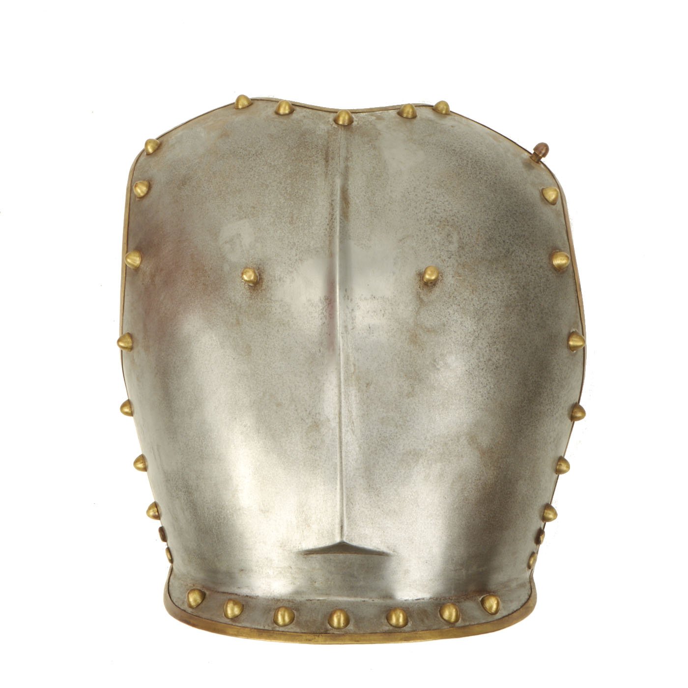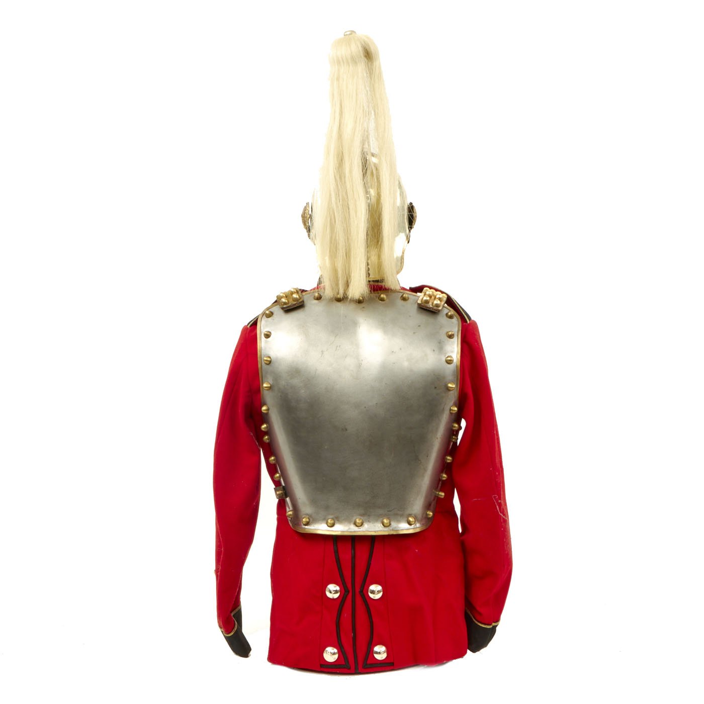 This very nice British Life Guards of the Household Cavalry set consists of a helmet, cuirass armor and tunic, long left in an attic. Here is a cuirass set of breast and back plate together with its original over the shoulder scaled shoulder straps. the edges of the armor set with multiple brass studs.
