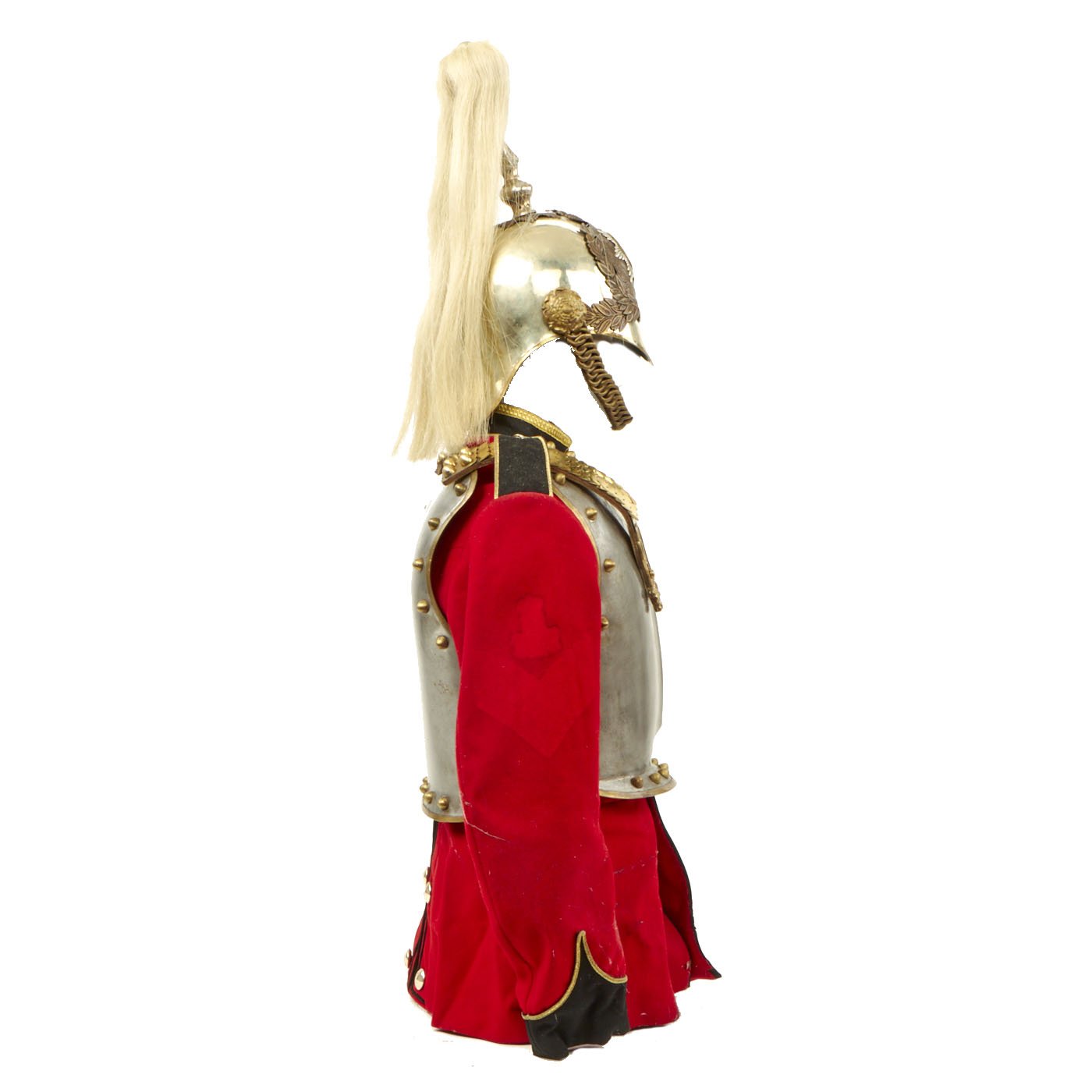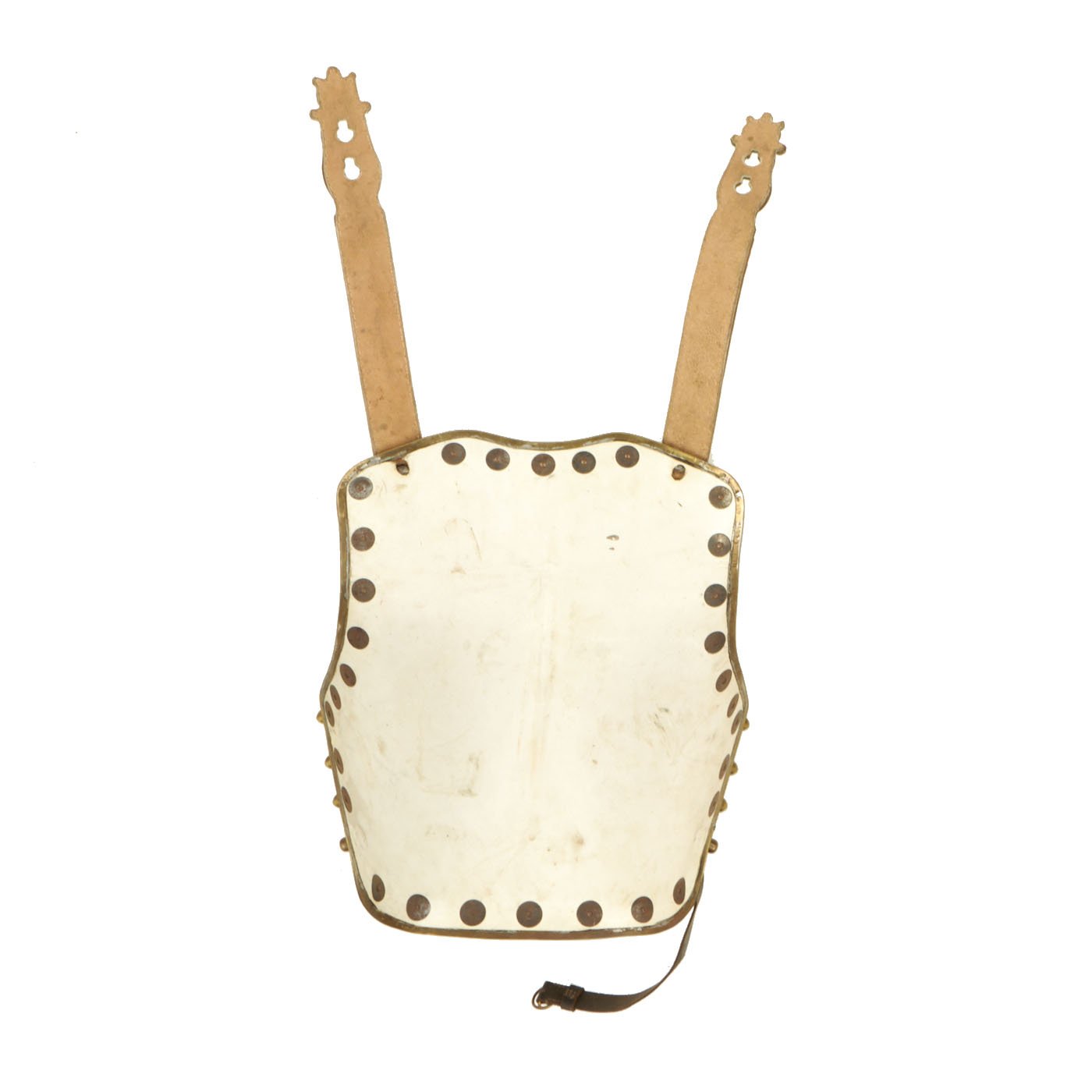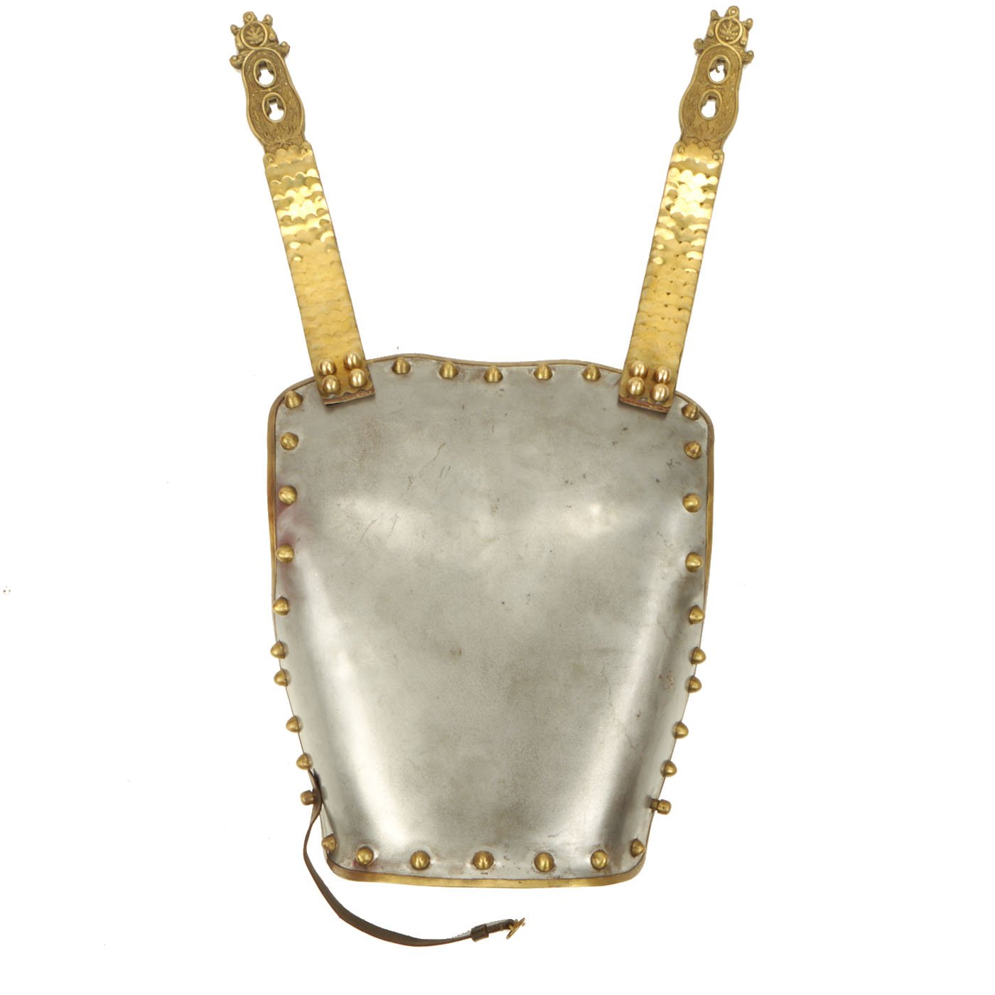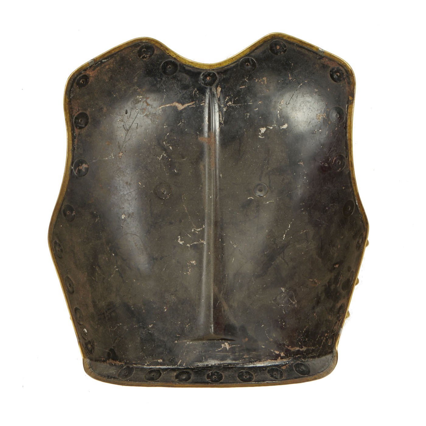 This very nice British Life Guards of the Household Cavalry set consists of a helmet, cuirass armor and tunic, long left in an attic. Here is a cuirass set of breast and back plate together with its original over the shoulder scaled shoulder straps. the edges of the armor set with multiple brass studs.