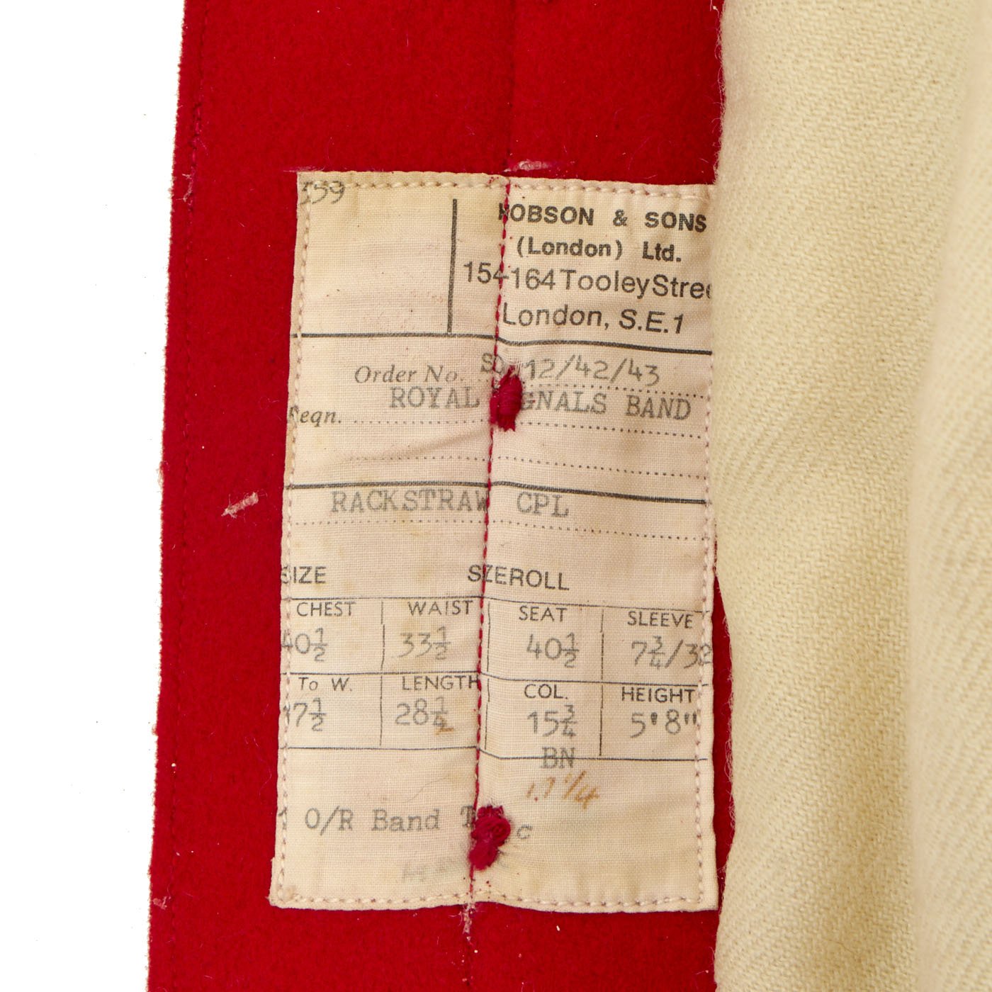 On the tunic's interior there is still the maker's label on the tunic lining stating the tunic was made for a ROYAL SIGNALS BAND member, but does not give his name. It gives the specific of the fit, and specifies that it is an O / R Band Tunic, for “Other Ranks” such as enlisted men and NCOs.