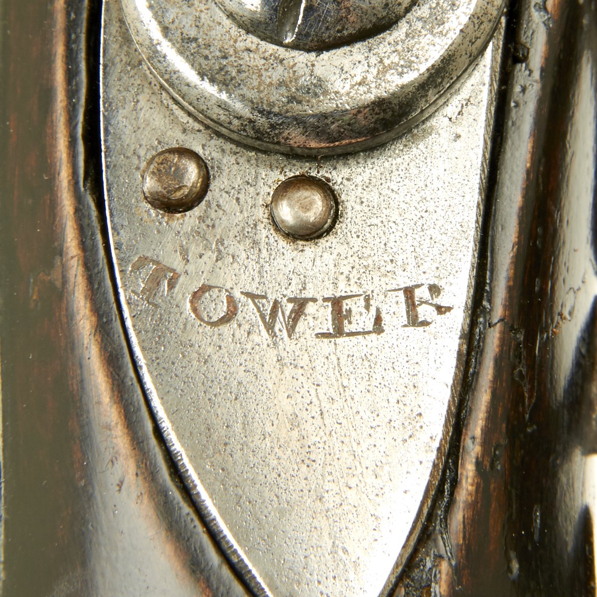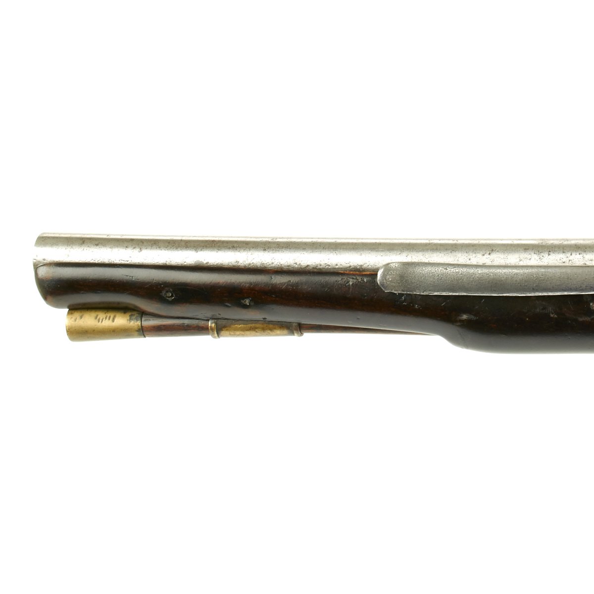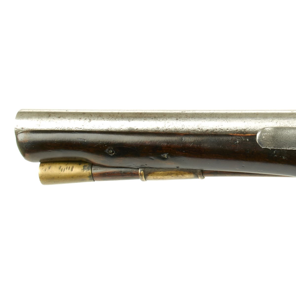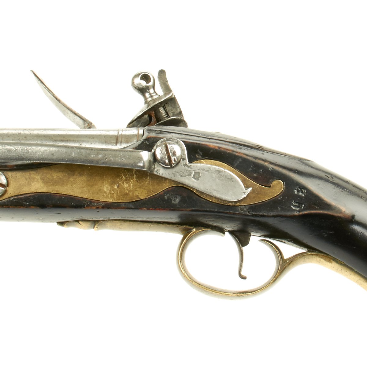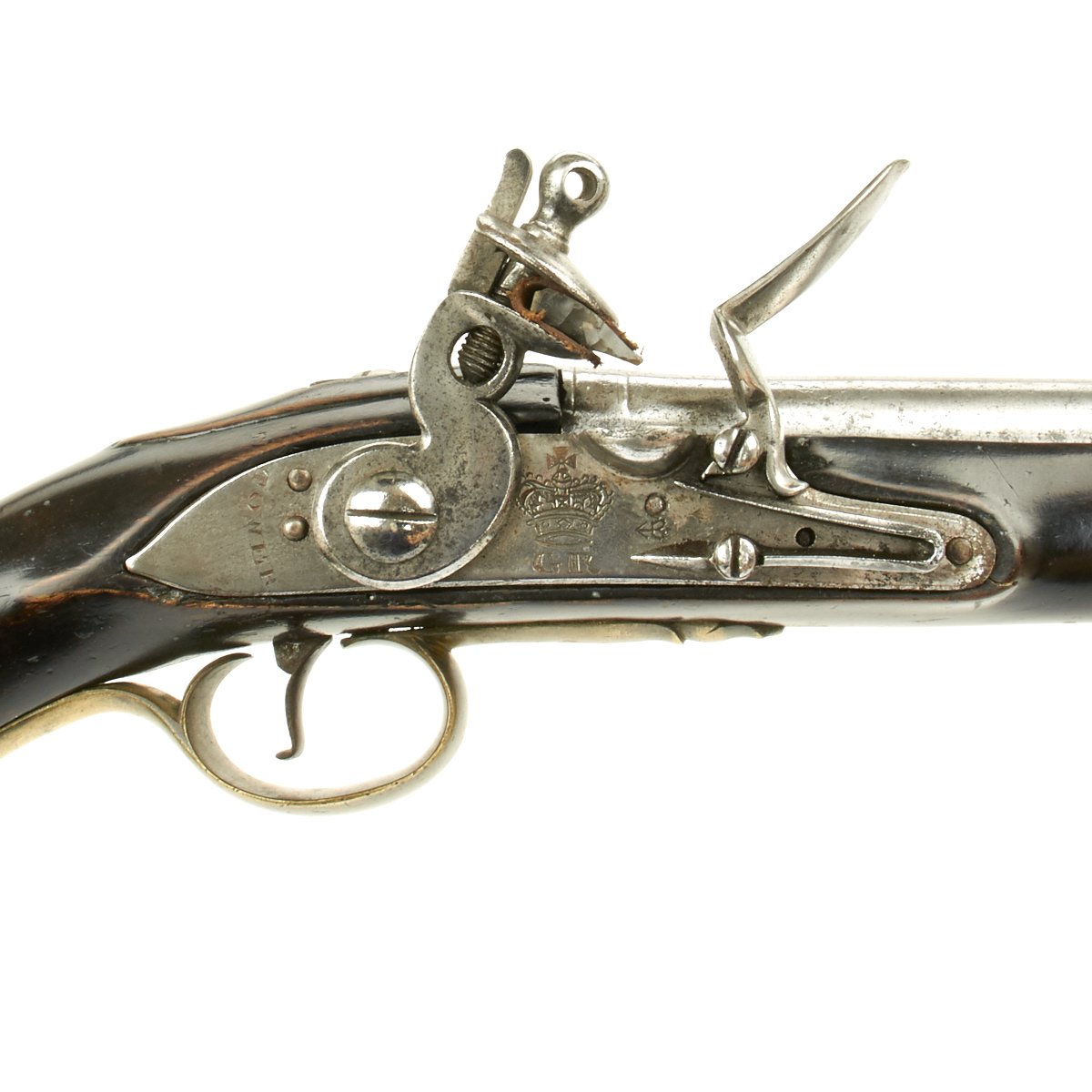 The lock is marked with a Crown over "G.R." with "TOWER" across the lock's tail. It is complete with all brass mounts and ramrod is present, as is the belt hook. This is an earlier model than usually encountered, as the powder pan does NOT have reinforcing arm that supports the outside of the frizzen. Before 1764 the locks were dated with a contractor's name and after 1769 the outside frizzen reinforcement supporting bar was introduced. This model saw service all through the Revolutionary War and the great Sea Battles with the French right up until the Battle of TRAFALGAR in 1805. Overall length of pistol is approximately 19 inches, with a 12 inch barrel.