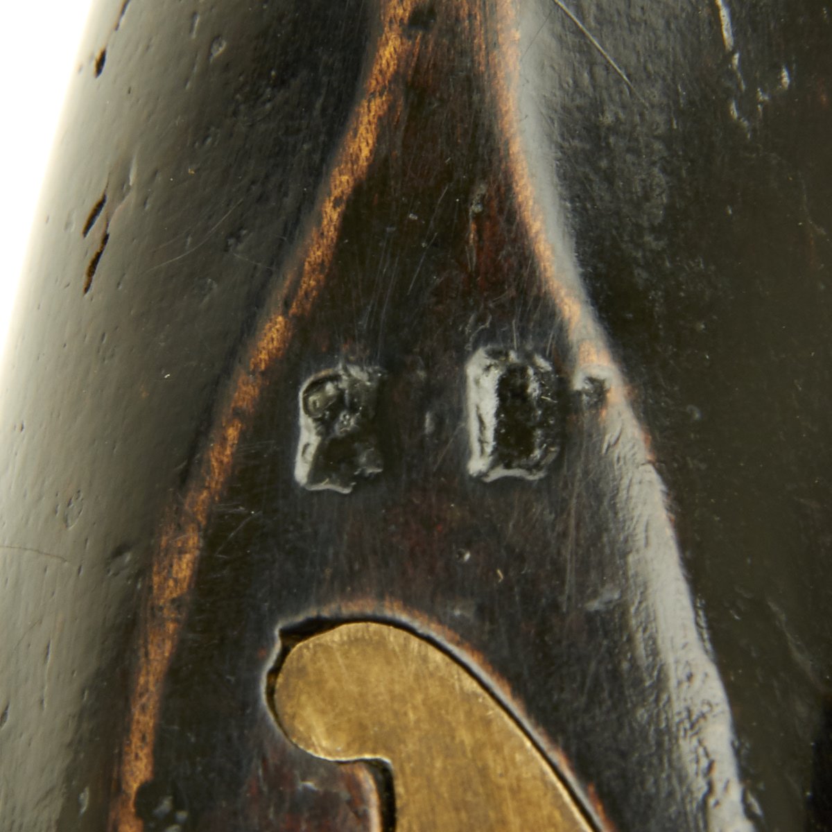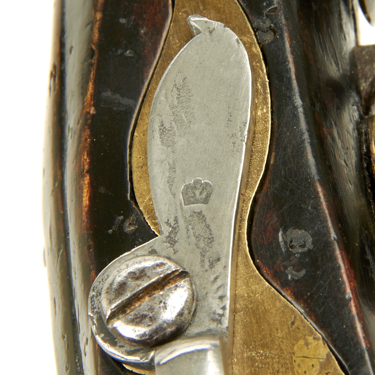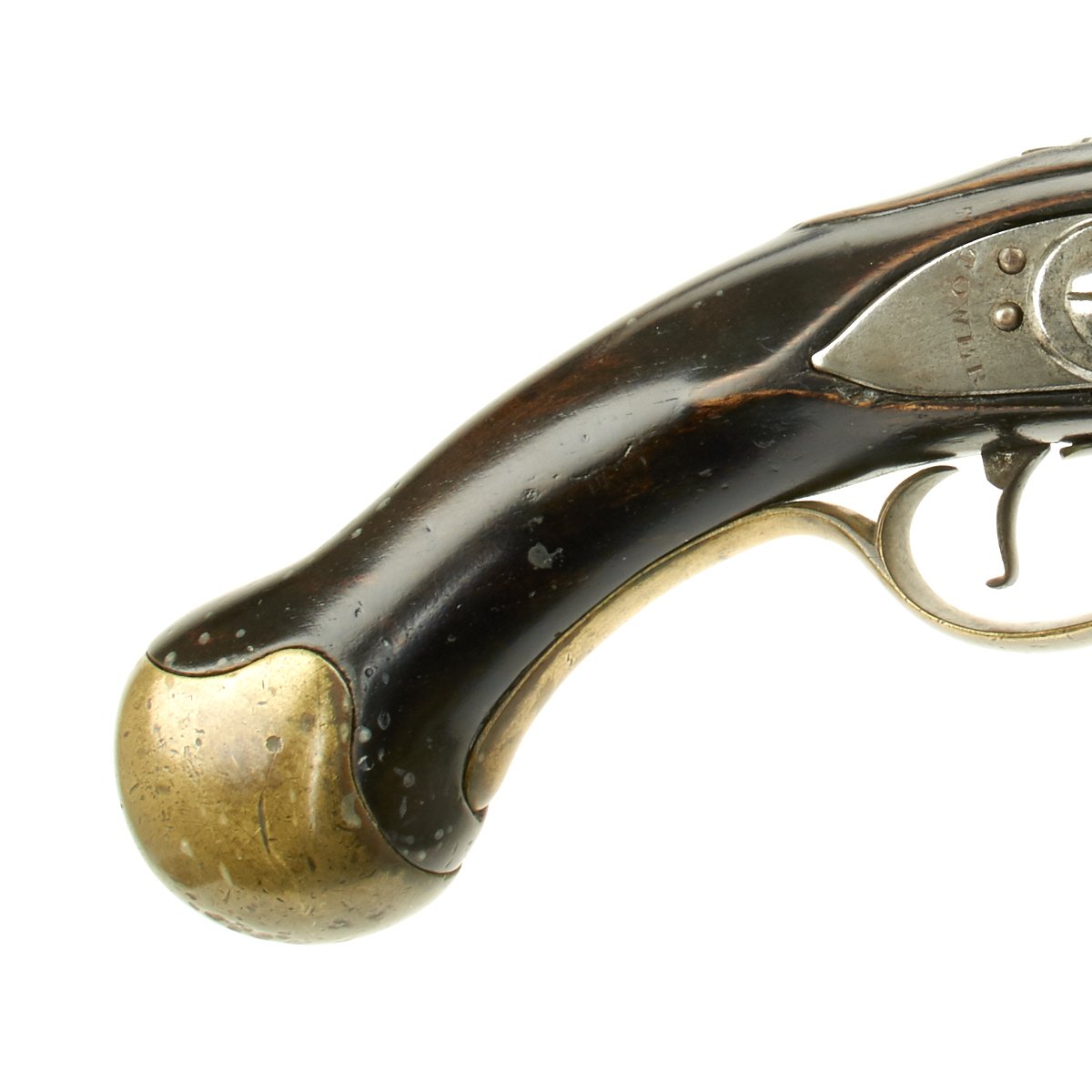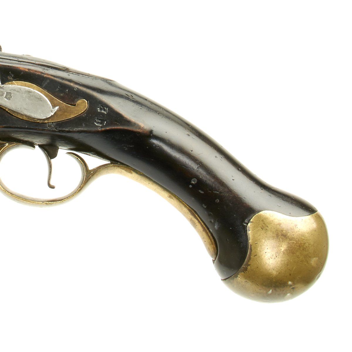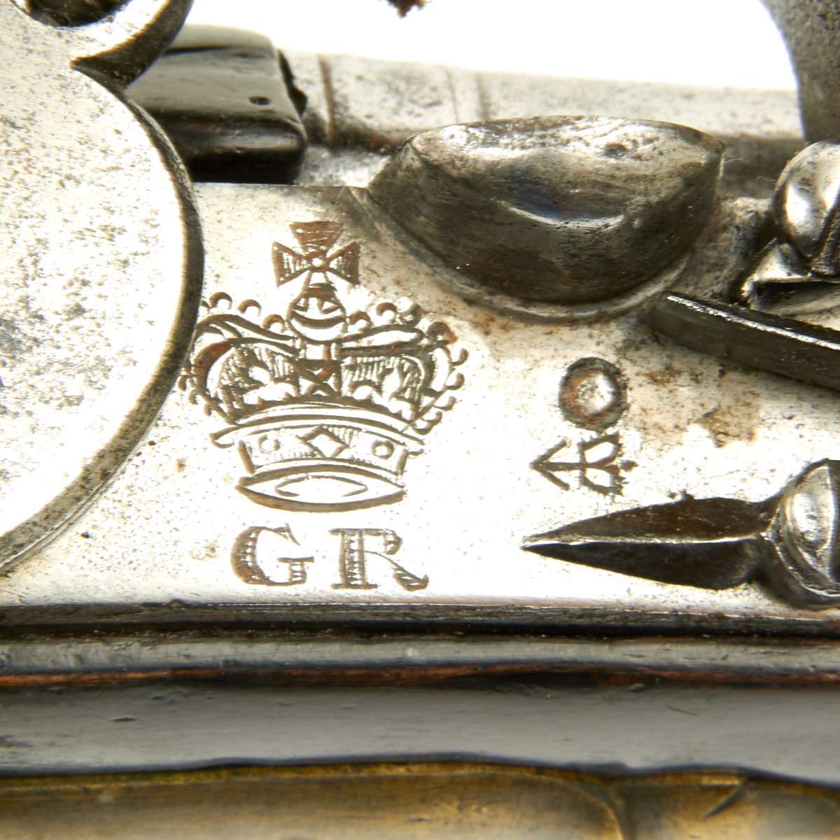 The lock is marked with a Crown over "G.R." with "TOWER" across the lock's tail. It is complete with all brass mounts and ramrod is present, as is the belt hook. This is an earlier model than usually encountered, as the powder pan does NOT have reinforcing arm that supports the outside of the frizzen. Before 1764 the locks were dated with a contractor's name and after 1769 the outside frizzen reinforcement supporting bar was introduced. This model saw service all through the Revolutionary War and the great Sea Battles with the French right up until the Battle of TRAFALGAR in 1805. Overall length of pistol is approximately 19 inches, with a 12 inch barrel.
