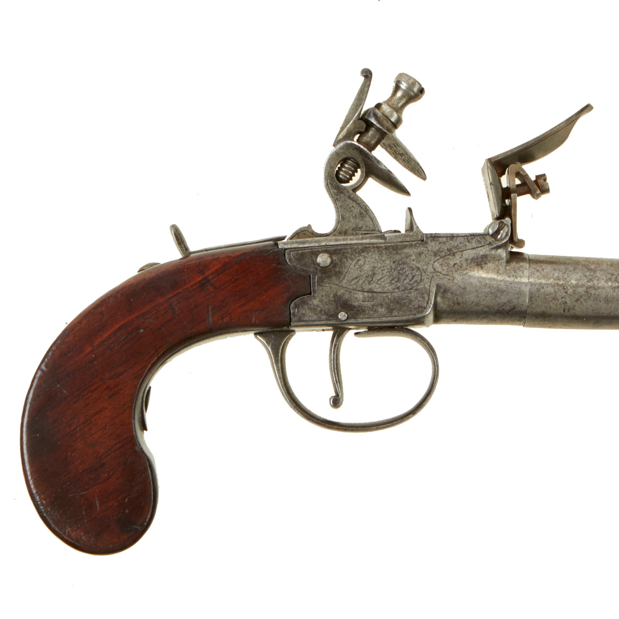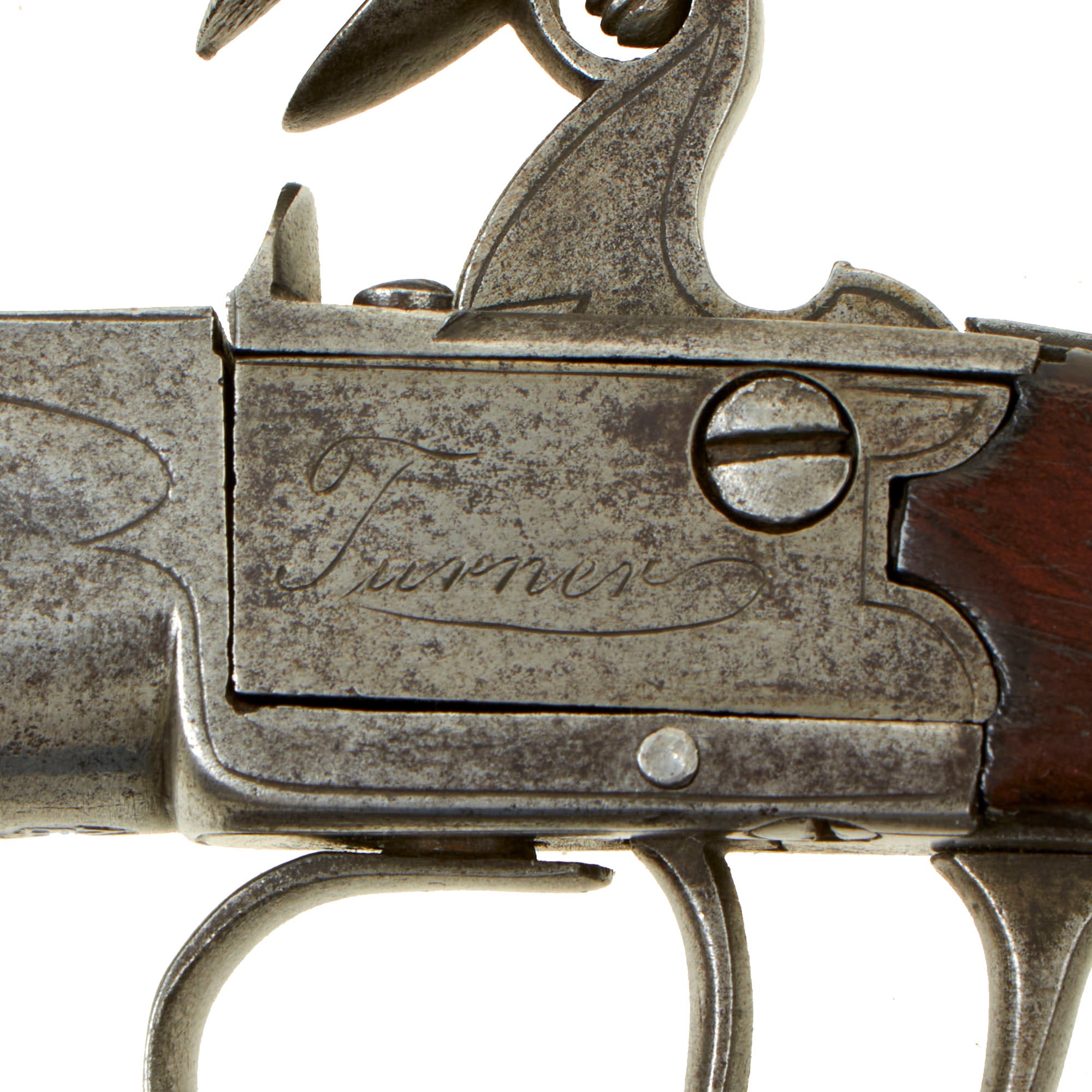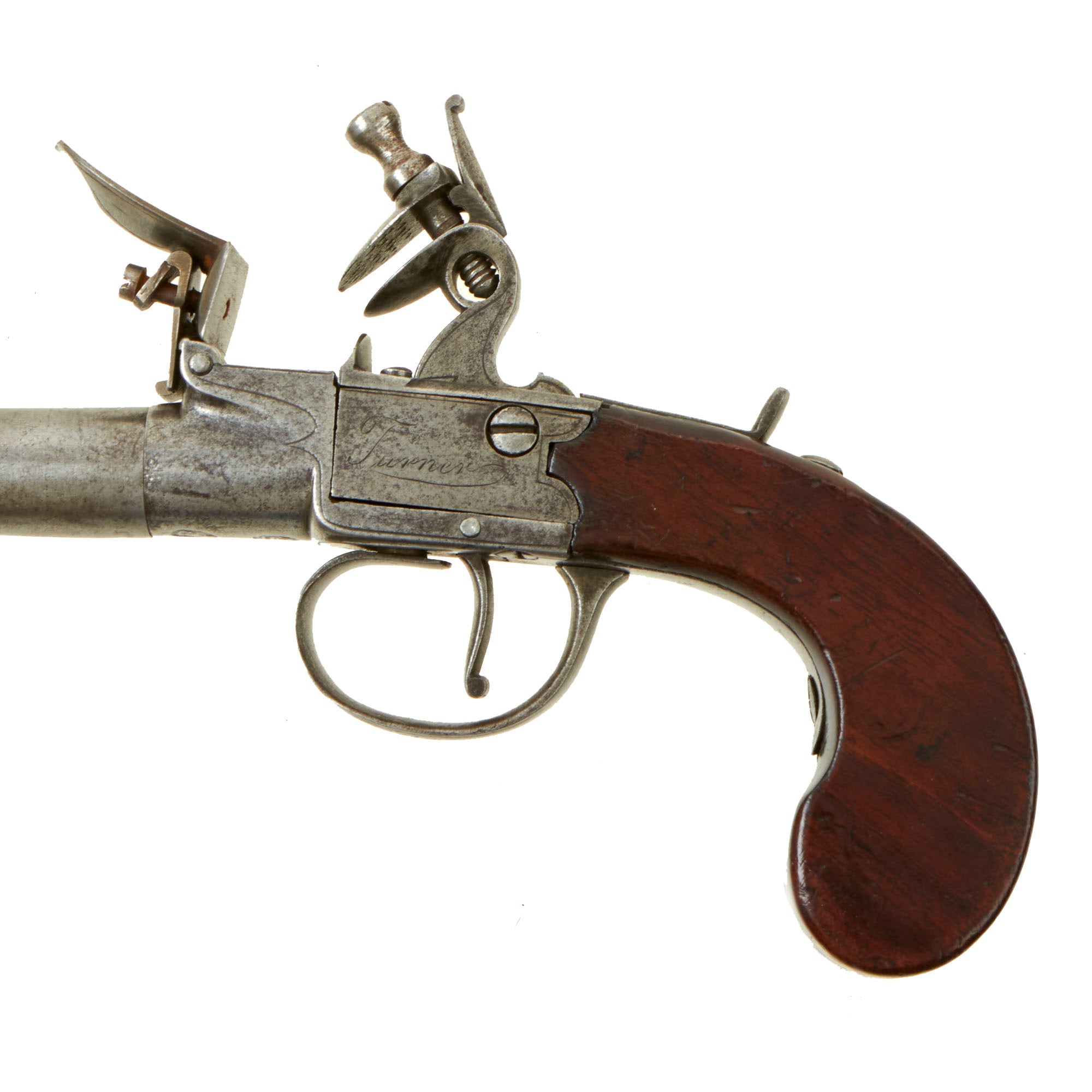 Original Item. Only One Available. This is a lovely iron framed "box-lock" style flintlock pocket pistol dating to approximately 1780, and marked clearly on the lock plates with Turner on the left and London on the right. Turner is listed as working in London from 1770 to 1785, though not much else is known about this maker. Other examples of similar single and double barrel pocket pistols have been seen with the same markings.