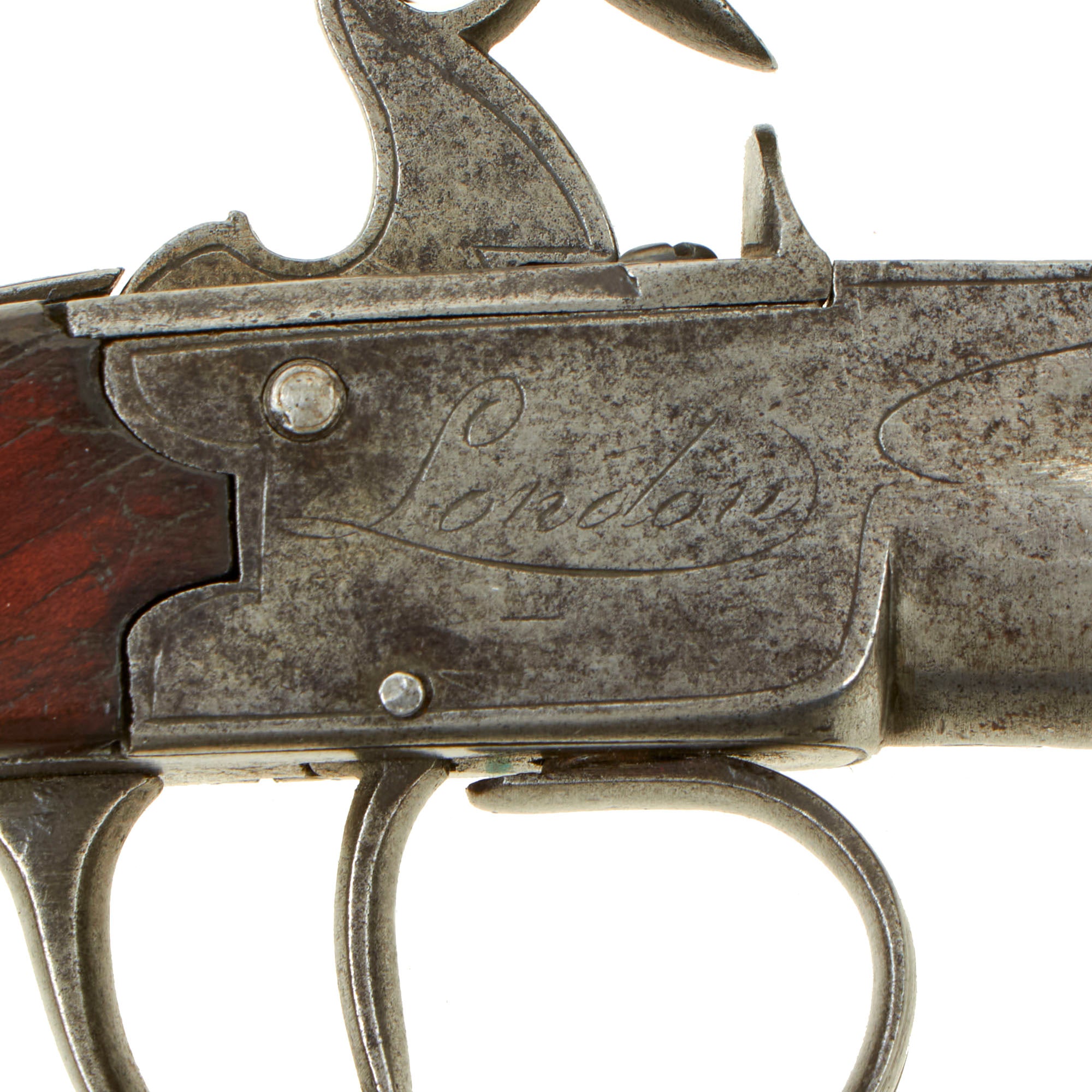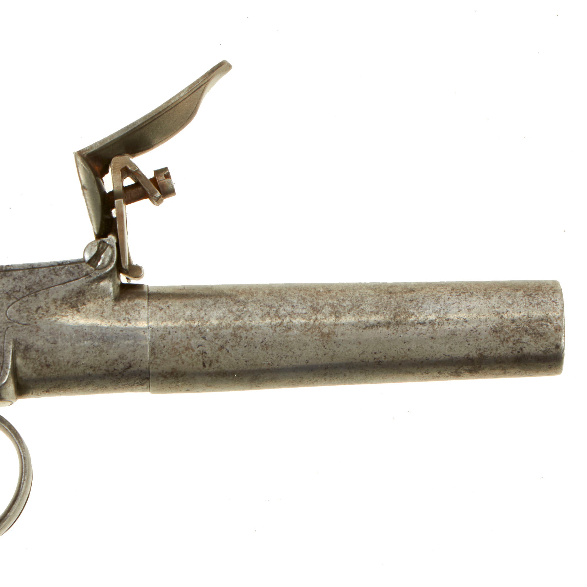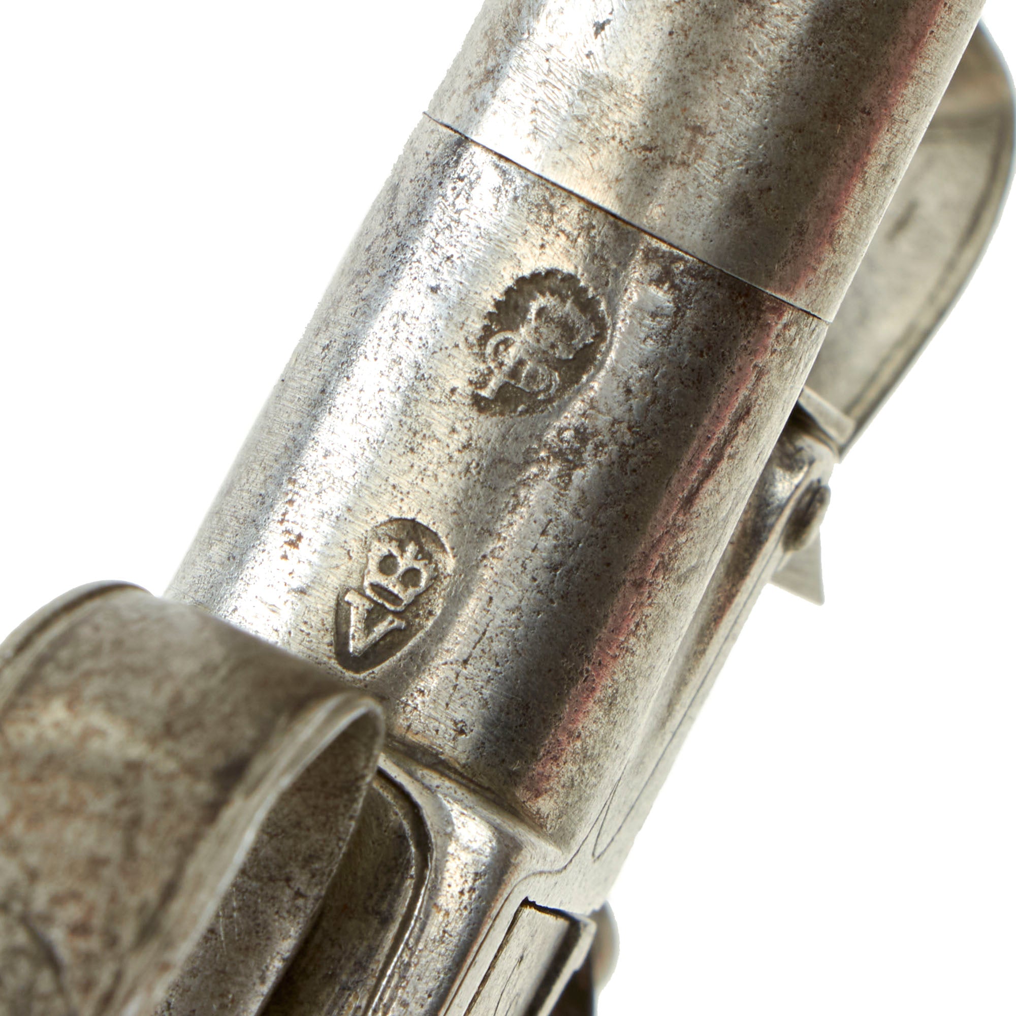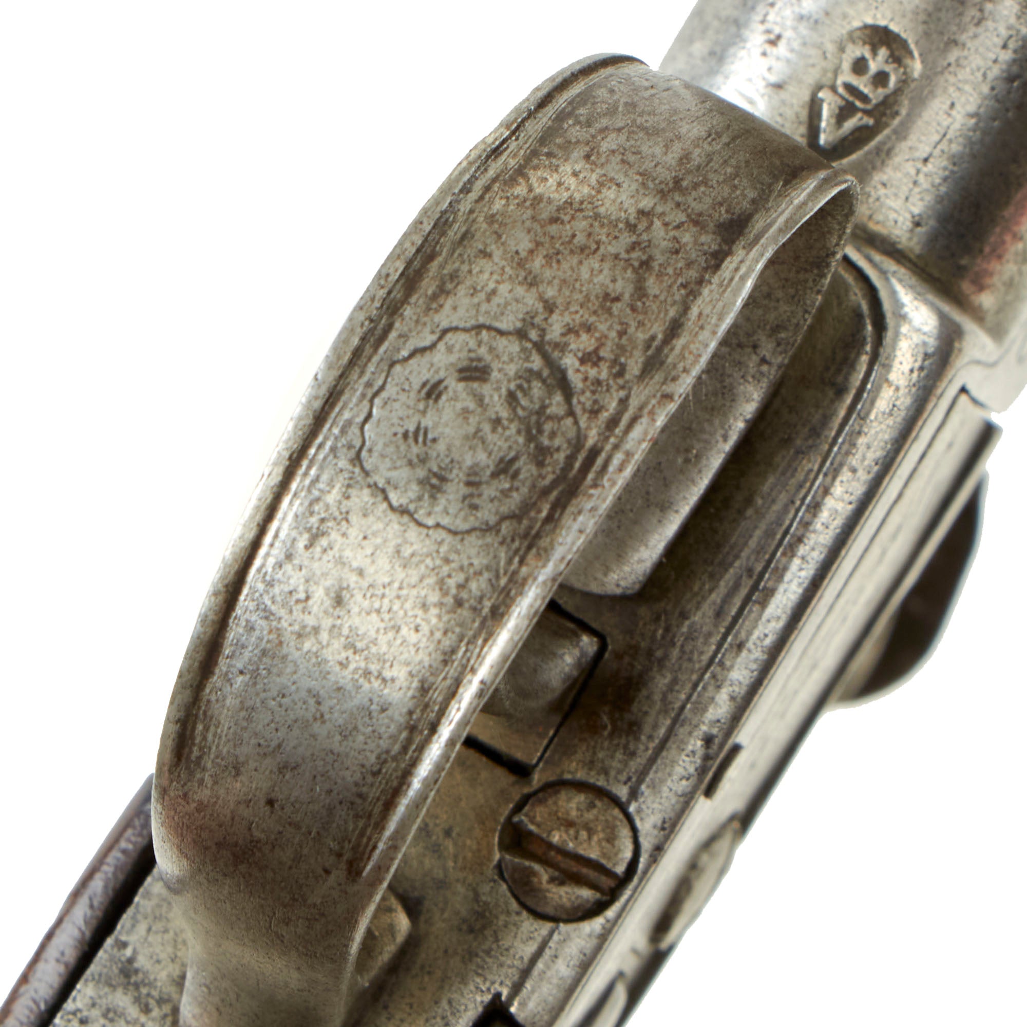The weapon measures 6 3/4" in overall length with a screw off 2 1/2" smooth bored .44"cal iron cannon barrel, which in very good condition, showing signs of light to moderate use. Unfortunately as with most we see the screw joint is seized at the frame, and it cannot be removed. The bottom of the action bears London proof marks: the CROWN / GP "Gunmakers" black powder proof and CROWN / V "viewed" marking.