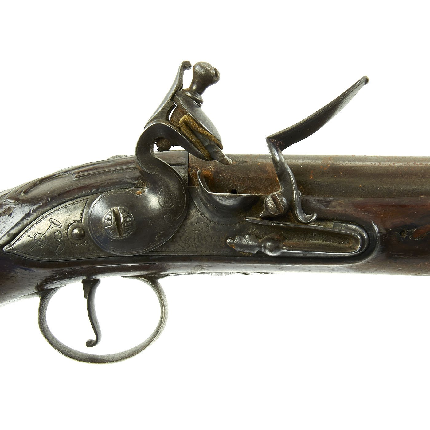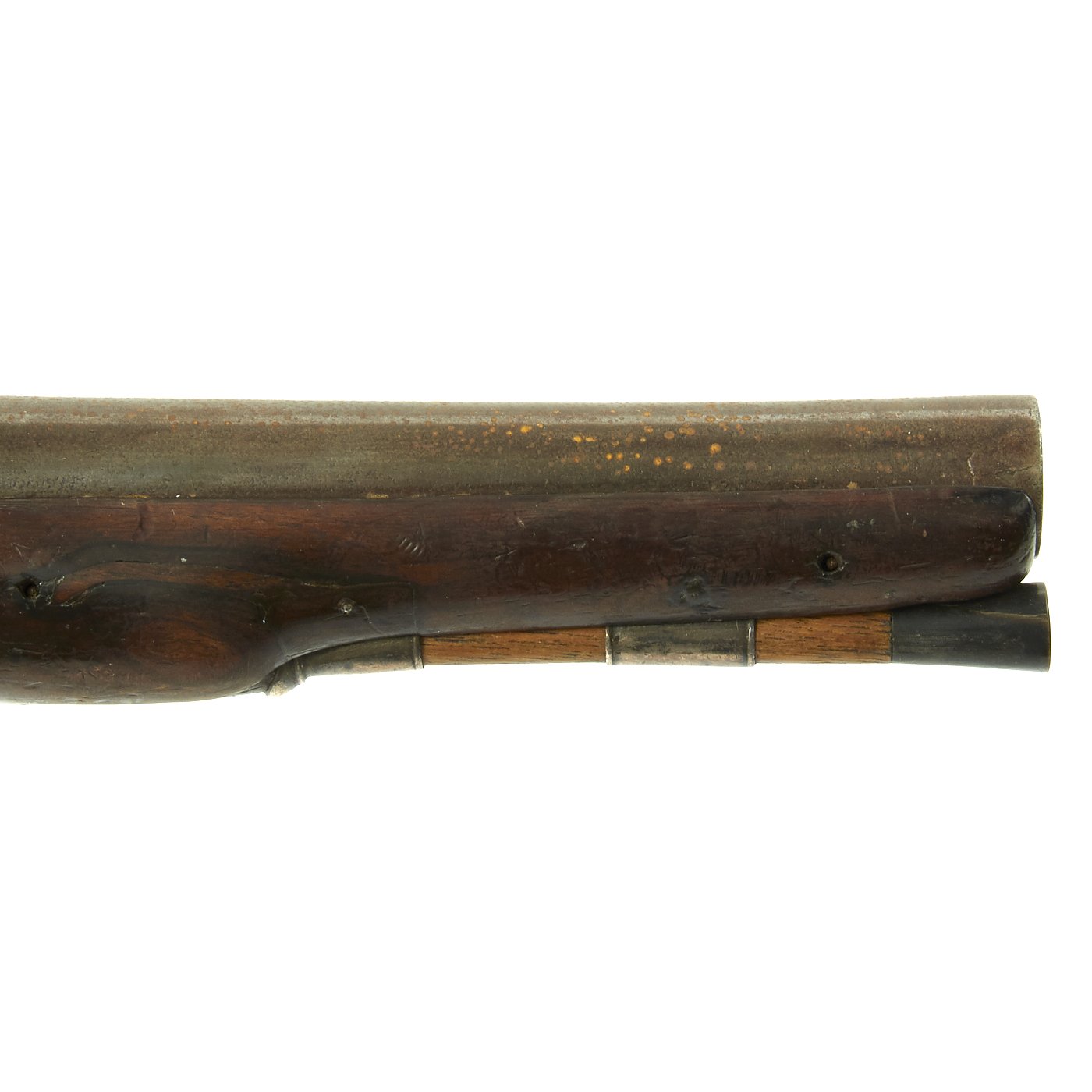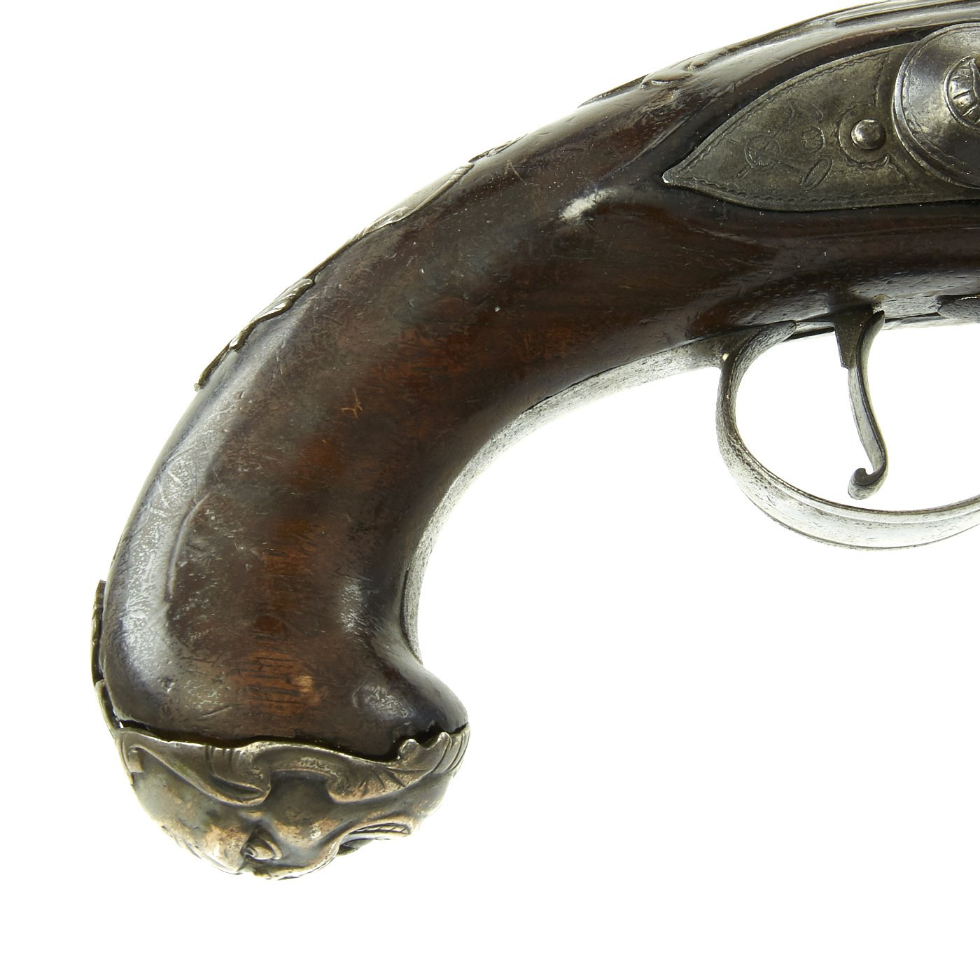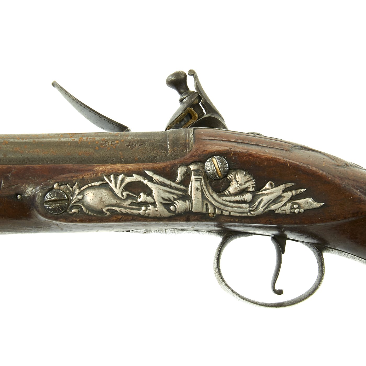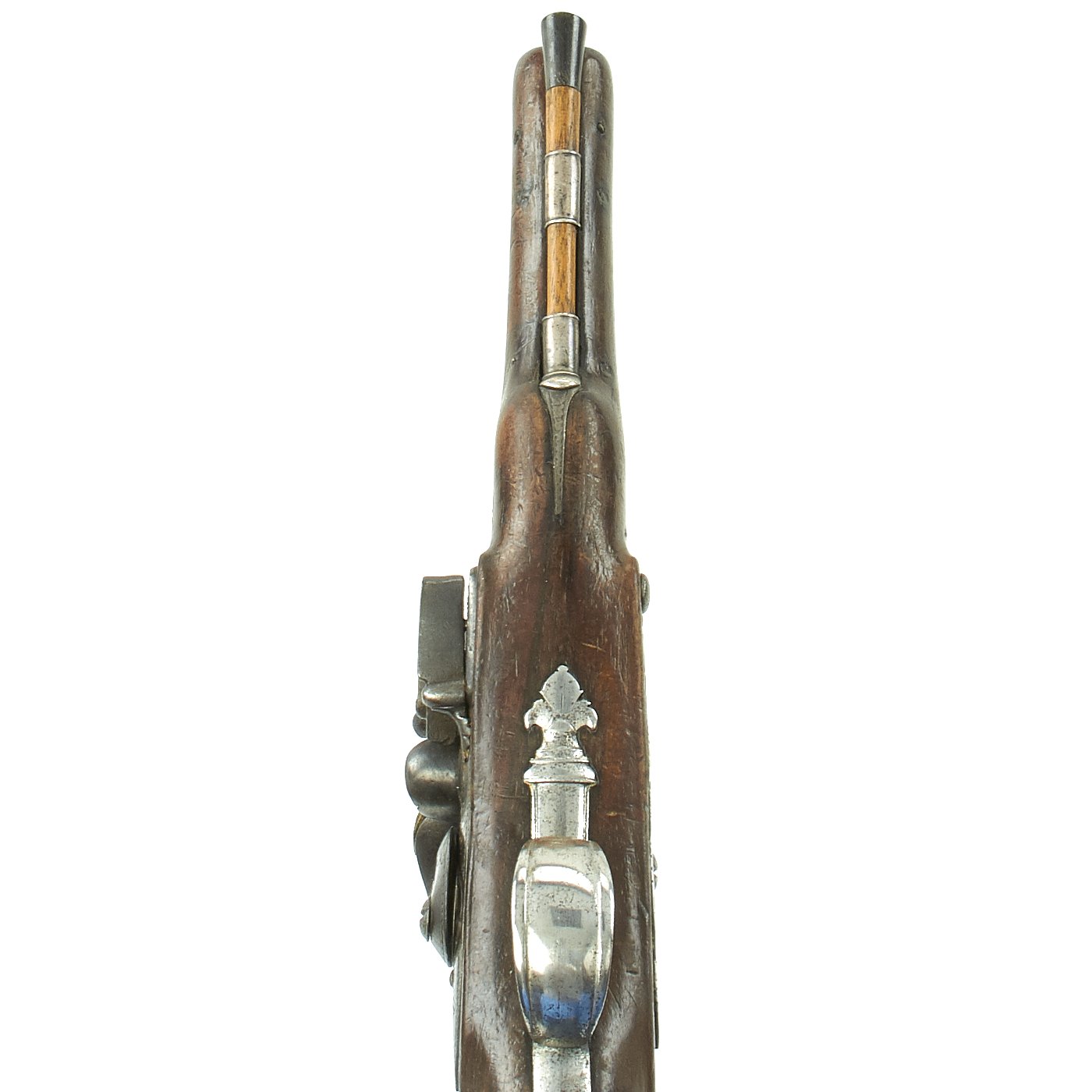 There is no bridle on the powder pan, indicating early production, certainly pre-revolutionary war. Most likely it was made during the French and Indian war period 1756-1763. The pistol is full stocked in walnut, with high quality silver mounts showing military themes, and a grotesque mask on the butt cap. It still retains its original horn tipped ramrod with the screw charge extractor on the end. The lock functions correctly, holding at half cock, and firing at full.