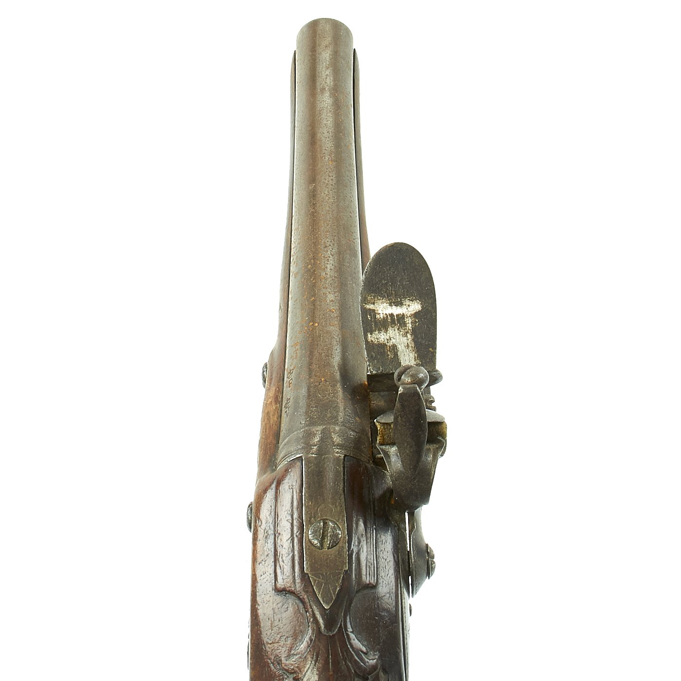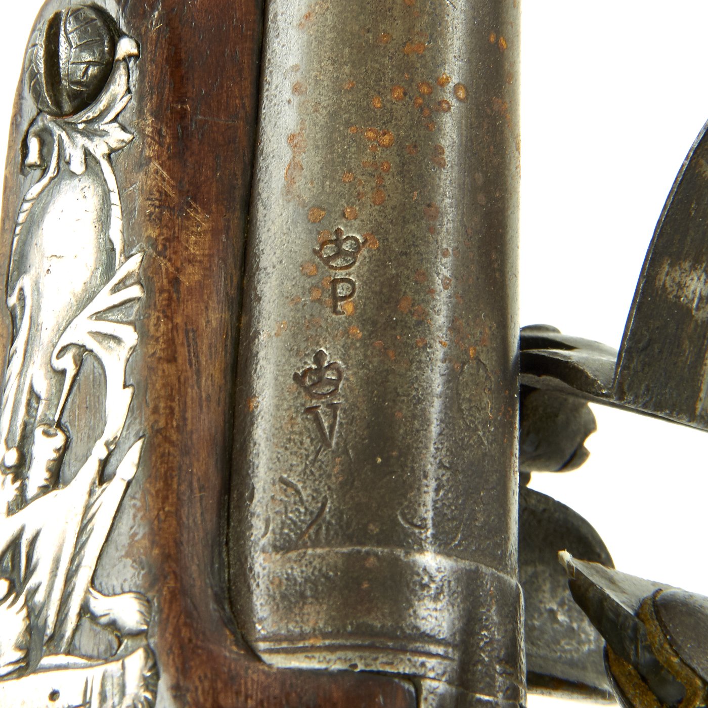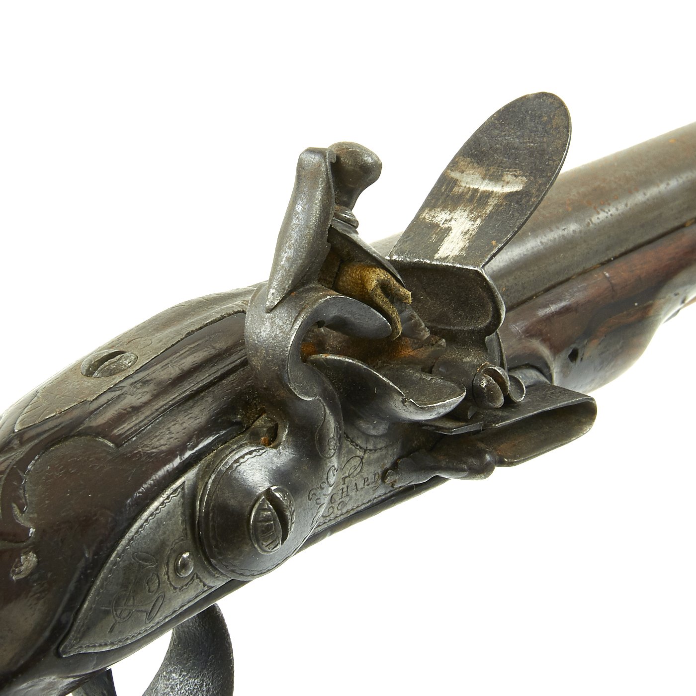 Original Item: Only One Available. John Richards started with a shop in the Strand in London, followed by a Shop in the Midlands city of Birmingham 1745 and the business continued for two generations until 1810. This fine example of his early work is a very nice Officer's or Gentleman's pistol, fitted with a 7" iron barrel and 11 1/2" in overall length. All of the fittings are silver, and it really is quite attractive. The lock is marked RICHARDS under the pan, and the barrel has the Crown / P and Crown / V London proof marks, signifying "proved" and "viewed".