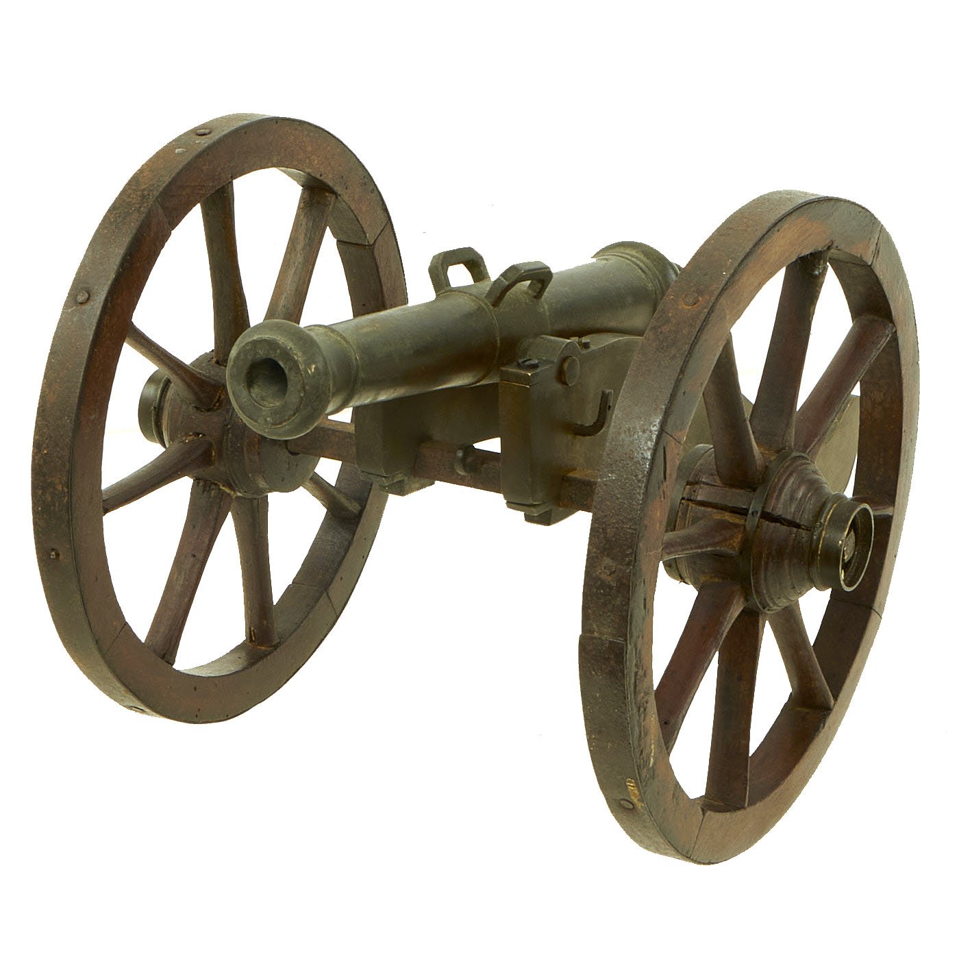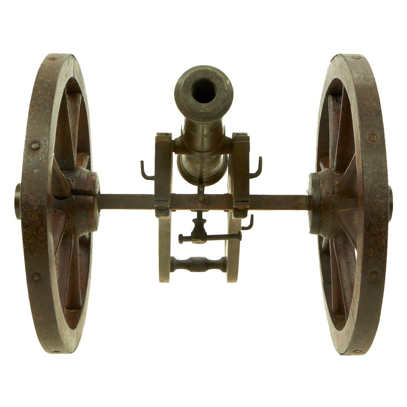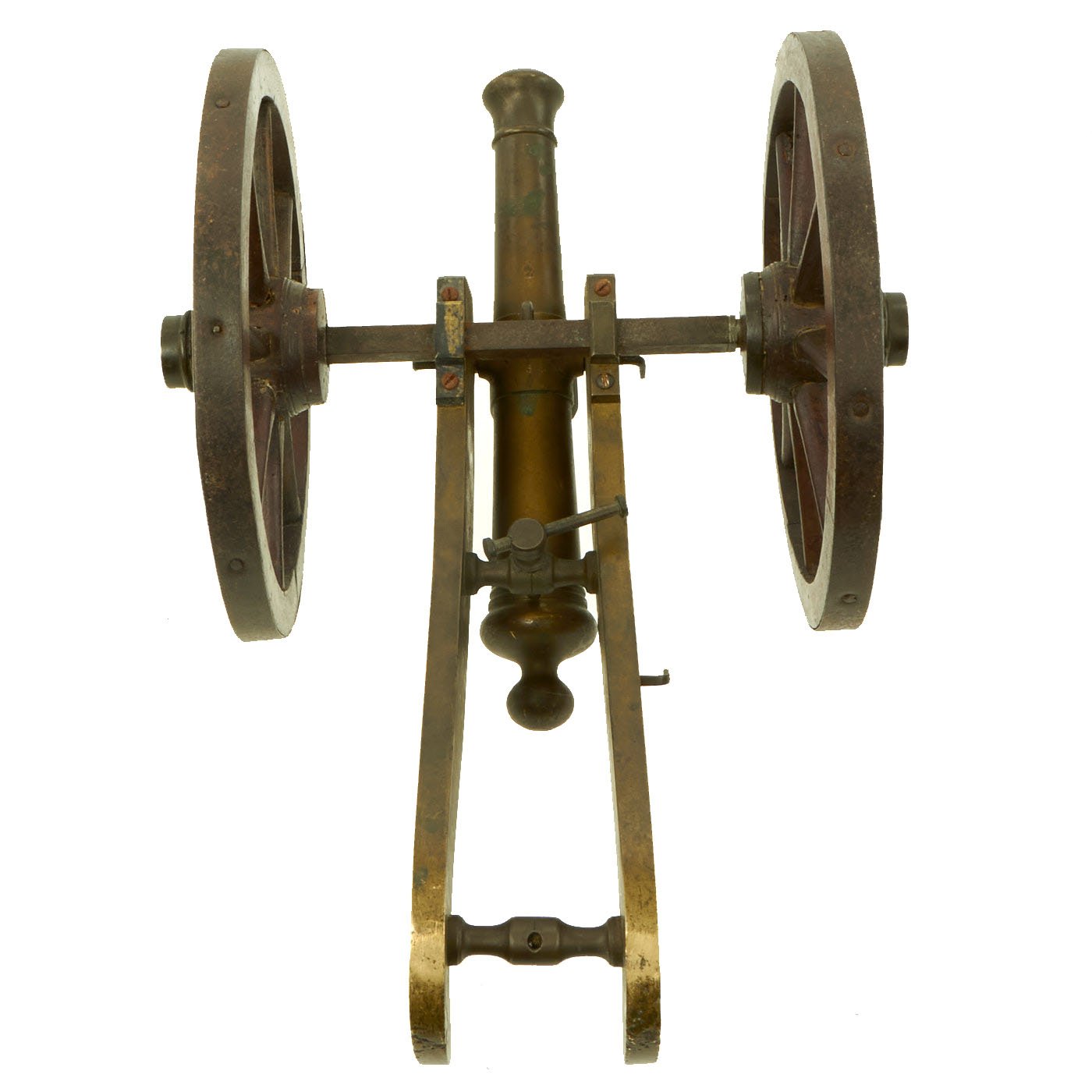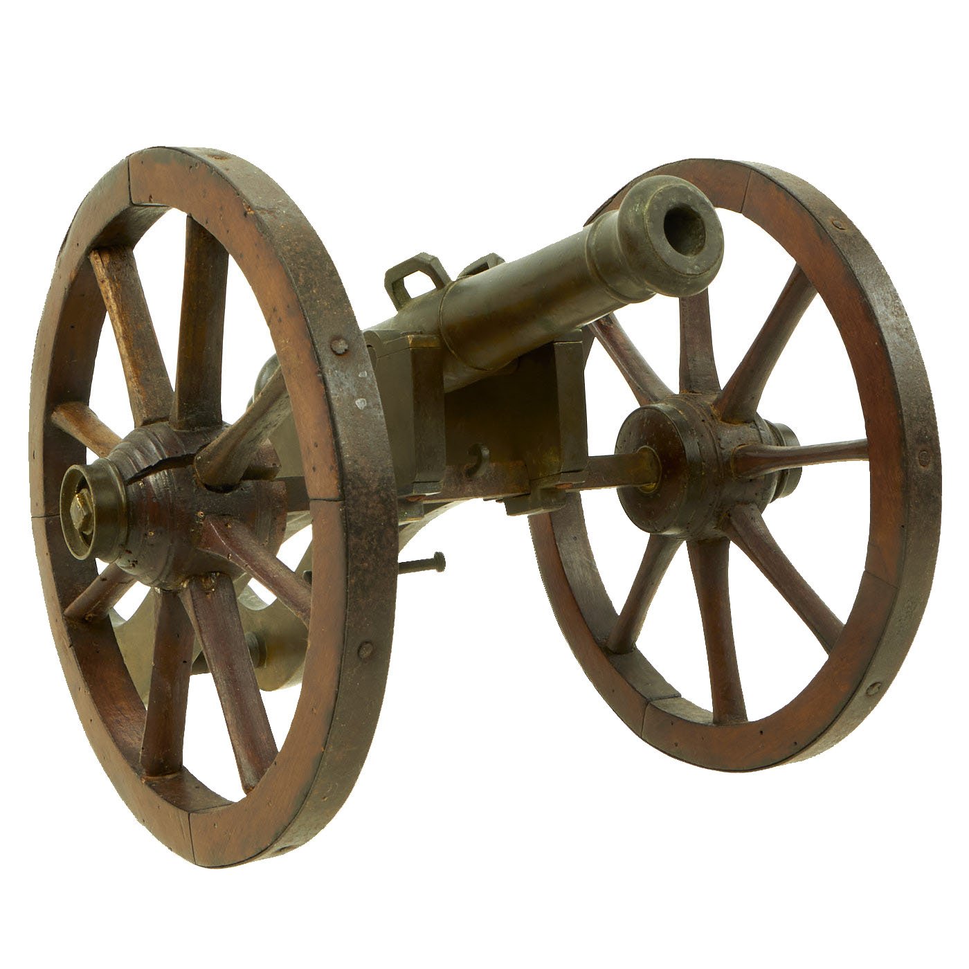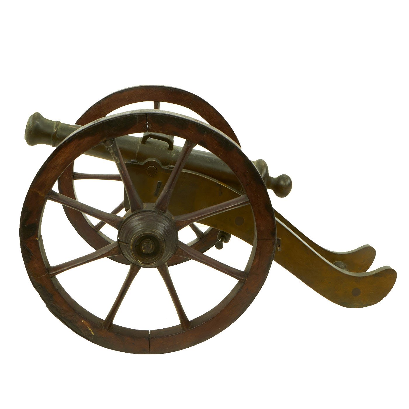 Original Item: One of a kind. This is a fantastic British model field gun from the Georgian Era, probably produced about 1820. It features brass cannon barrel measuring 11 1/4", mounted on its 18th century style split trail field carriage, all in brass, with iron axles. It measures 16 1/4" overall length and hub to hub 11 1/2" in width with elevating gear. Complete with 9" tall spoked walnut wheels, eight spokes to a wheel.