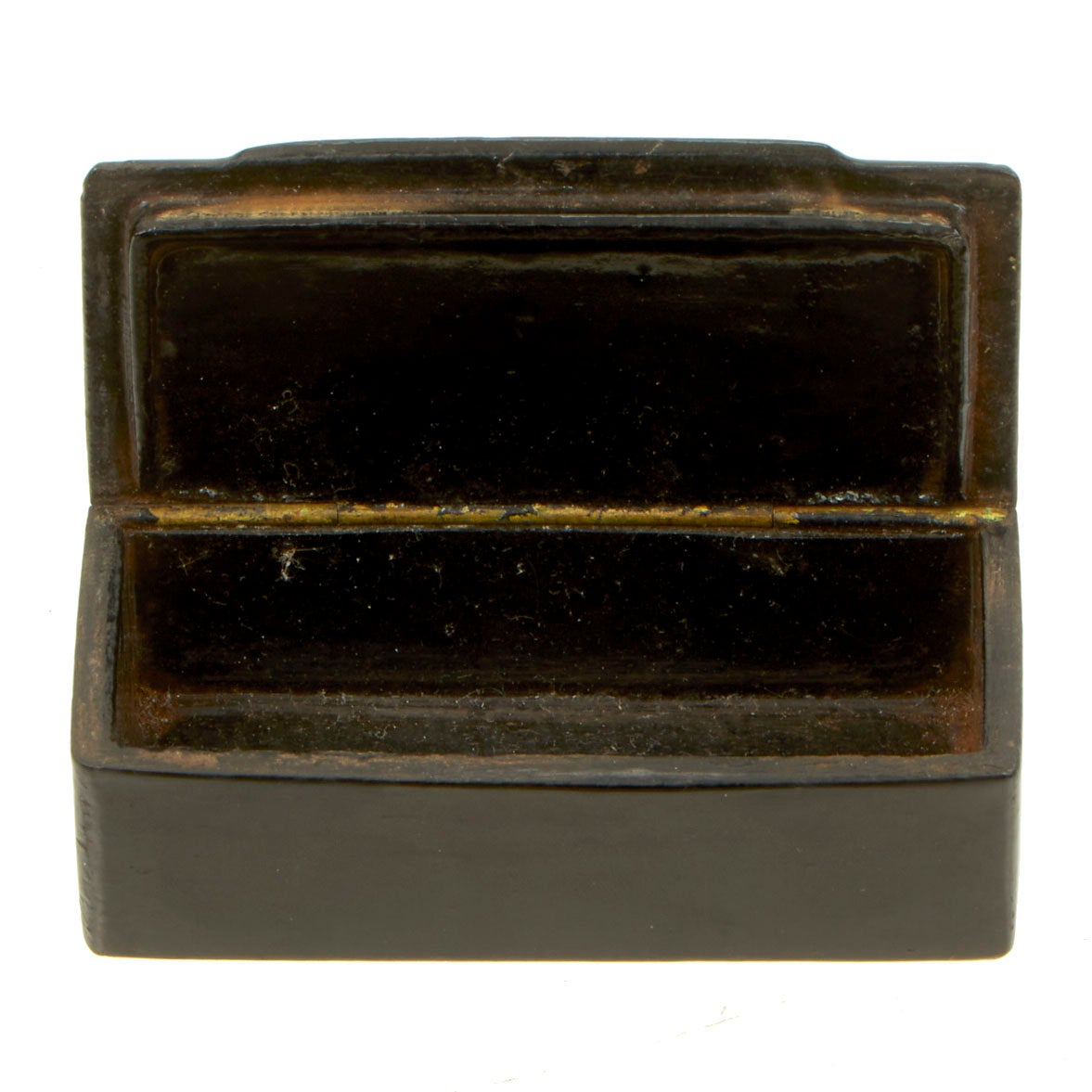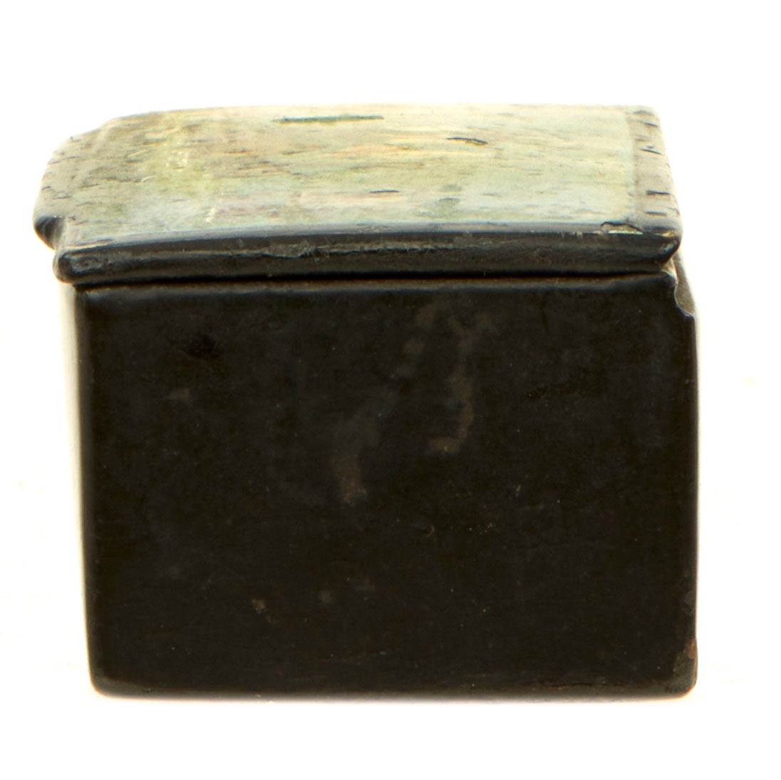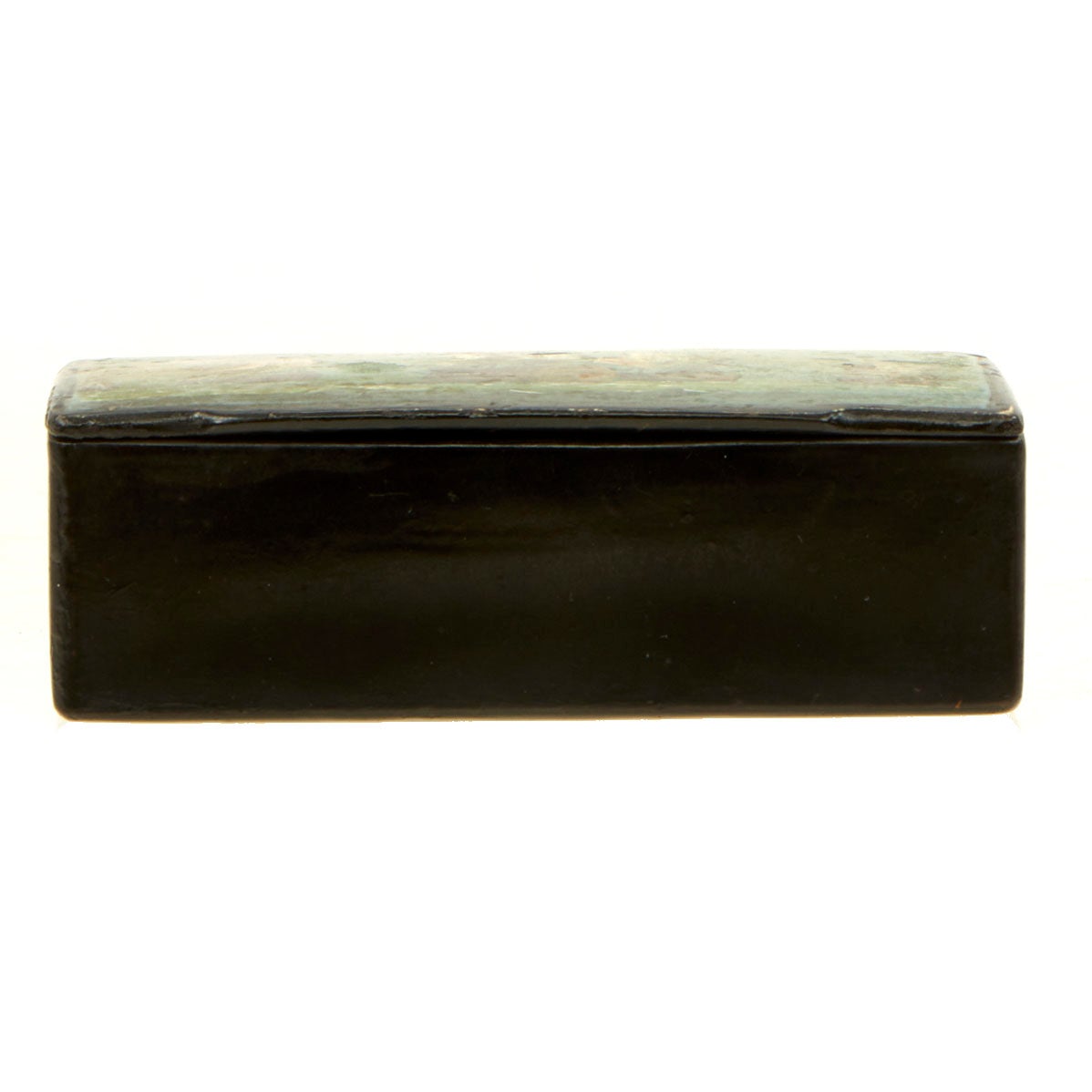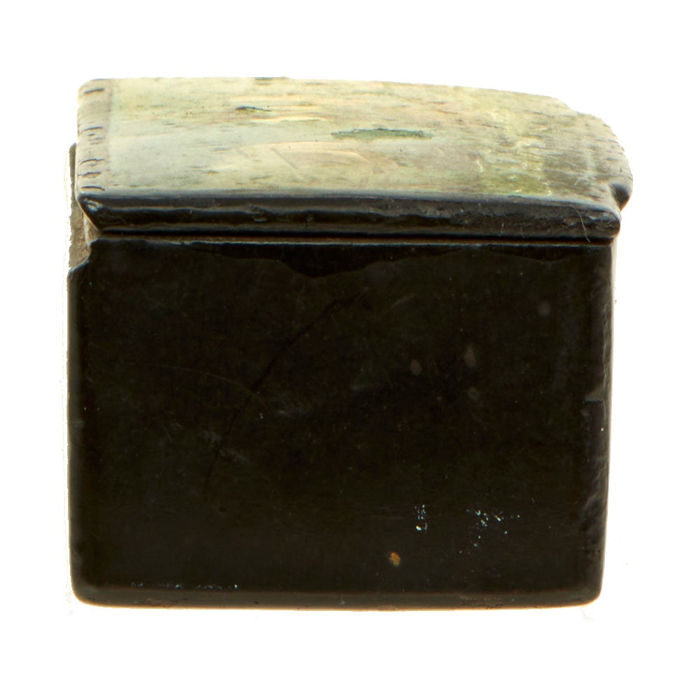 The papier mâché box was used to store snuff, tobacco that is snorted or inhaled through the nose. Snuff, a powdered form of tobacco, was popular in the 1700s and 1800s for its stimulating nicotine boost and was also believed to help relieve common colds and stop snoring.