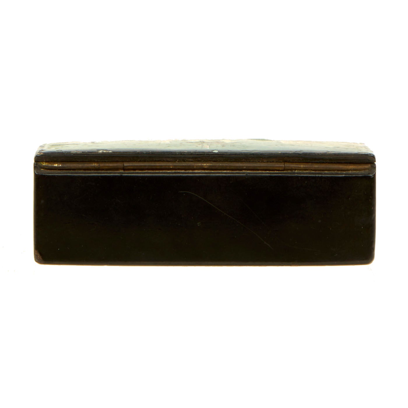 This 3 ¾” x 1 ½” x 1” box we believe could have very likely been owned and used by a Royal Navy Officer of the British Empire. The top of the lid has a very beautiful Naval battle scene being fought between 5 ships, one of which appears to be the HMS Victory. The position of the flags, sails and rear of the ship is almost identical to the HMS Victory in physical appearance as well as old artwork of the Victory.