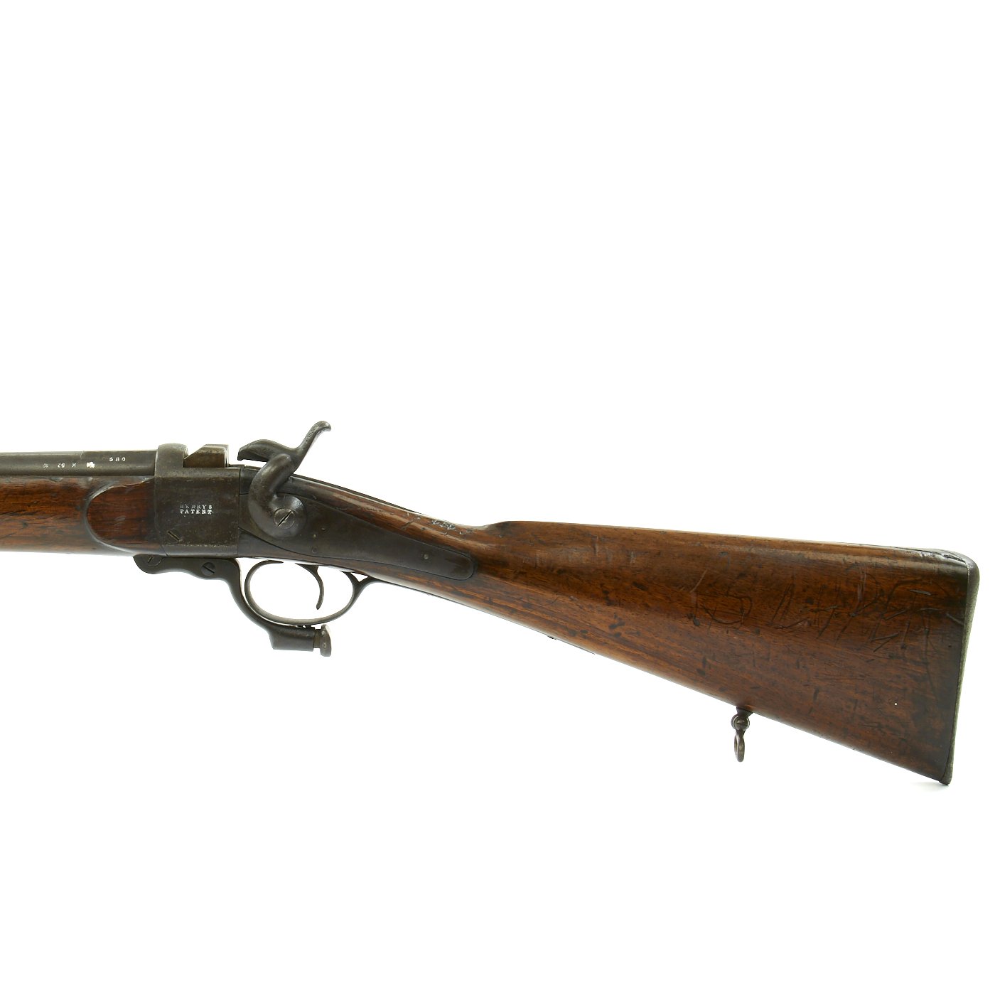 Here we have an original Henry's Patent single shot rifle featuring its external hammer on the left side so as not the interfere with the reloading using a "falling block", system activated by a lever directly under the trigger guard. The rifle is marked HENRY'S PATENT on the left side of the frame, while the right side has the maker and date information: