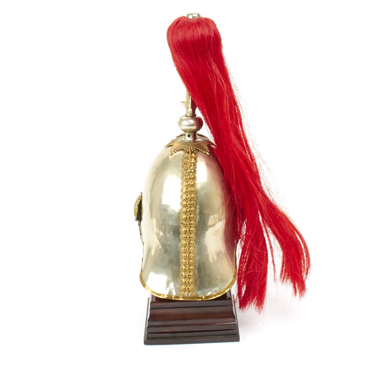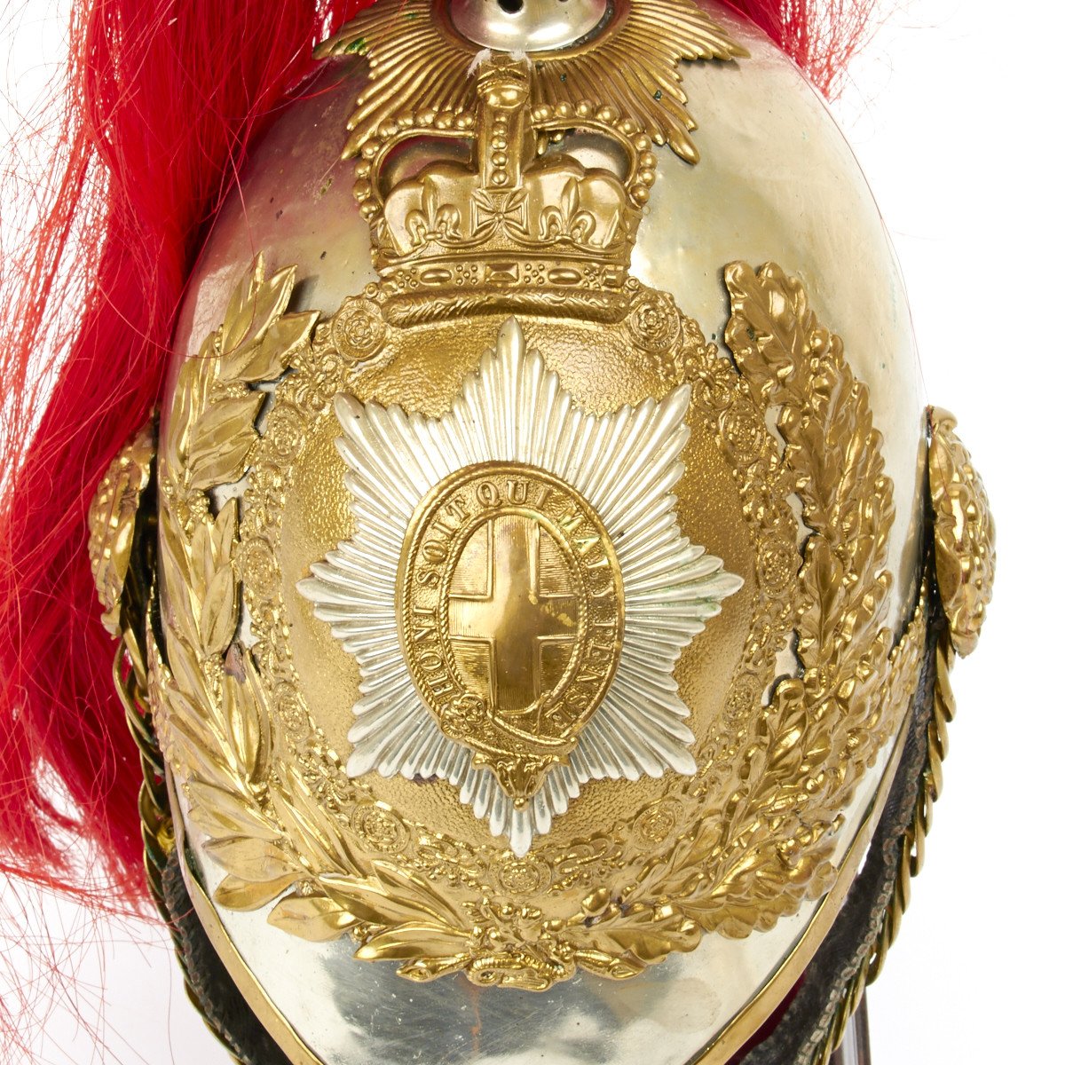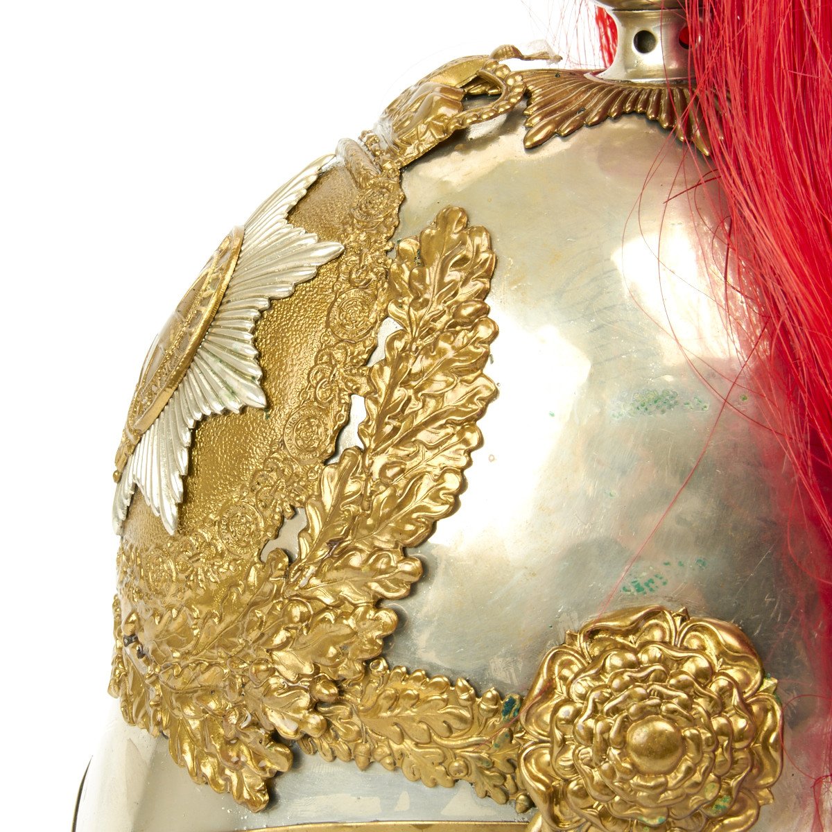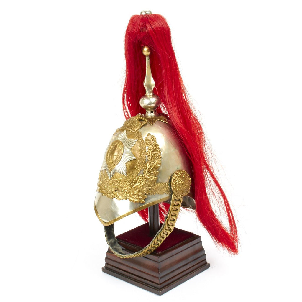 This is an absolutely genuine original British Horse Guards parade helmet and comes complete with the original leather liner, ringed chin scales and red dyed genuine horsehair plume. The helmet plate displays the "Queen's Crown" indicating military service after 1952. The helmet does show use and long time neglected storage and is in need of a good cleaning. No collector has ever owned this helmet as it came, after service, directly from military stores to our warehouse.