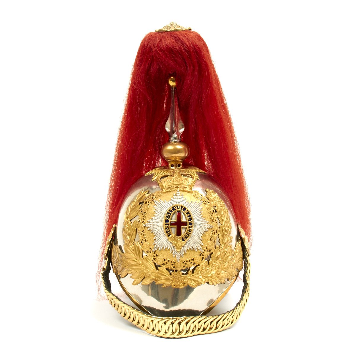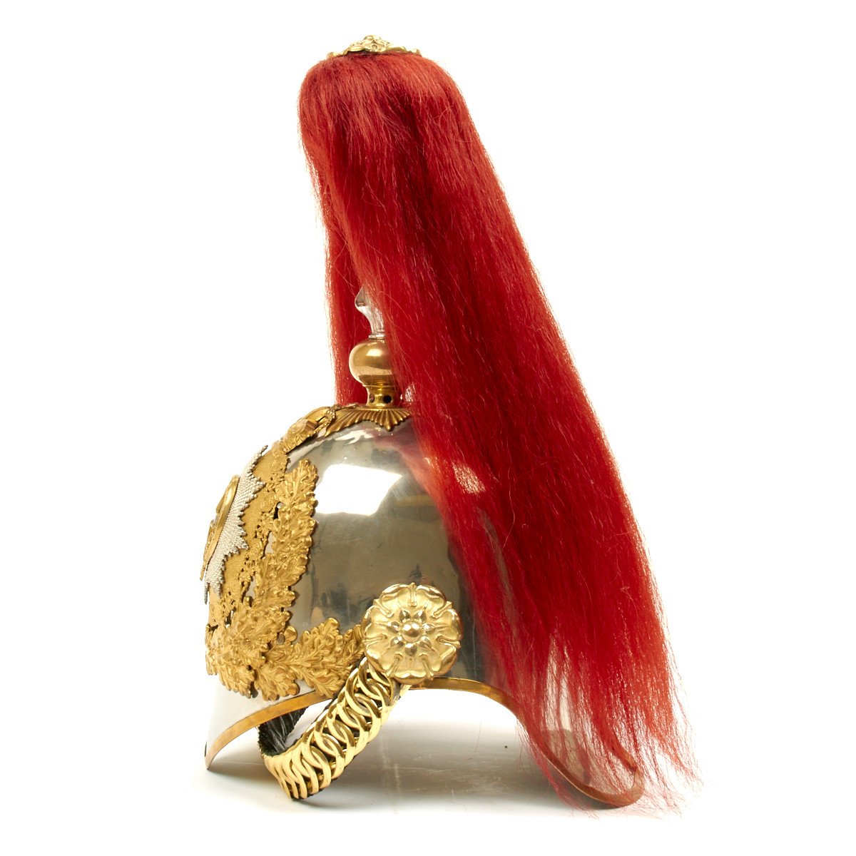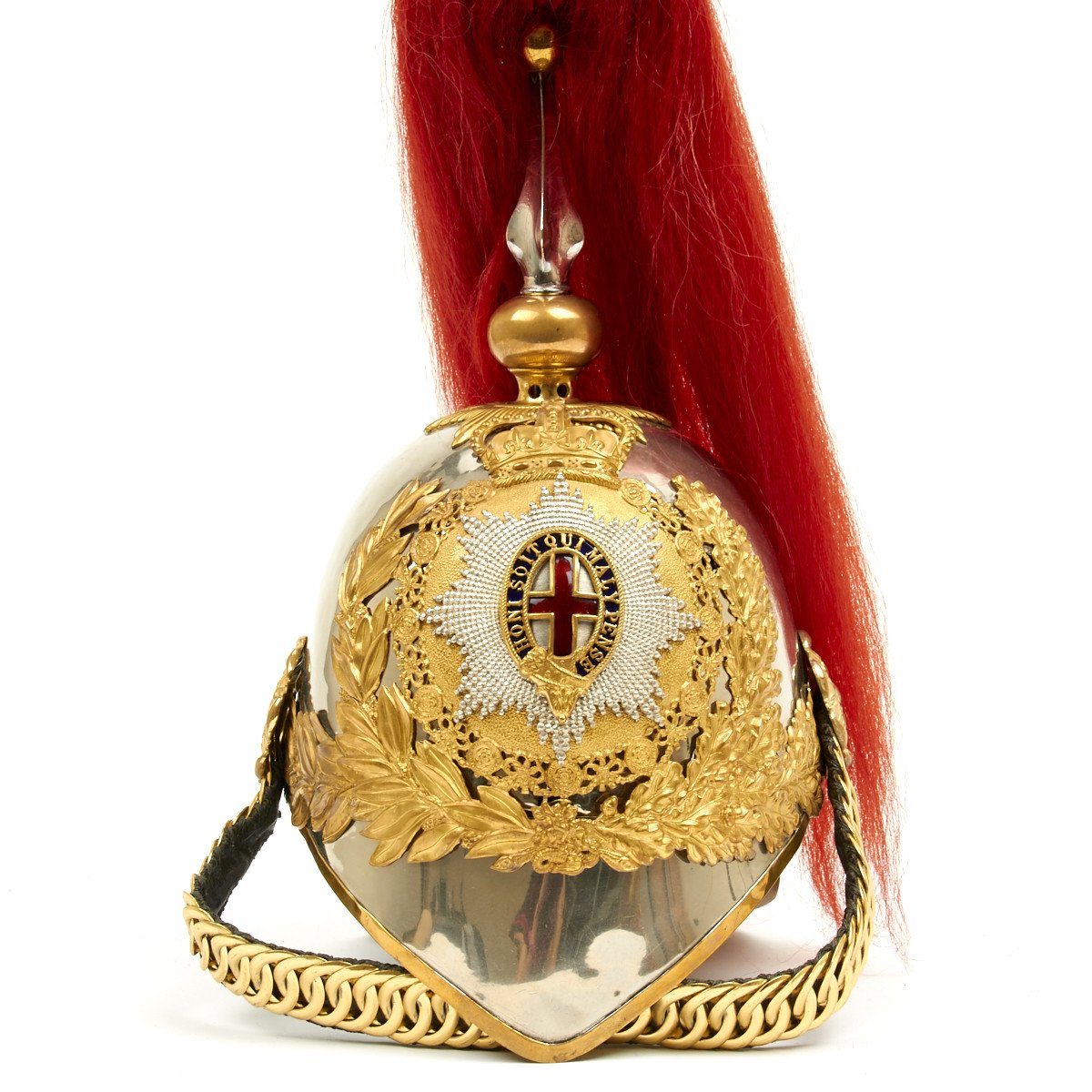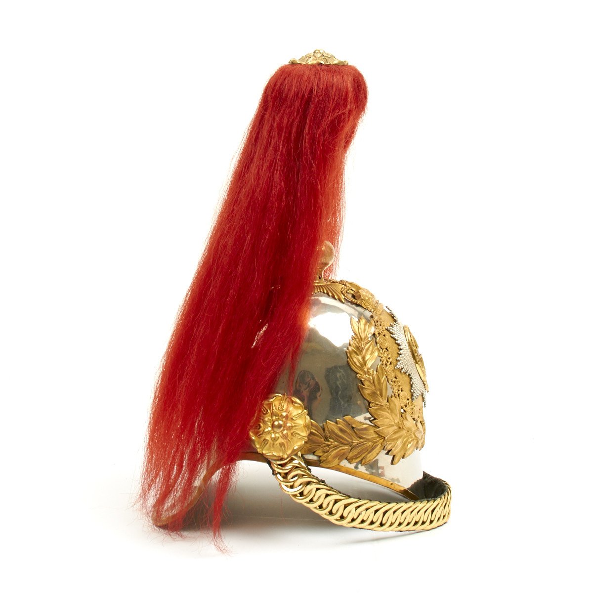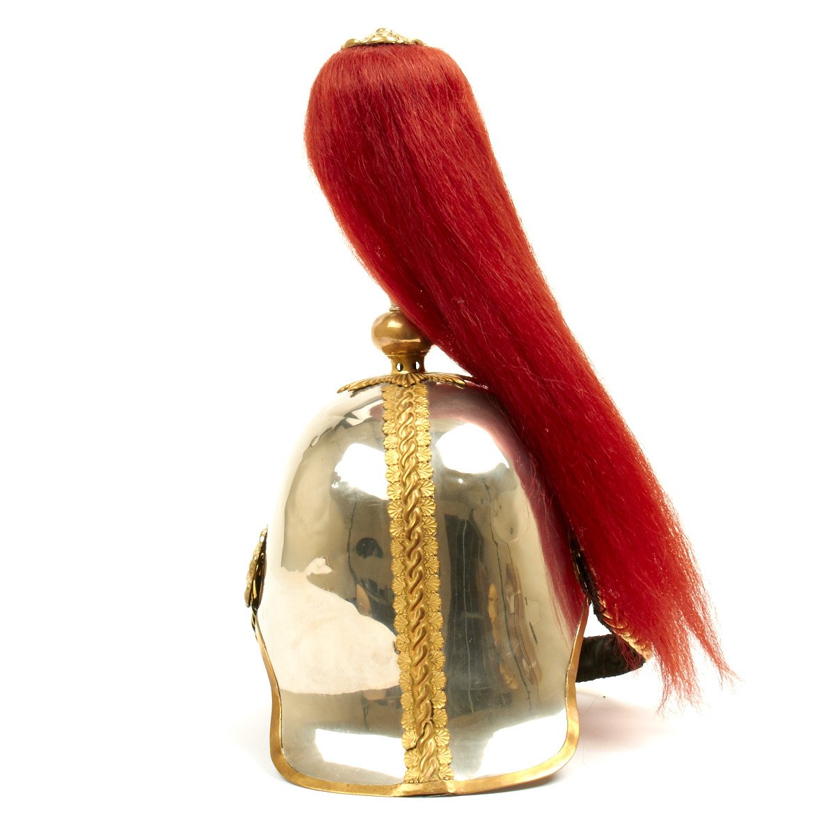 Original Officer gilt lined parade helmet with red yak hair plume. Only issued for the use of Horse Guard Officers, the helmet plume bears a "Rose" finial to the top unlike that of the Life Guard's which has a gilt round button to top with White horse hair plume