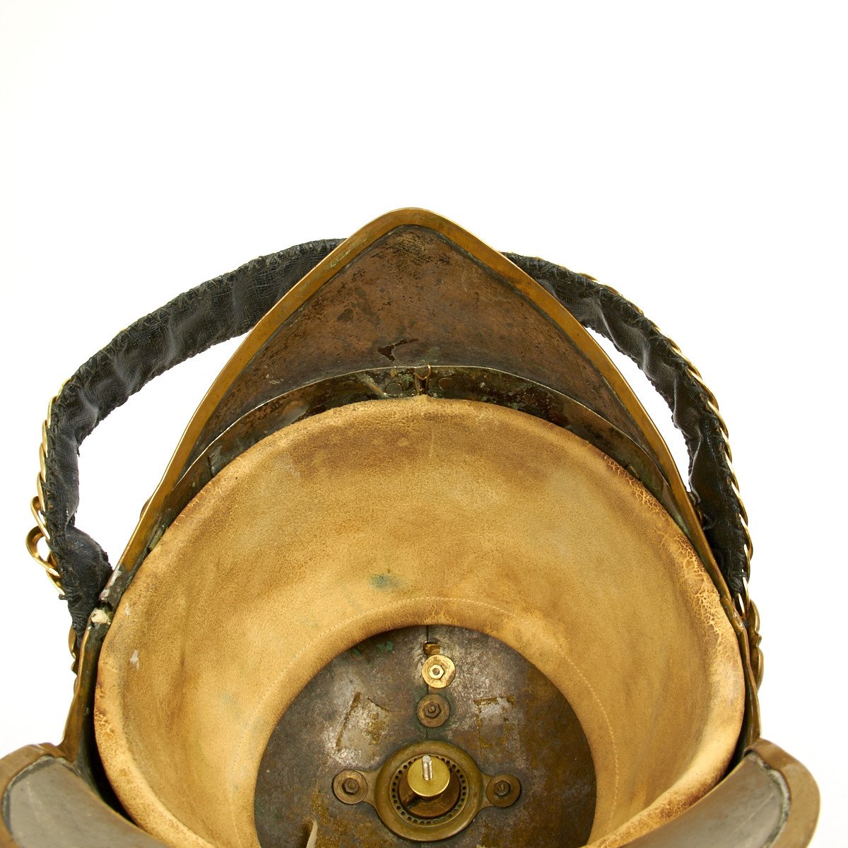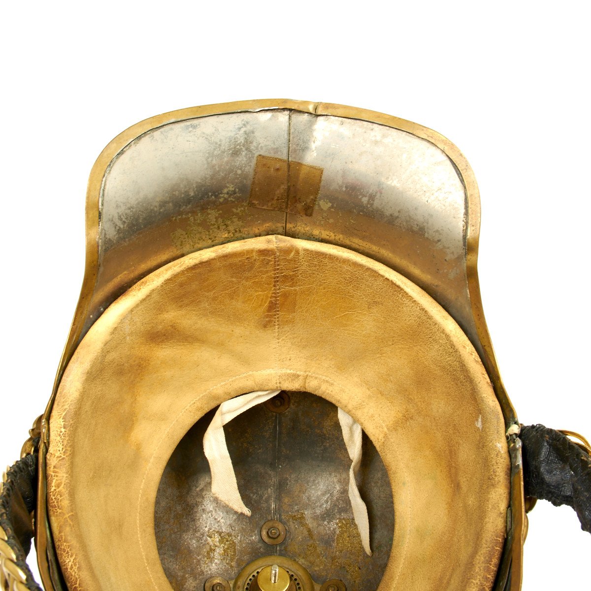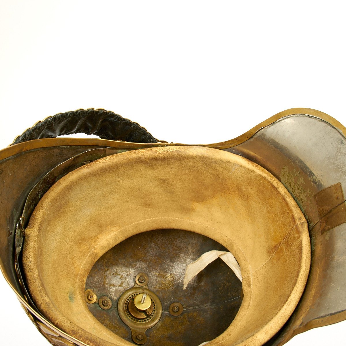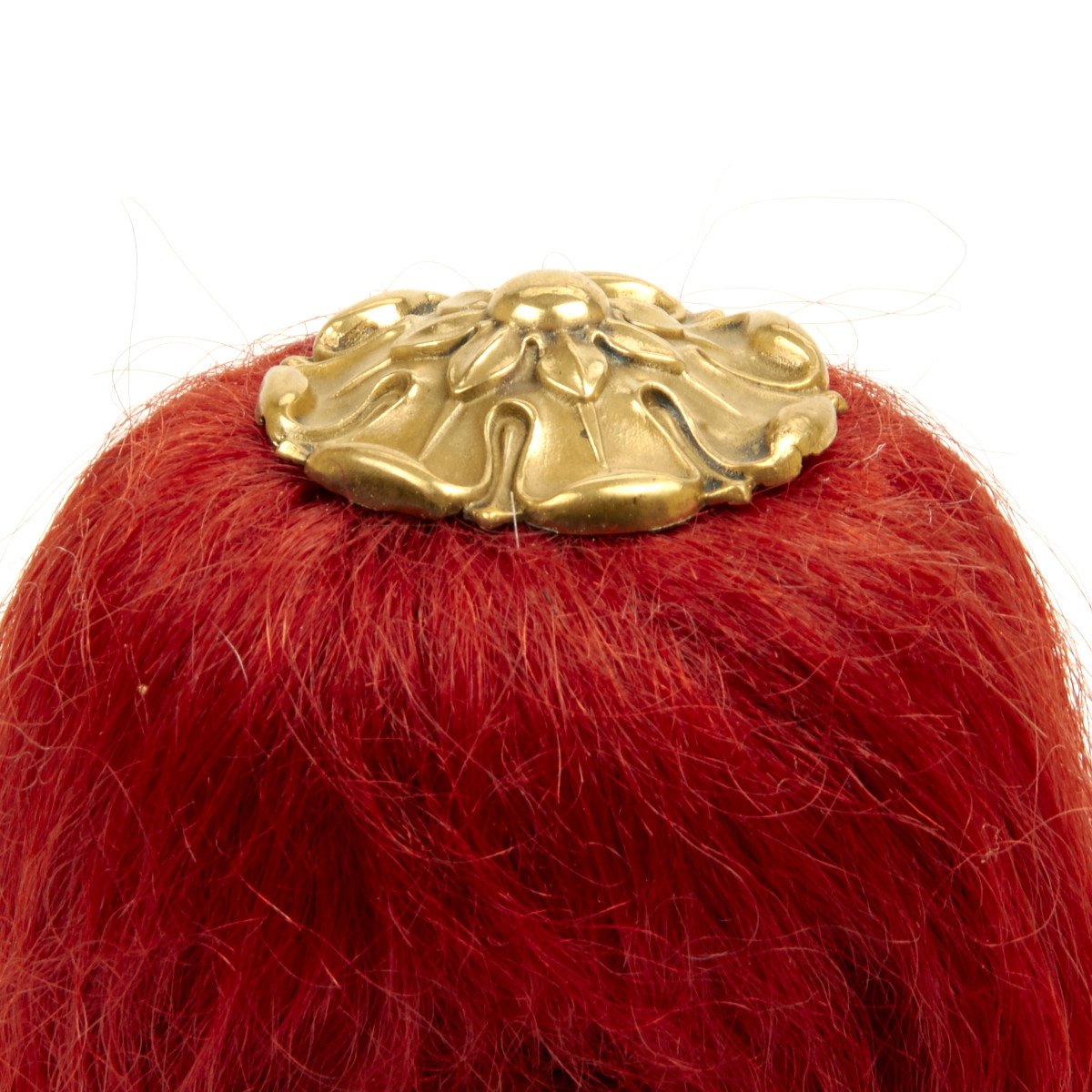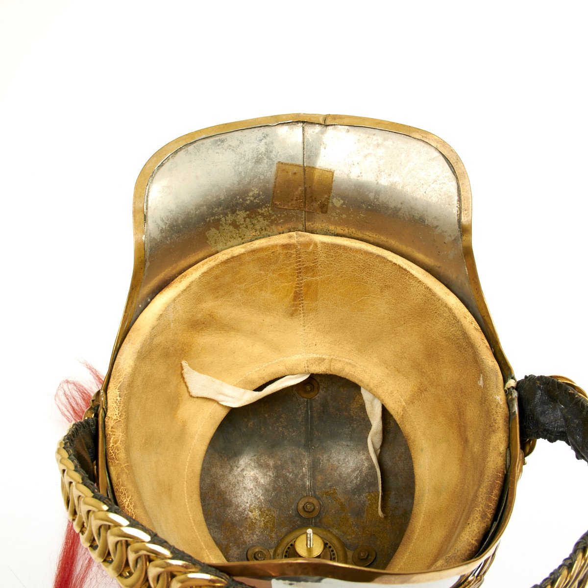 Original Officer gilt lined parade helmet with red yak hair plume. Only issued for the use of Horse Guard Officers, the helmet plume bears a "Rose" finial to the top unlike that of the Life Guard's which has a gilt round button to top with White horse hair plume