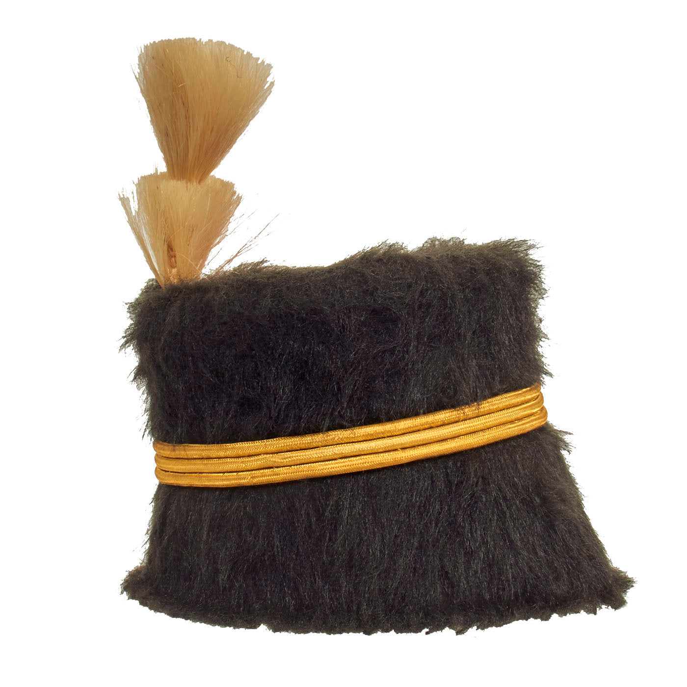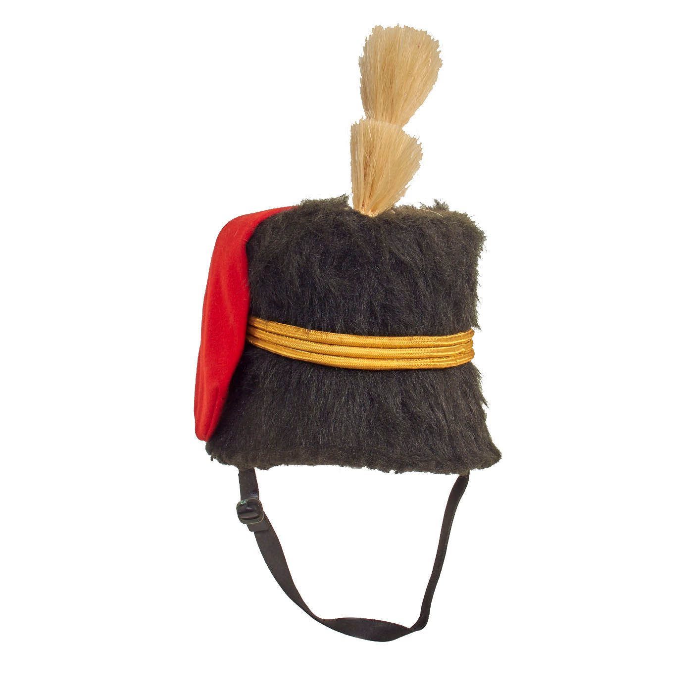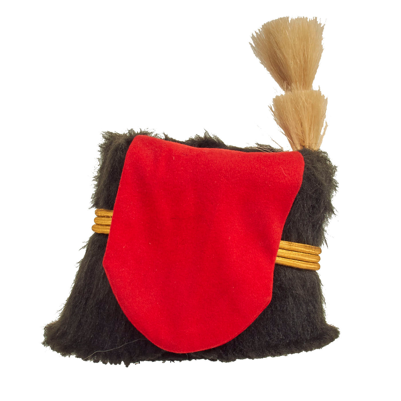 Original Item: Only One Available. This is a very beautiful genuine synthetic fur bearskin Busby used by the Royal Horse Artillery, and has been ever since the infamous “Charge of the Light Brigade” in the 1850s. The helmet is complete with the symbolic right side “Red Bag” and yellow/gold cord surrounding, along with patent leather chin strap and white plume.